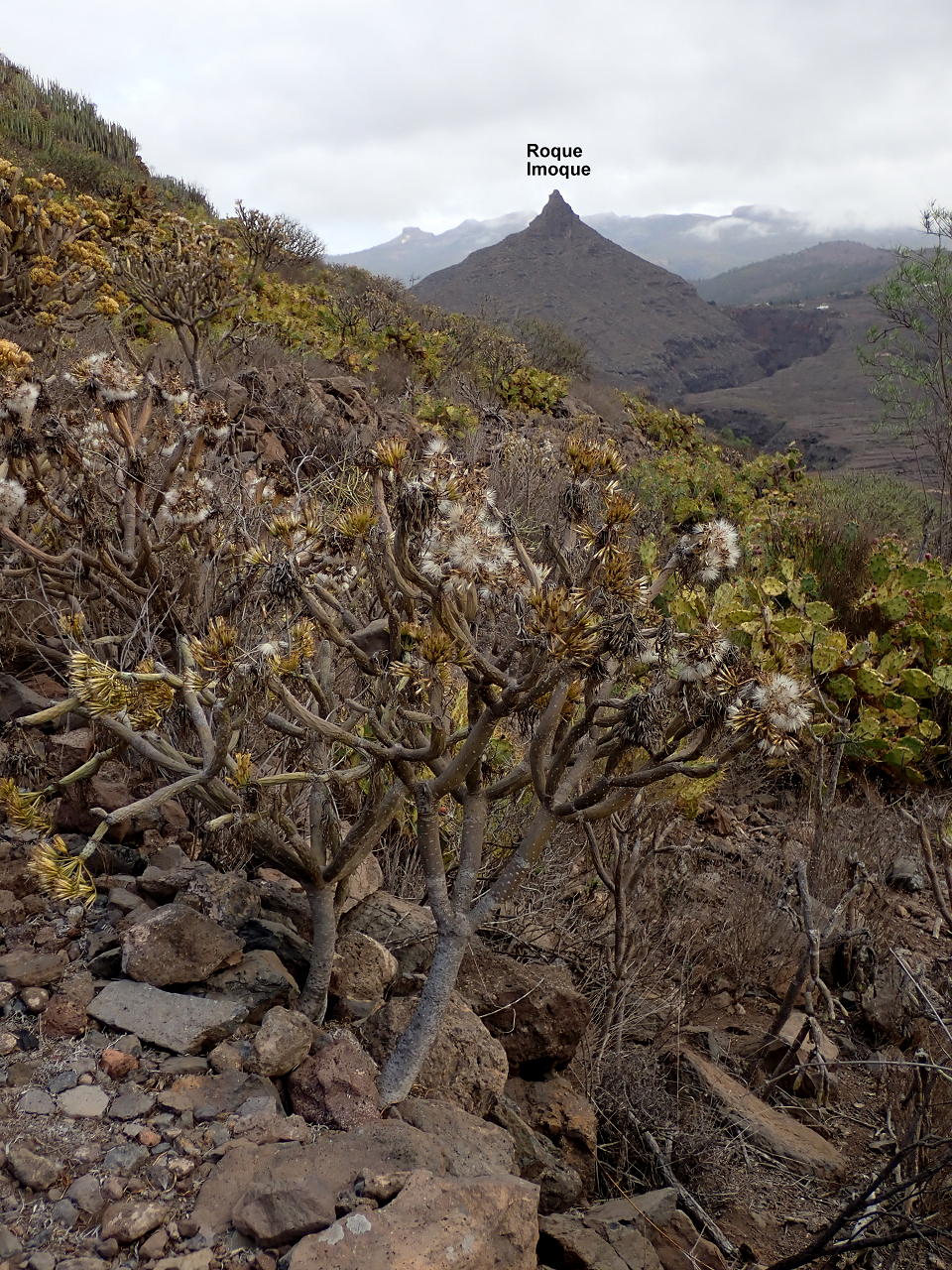 Nuestro recorrido se desarrolla entre barrancos, bancales antiguamente trabajados sobre abruptas laderas, impactante vegetación de tabaiba (Ephorbia balsamifera), cardón (Euphorbia canariensis) y chumberas o tuneras (Opuntia maxima). Las euforbias en zonas cálidas adquieren tallos suculentos y carnosos, recordando a plantas cactáceas. La mayor dificultad técnica es el ascenso a Roque Imoque, que requiere de unas trepadas delicadas por roca (quizás un paso IIº+). El recorrido de ascenso a ambos Roques es sumamente atractivo, pero el descenso por la orilla derecha del barranco Ancón es un poco monótono y con un paisaje muy humanizado y degradado.
