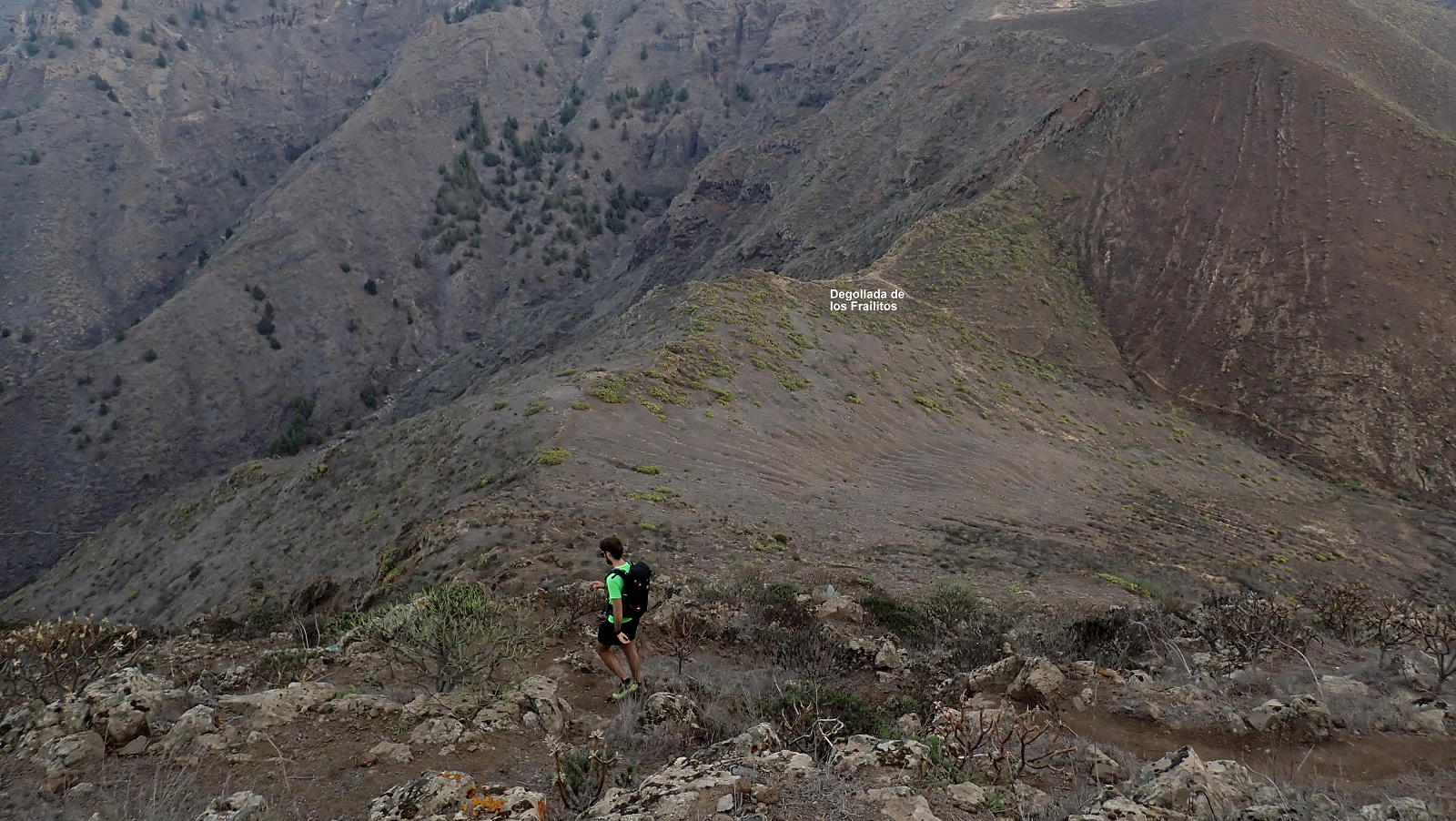 Descendemos ligeramente hacia el sur y tomamos a la izquierda lo que parece una senda vertiginosa pegada a la pared, pero termina bruscamente y vemos que un poco más abajo está la senda correcta. Rectificamos. Esta senda también es bastante vertiginosa, junto a la pared este del Roque del Conde, y exige algunos pasos en la roca, fáciles pero apoyando las manos y con precaución. Está jalonada de marcas en forma de brochazos de pintura blanca y algo de verde. Después empieza a descender por la cresta norte del Roque, sendero más visible y sencillo mientras la pendiente va suavizando hasta llegar al collado Degollada de los Frailitos (759m 1h32′), donde hay una senda que desciende a la derecha, pero nosotros continuamos recto con el impresionante Roque Imoque frente a nosotros.