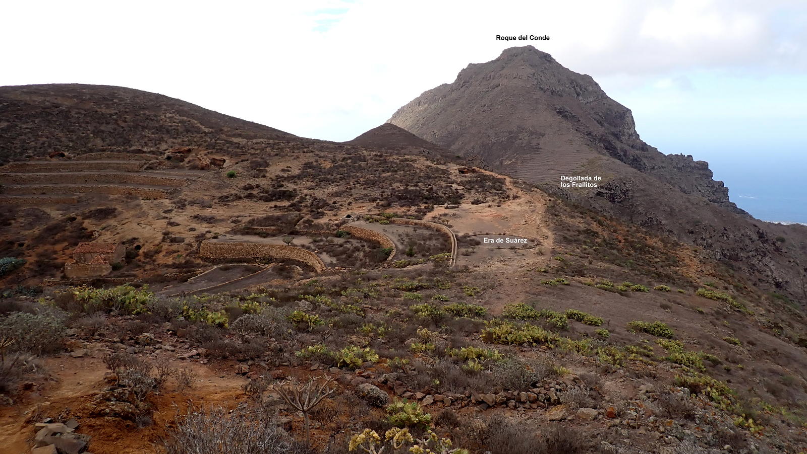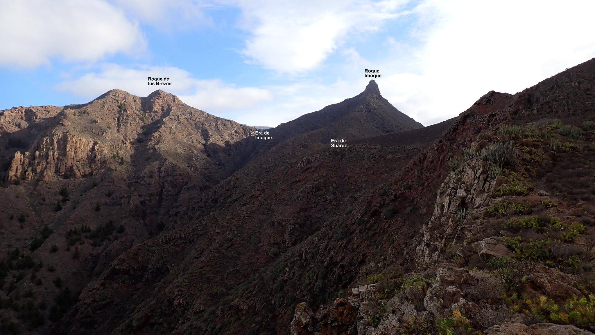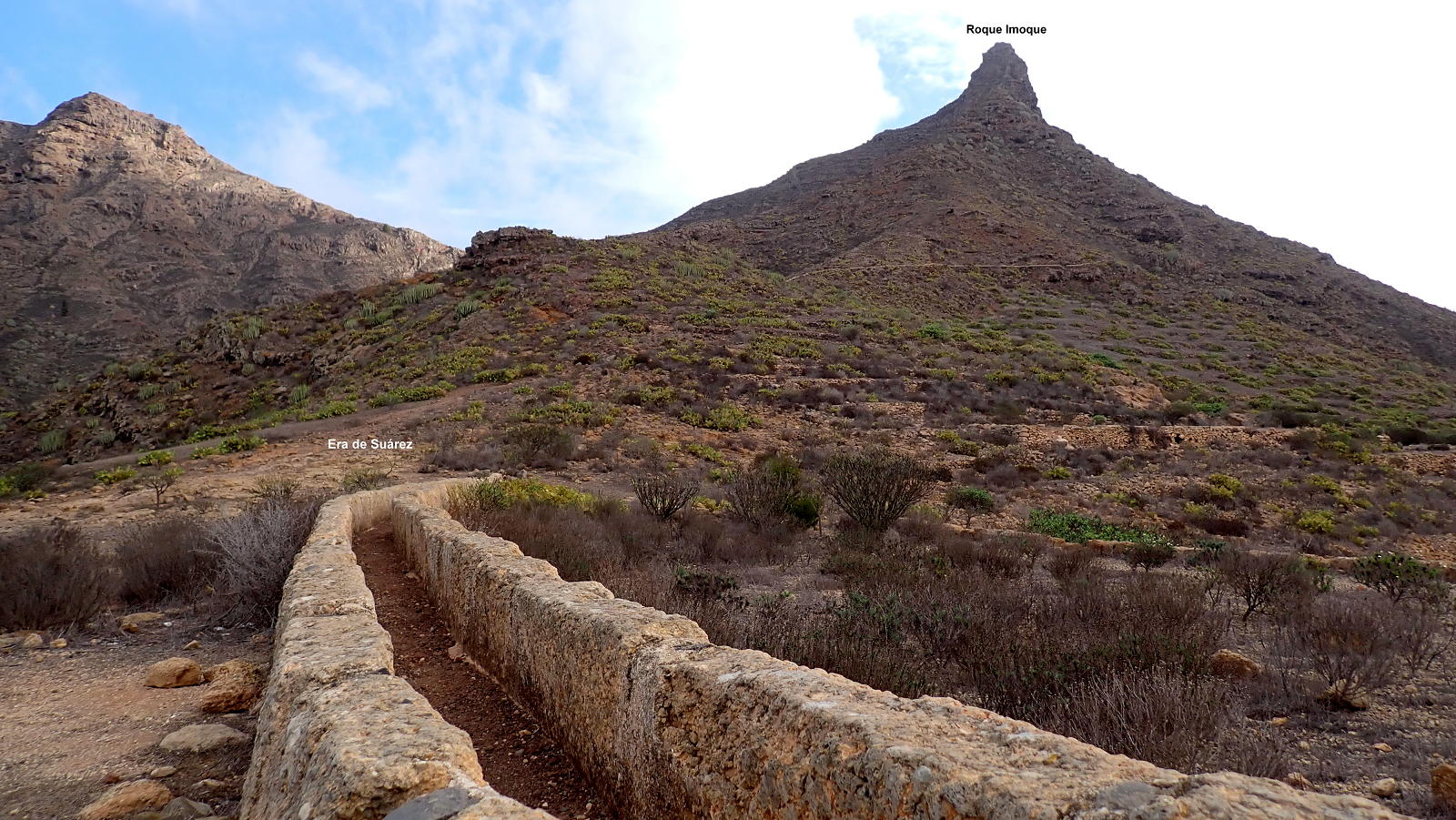 A partir del collado seguimos el Camino Natural de Anaga-Chasna GR-131. Llaneando flanqueamos la Montaña de Suárez (cotas 831 y 842) que queda a nuestra derecha. Llegamos al collado Era de Suárez (817m 1h44′) ocupado por una estructura circular empedrada que se usaba como área para trillar. Comienza el ascenso por la ladera oeste del Roque Imoque al collado Era de Imoque (987m 2h05′), también llamado collado del Topo y también con otro círculo empedrado. Es el collado NW del Roque Imoque y aquí abandonamos el GR-131. La esbelta y rocosa figura del Roque Imoque parece inaccesible.