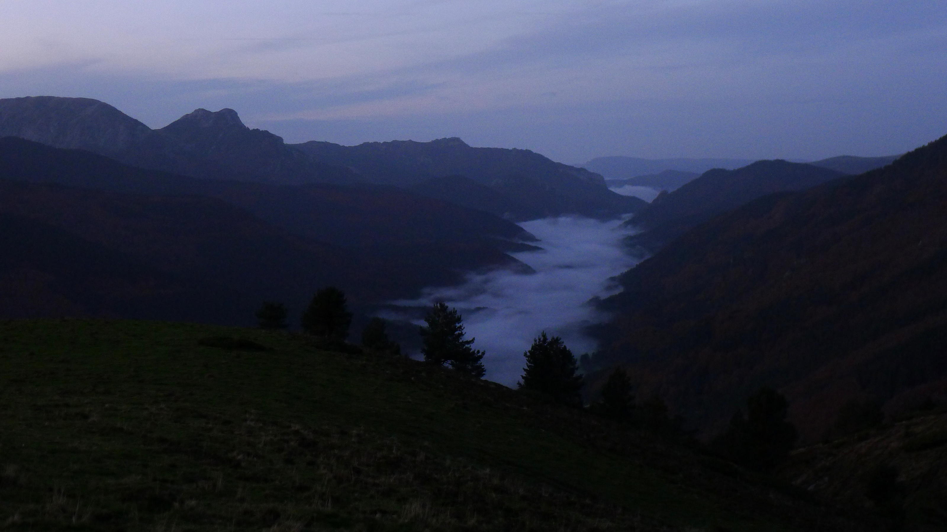 Como me temía, el descenso está muy resbaladizo. Tengo que bajar bastante despacio. Hasta el collado Arrakogoiti sigo el mismo camino que al subir, pero después sigo una senda un poco más abajo que e GR y que se va a juntar con éste tras el paso de uno de los barrancos que hay que atravesar, en la cota 1400m, cerca ya de las cercas de ganado para llegar al aparcamiento de Yeguaceros (1377m 2h45′)