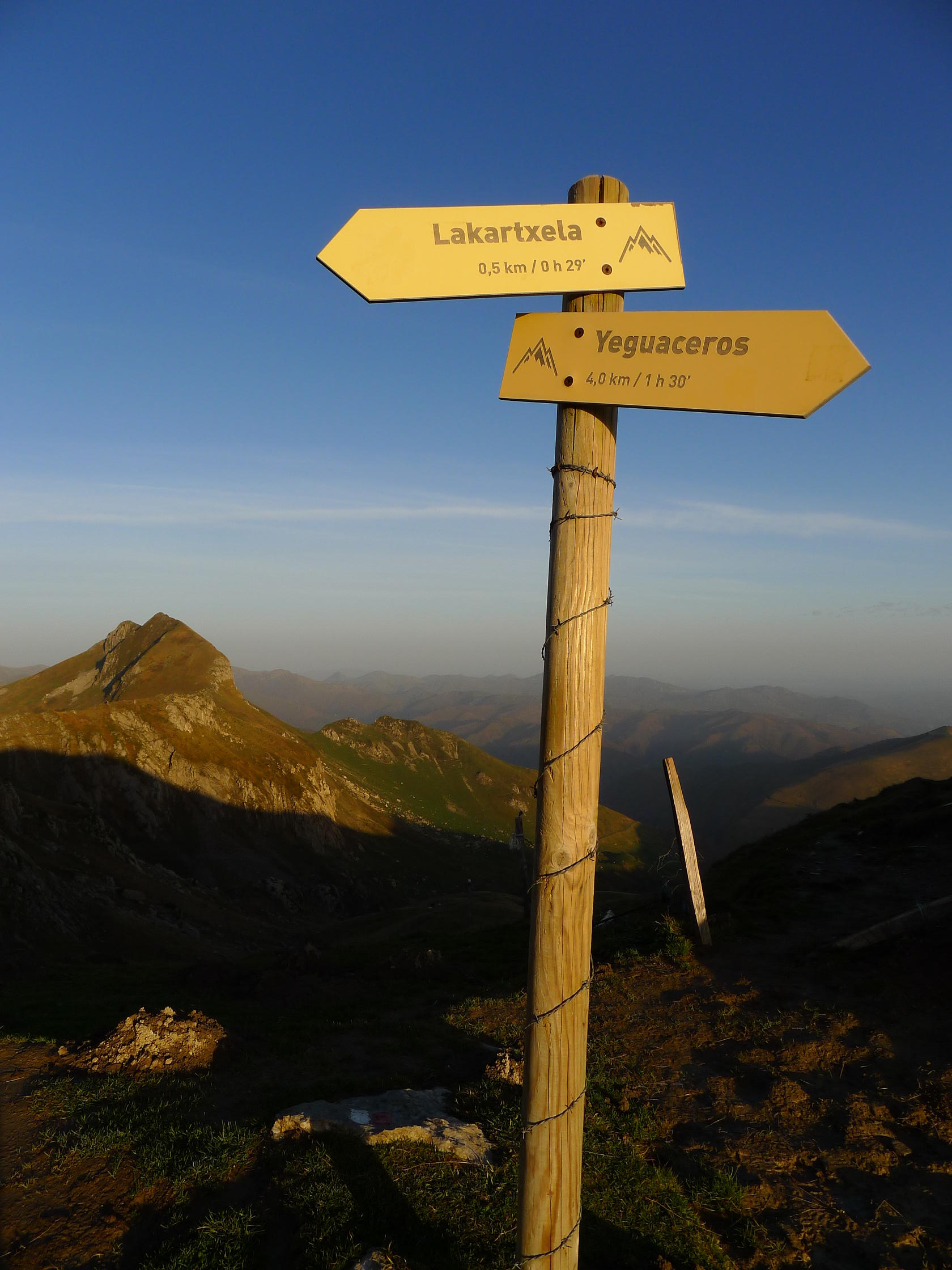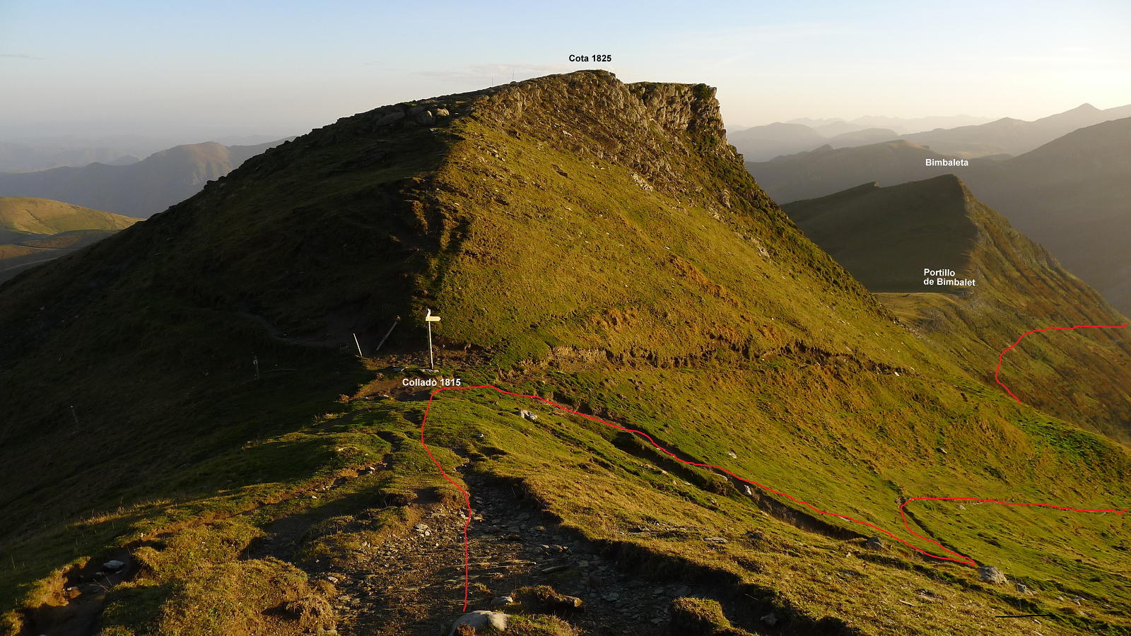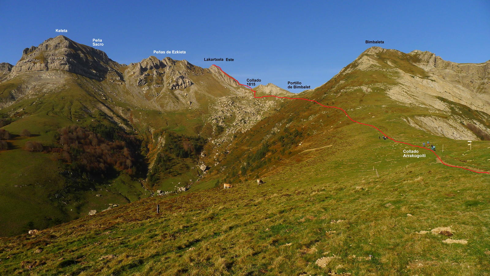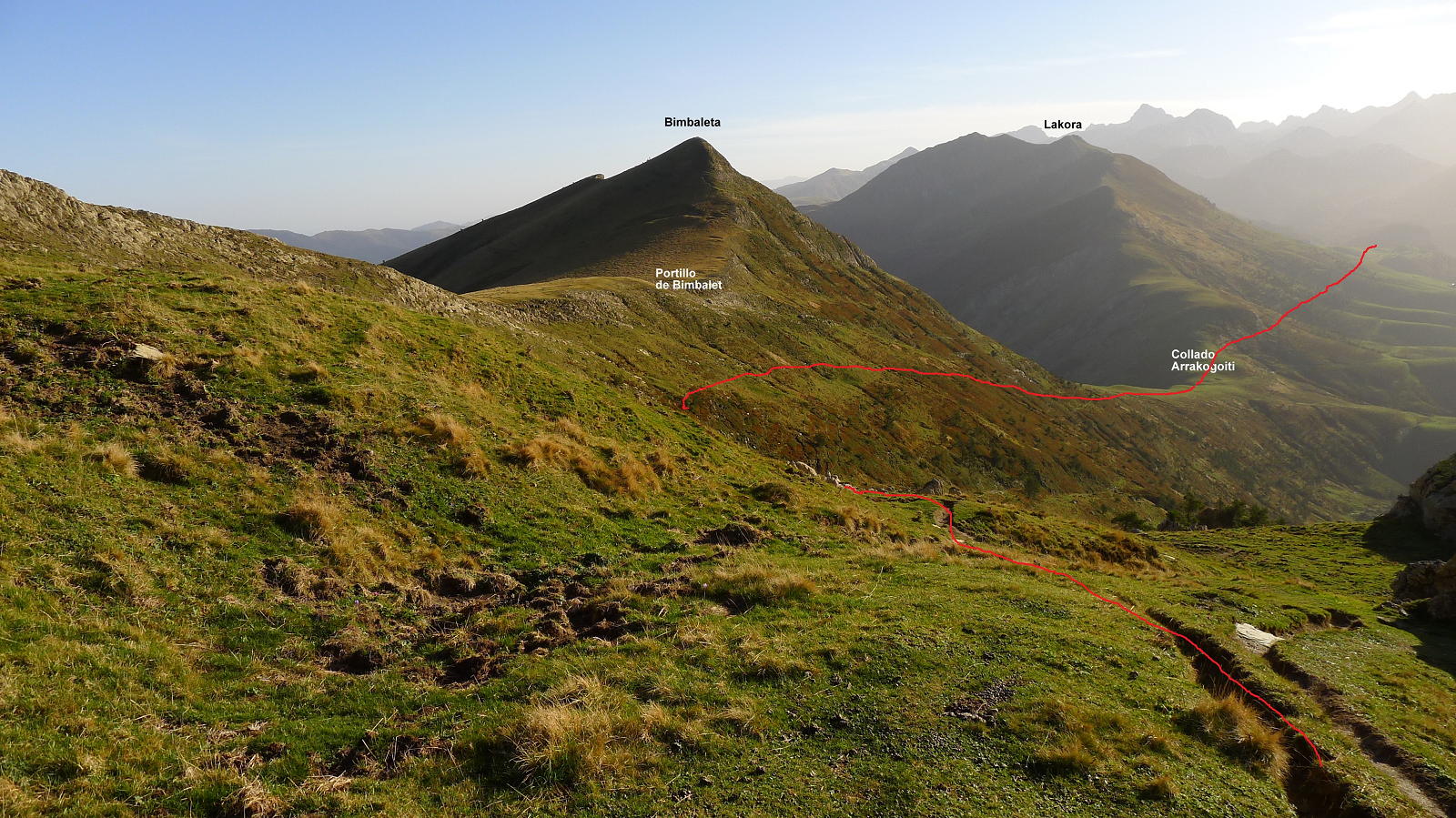 Descripción de la ruta: Aparcamiento de Yeguaceros (1377). Se rodean por la derecha las cercas para el ganado y se asciende hasta encontrar el GR-12. El camino va faldeando en suave ascenso hasta el collado Arrakogoiti (1415m 0h23′). Toma el lomo SE del Bimbaleta, pero luego flanquea esta cumbre por el sur. También dejo a la derecha el Portillo de Bimbalet y continuo hacia el oeste a un collado entre una cota 1825 a la derecha y el Lakartxela a la izquierda (collado 1812m 1h00′).