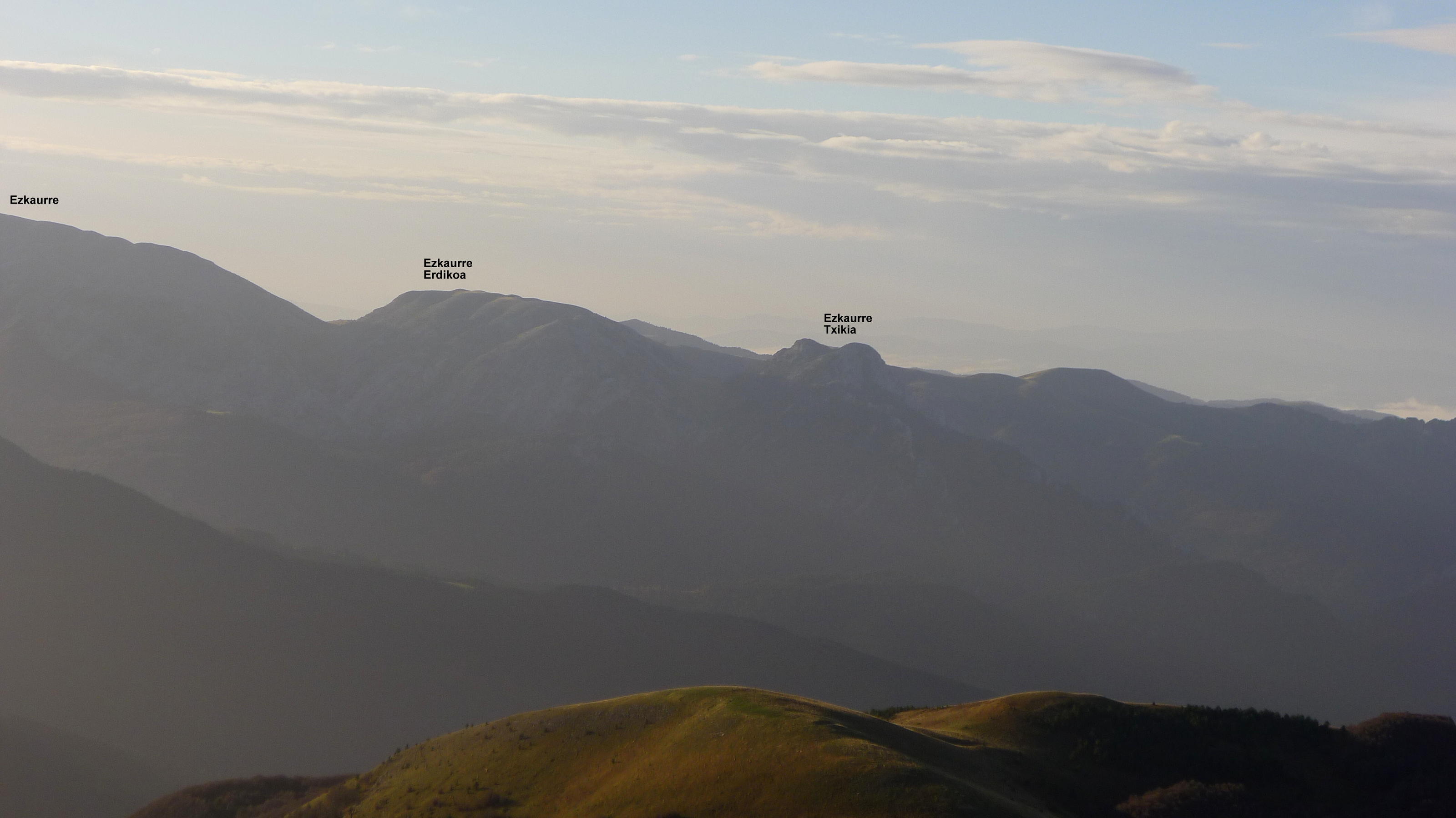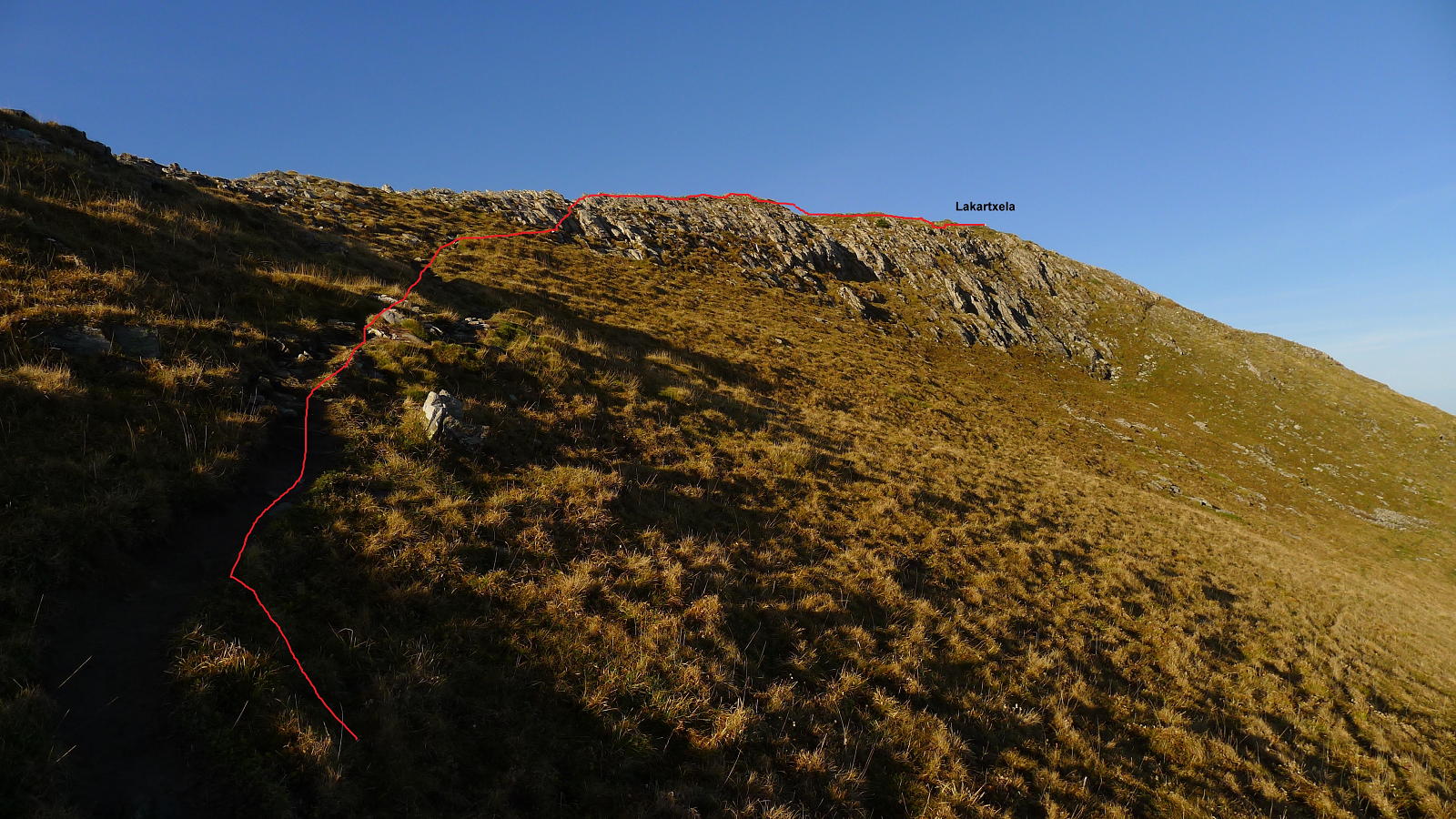Dejo el GR y me dirijo al SW por una fuerte pendiente con huella de paso, rodeando por la derecha la cumbre oriental de Lakartxela hasta alcanzar, con un paso de roca, la cresta ESE de la cumbre principal que sería el Lakartxela occidental. Unos metros de sencilla cresta permiten alcanzar la cima del Lakartxela (1981,53m 1h20′).