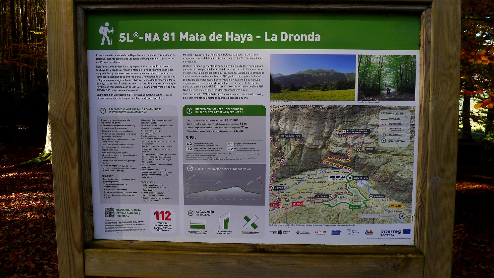Descripción de la ruta: Aparcamiento Mata de Haya (995m). Seguimos las indicaciones del SL-NA-81 que nos lleva por un camino tapizado de hojas secas de haya. El camino es sencillo y de desniveles suaves. Al principio discurre por la orilla izquierda del río Belagua. Luego va girando a la derecha para alcanzar la cota máxima de 1080m y avanzar por terreno despejado con helechos hacia el oeste. Vuelve a girar hacia el este entrando de nuevo en el hayedo y, finalmente, nos encaramos al sur por una zona un poco más confusa donde perdemos la señalización pero que ya está muy cerca del punto de inicio (Aparcamiento 995m 1h55′)