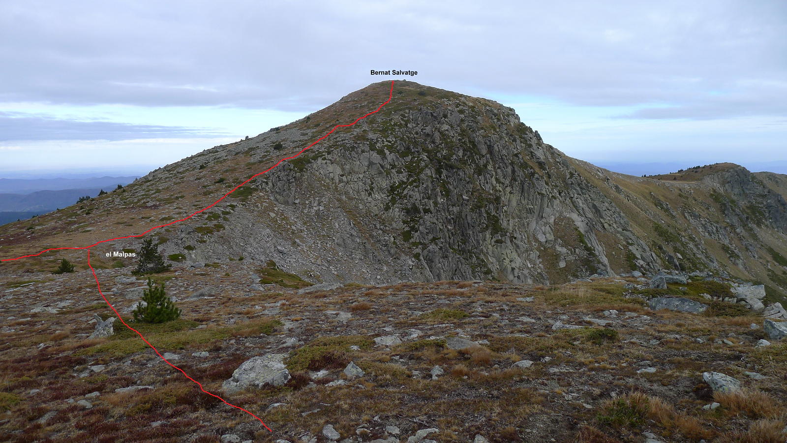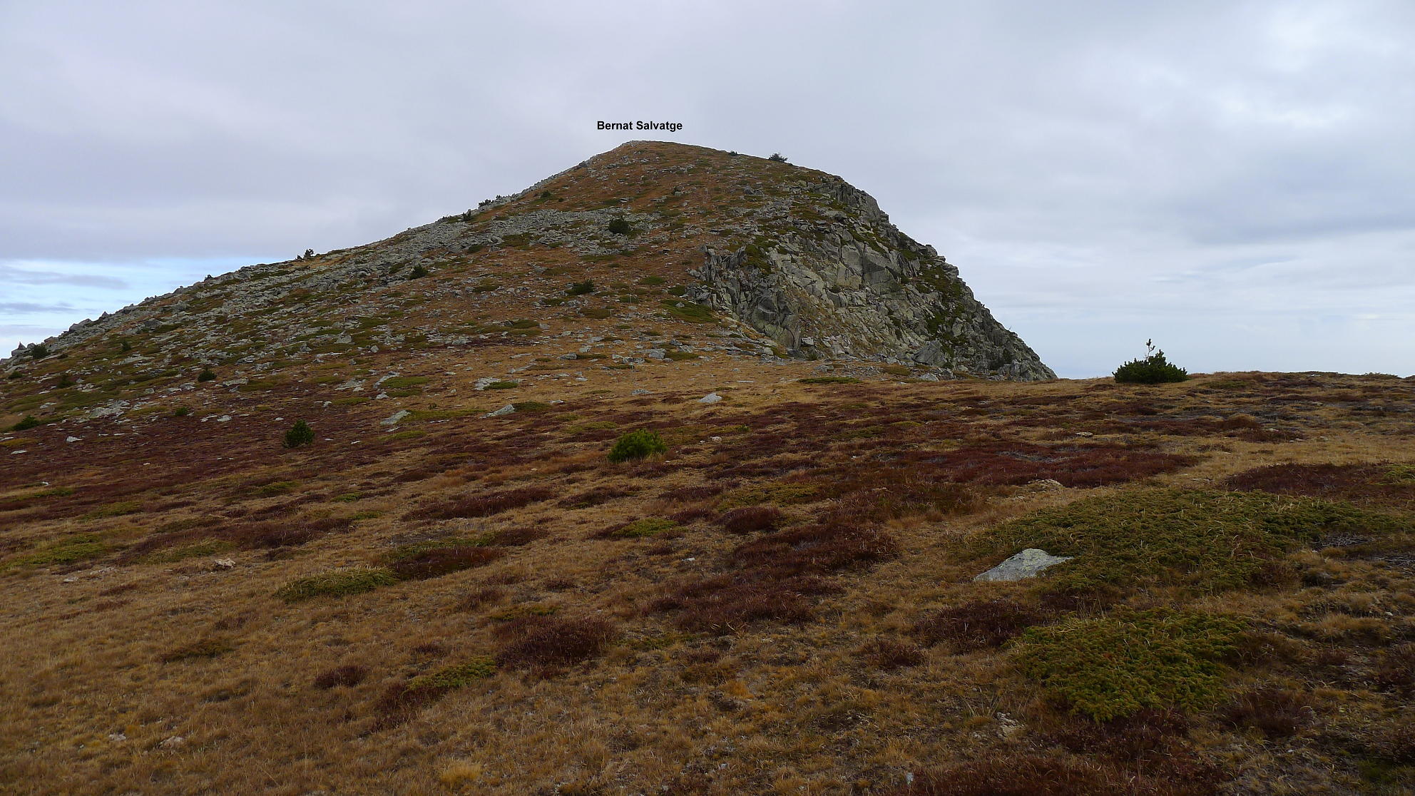 Se pasa una portilla (2330m 1h58′) junto al coll des Gavatxos. La panorámica cambia radicalmente. El camino flanquea en llano con un circo a mi izquierda. No hay pintura pero tampoco hay pérdida. Gira a la derecha (2330m 2h13′) e inmediatamente dejo la senda y me voy a la izquierda directo al collado llamado el Malpas (collado entre el Bernat Salvatge y el Madres). Hay huella e hitos hasta la cima del Bernat Salvatge (2423m 2h25′).