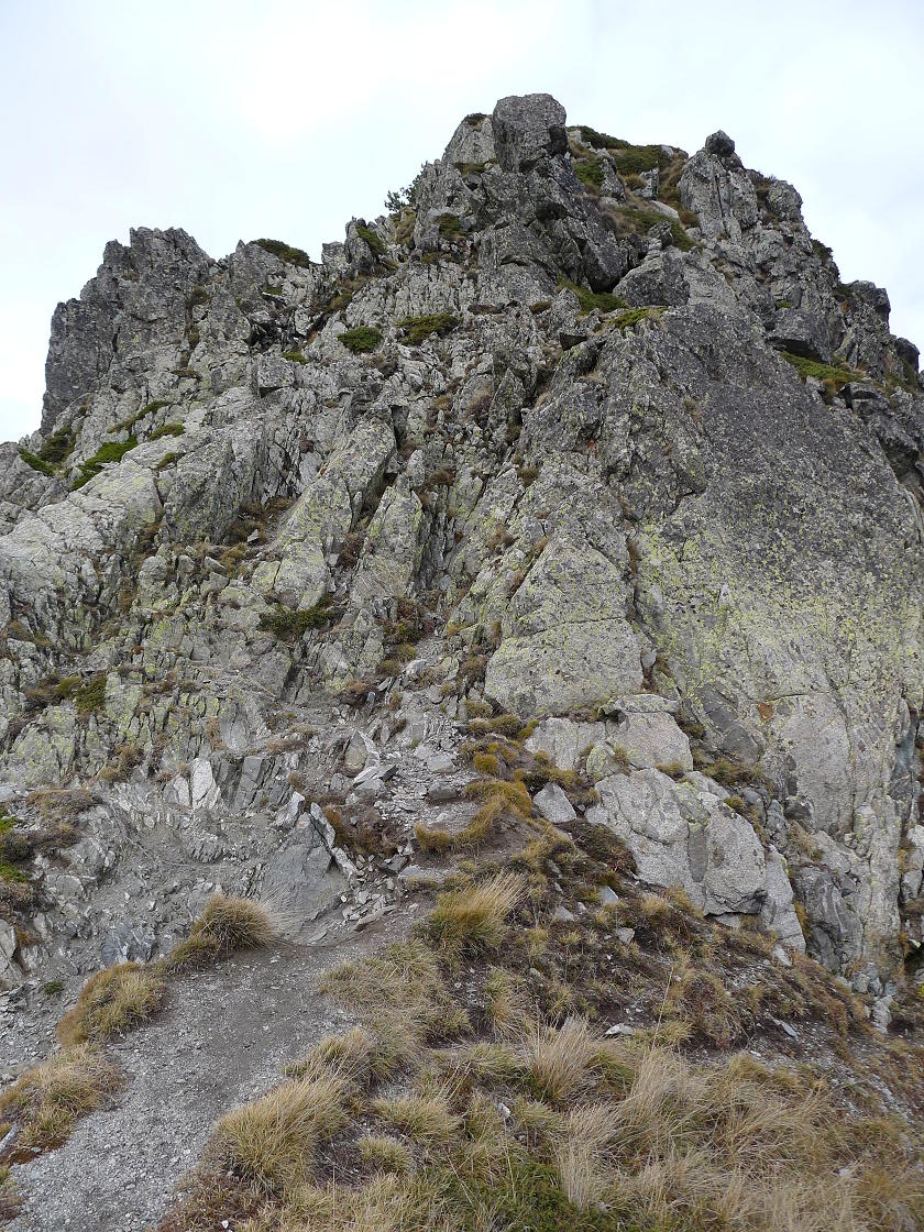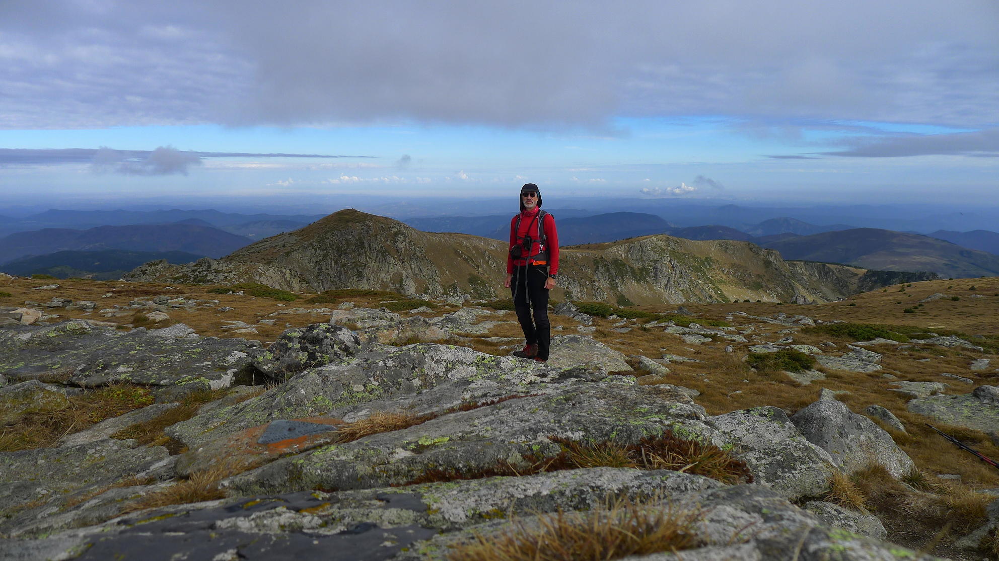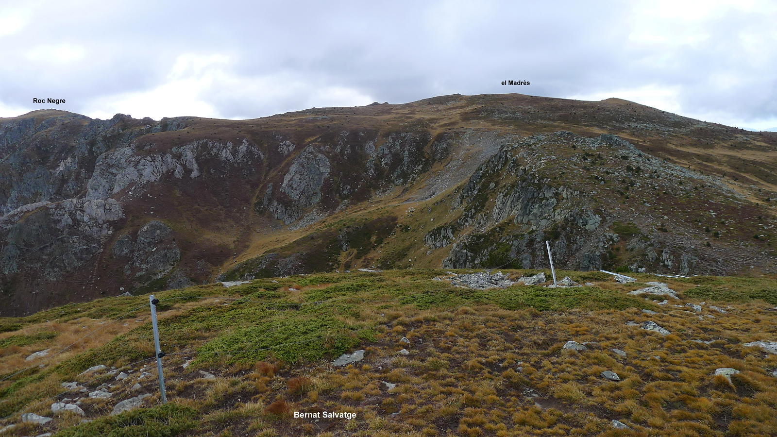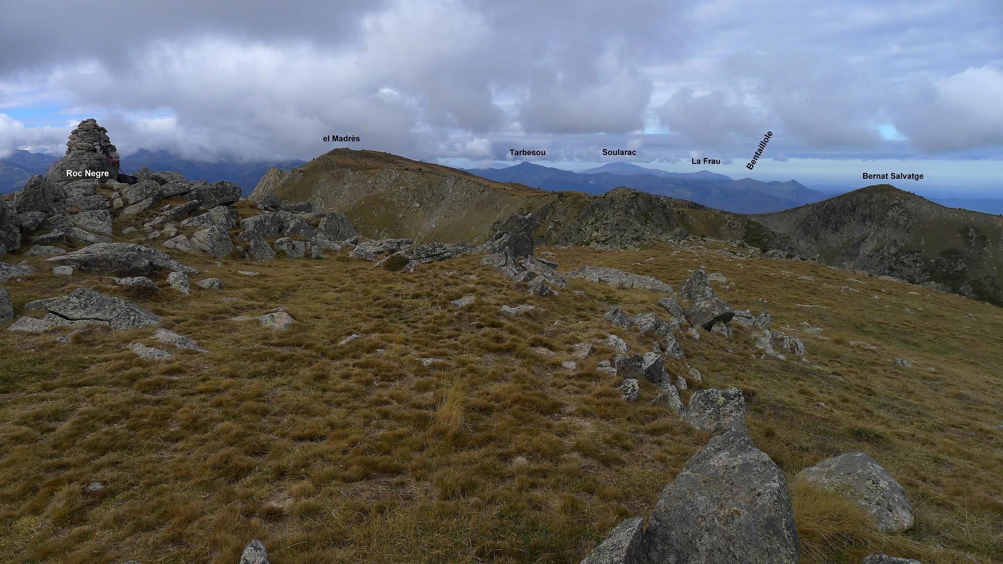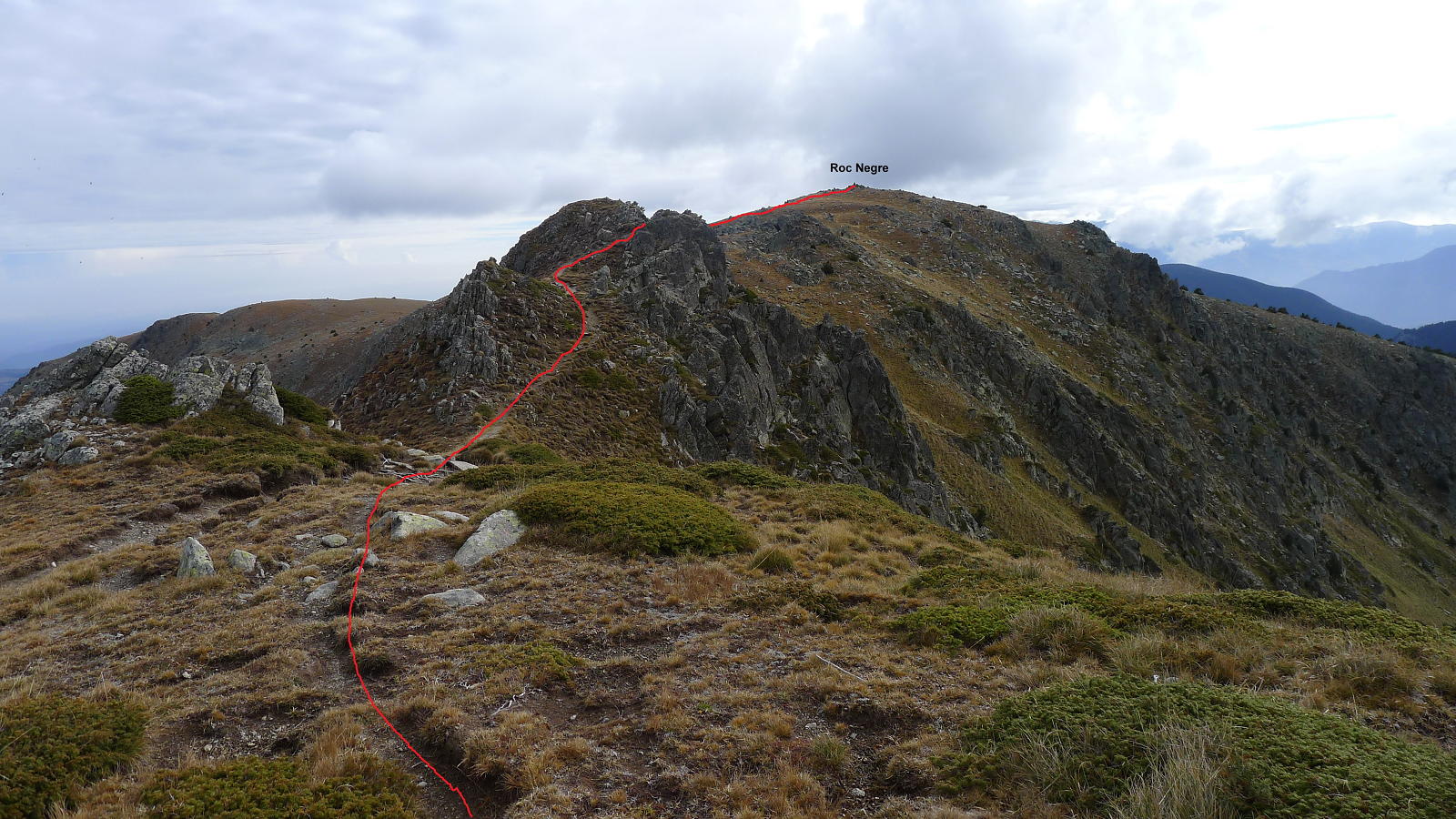 Sigo senda hacia el este, hacia el Roc Negre. Entre medias hay un resalte rocoso que, primero por encima y luego bordeando por la izquierda, se supera, habiendo algunos pasos un poco delicados. Vuelve a haber pintura y se agradece. Después ya es fácil subir la también alomada cima del Roc Negre (2459m 3h10′). El tiempo ha sido nublado y en todas las cimas la vista hacia la lejanía no ha sido nada clara.