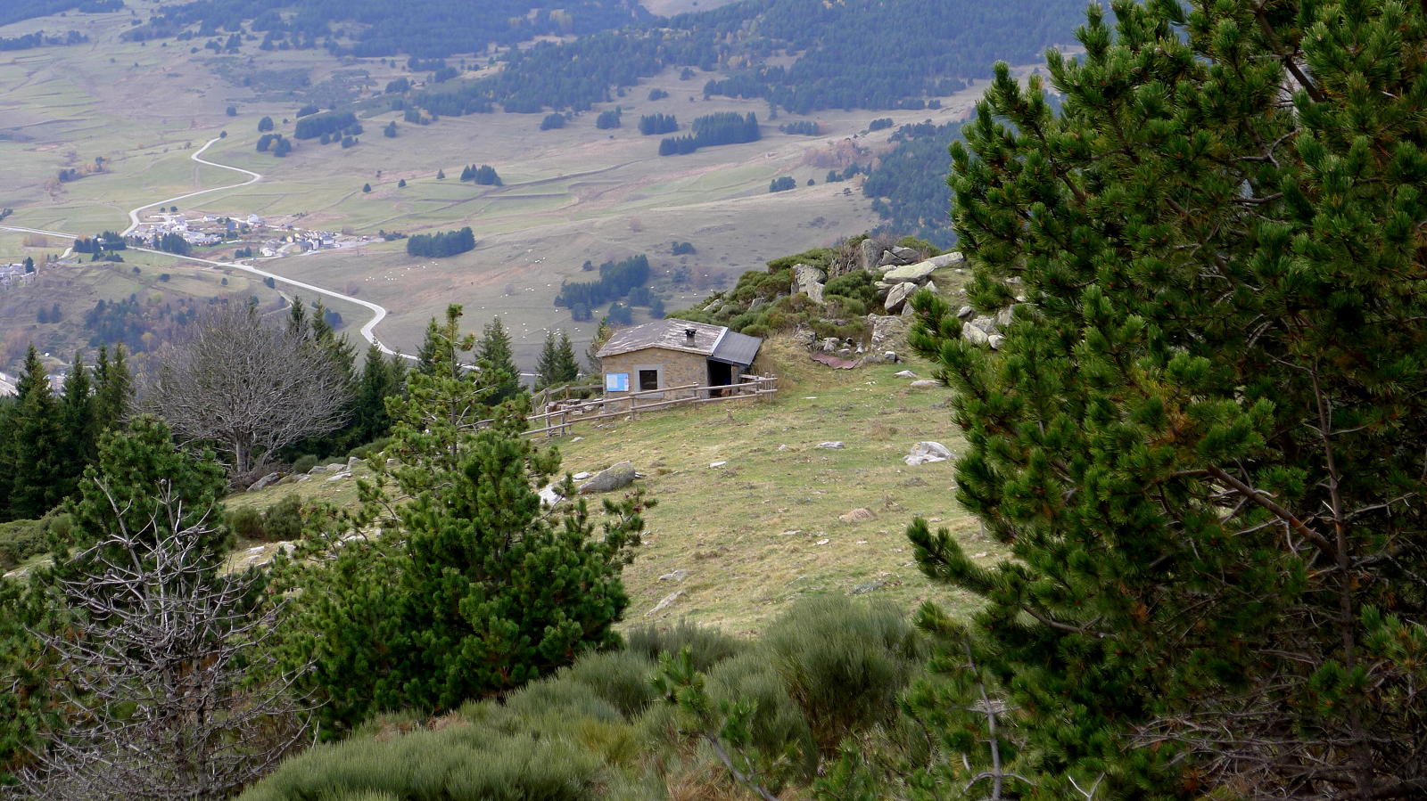 Después sale a la izquierda un camino (1595m 0h36′) con indicación. El camino se ensancha y se convierte en una pista con mucho palo (restos de la explotación forestal, supongo). Más adelante pasa a ser un sendero que asciende por pinar. Giro drástico a la derecha (1780m 0h55′) y de repente aparece una zona despejada donde se encuentra el refugio de Oller (1830m 1h02′) y sigue la senda con señales roja y amarilla.