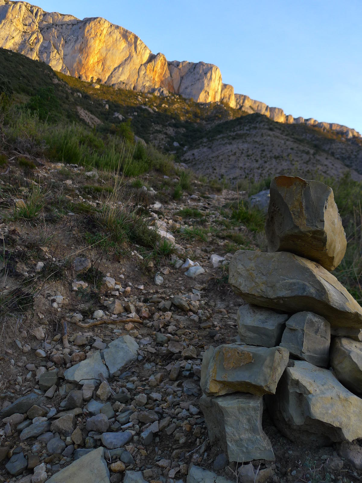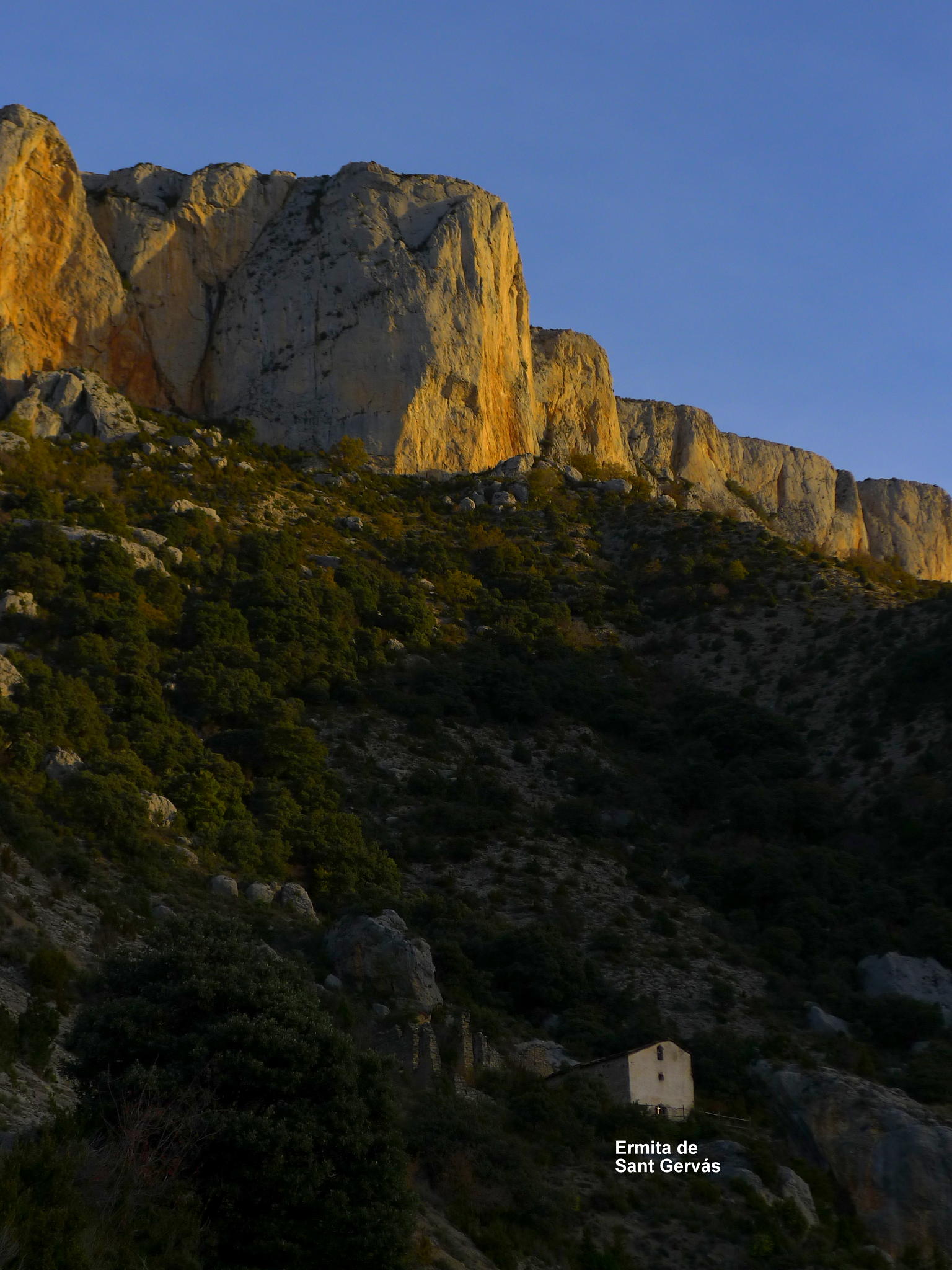 Vuelvo a dejar la pista (1110m 0h26′), ahora con hitos y marca de pintura amarilla, con senda clara por la orilla derecha del barranco Sant Gervàs y con fuerte pendiente, va girando a la izquierda para entrar en un encinar. Bifurcación (1200m oh35′) con un cartel. Hay que seguir a la derecha hacia la ermita de Sant Gervàs (1265m 0h42′). Un gran flanqueo hacia la derecha en suave subida lleva hasta un hombro con un hito grande (1385m) donde la pintura amarilla marca el giro a la izquierda para tomar dirección norte.