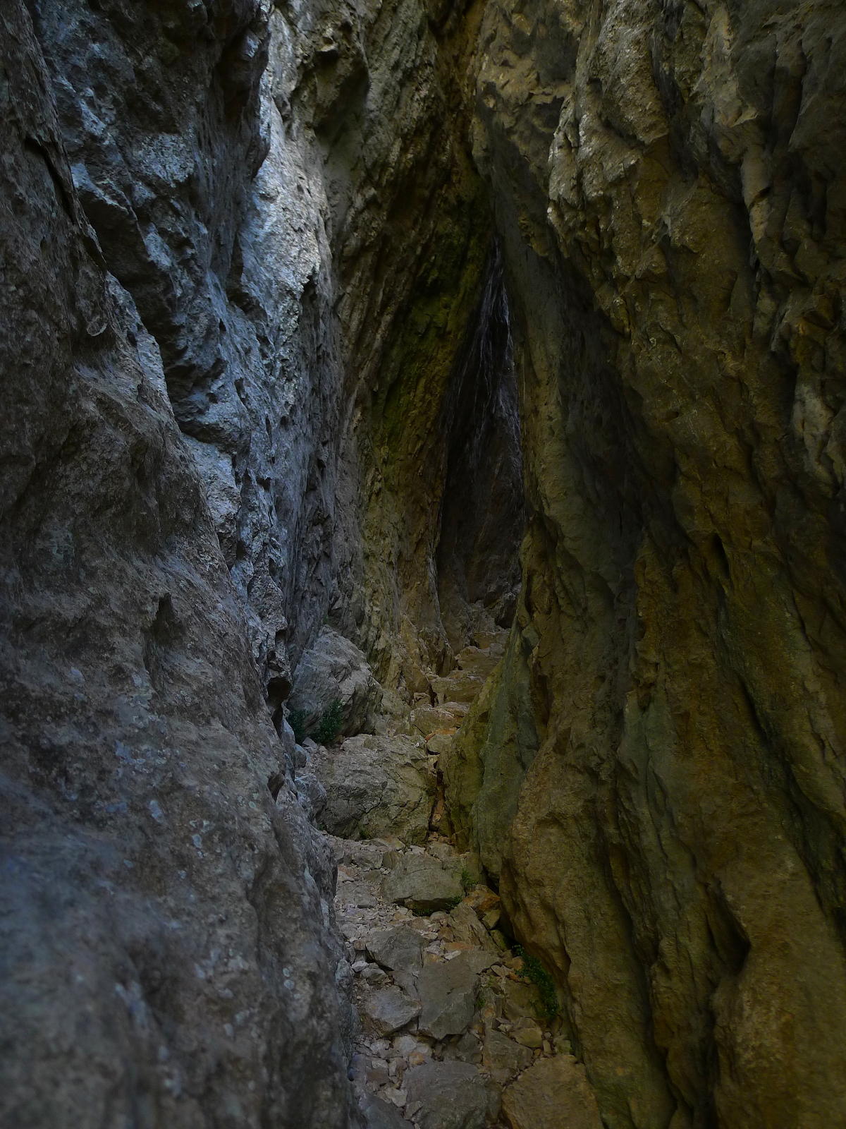 La senda ahora adquiere pendiente muy fuerte, ascendiendo por terreno pedregoso, entre bojes y enebros, prestando atención a no perder los hitos y con un esfuerzo notable llego a la base de la pared (1640m 1h25′). Aquí se gira a la derecha. Entre bojes altos y rocas se llega a la brecha del Portús (1690m 1h33′). Recuerdo que en la anterior ocasión que estuve me resultó confuso y me costó dar unas cuantas vueltas para encontrar el Portús, en cambio, en esta ocasión lo he visto muy bien indicado. El Portús es una grieta en la roca de no más de 100m de largo y una anchura de 1m o 1.5m; es espectacular pasar por ella y aparecer en la otra vertiente de la montaña. Al salir hay un punto indicado con cobertura para poder llamar al 112. A la derecha queda la esbelta Avegoda d’Adons y a la izquierda mi objetivo, la Pala de Teller.