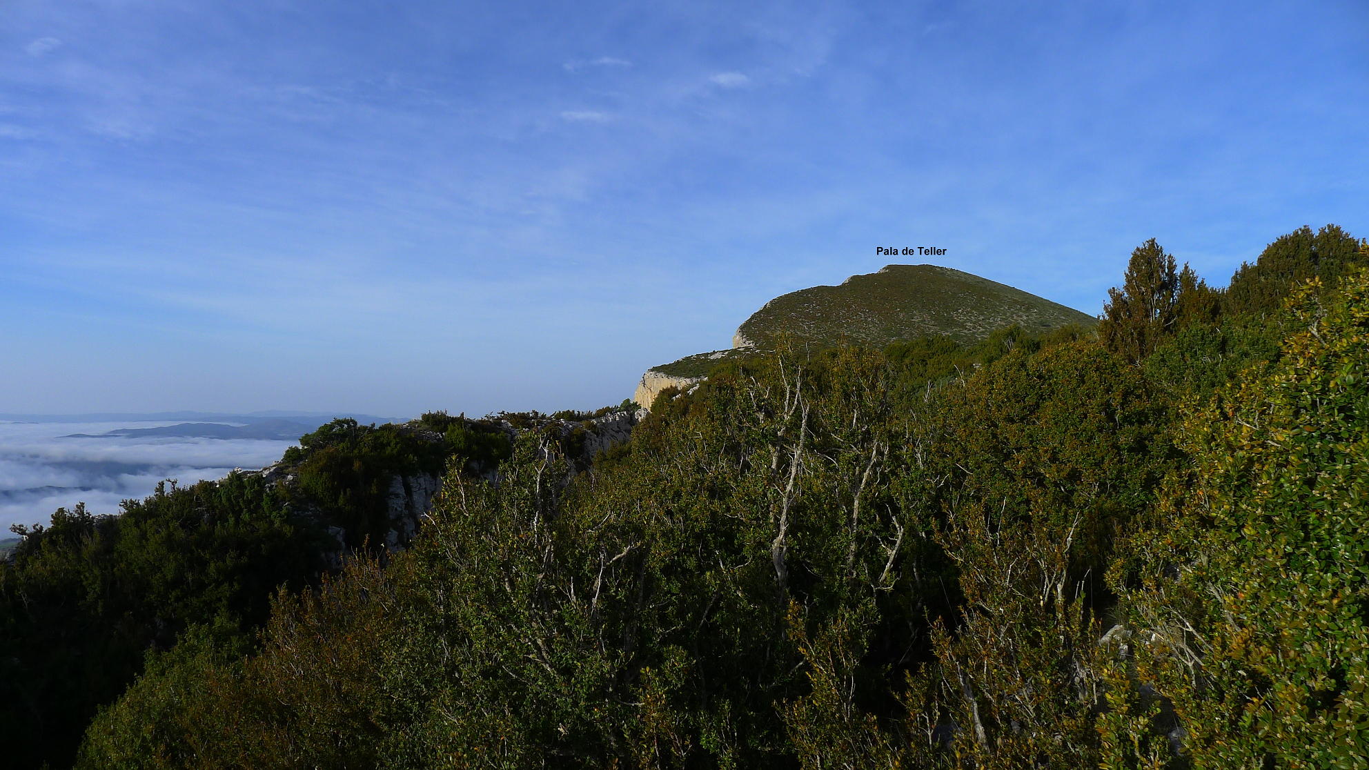 Avanzo subiendo por la ladera hasta girar decididamente a la izquierda para, sin senda, llegar al cortado y seguir unos metros junto al cortado hasta la cima. Pala de Teller (1889.3m 2h12′). Unos cuantos buitres vuelan a mi altura aprovechando la brisa de ladera.