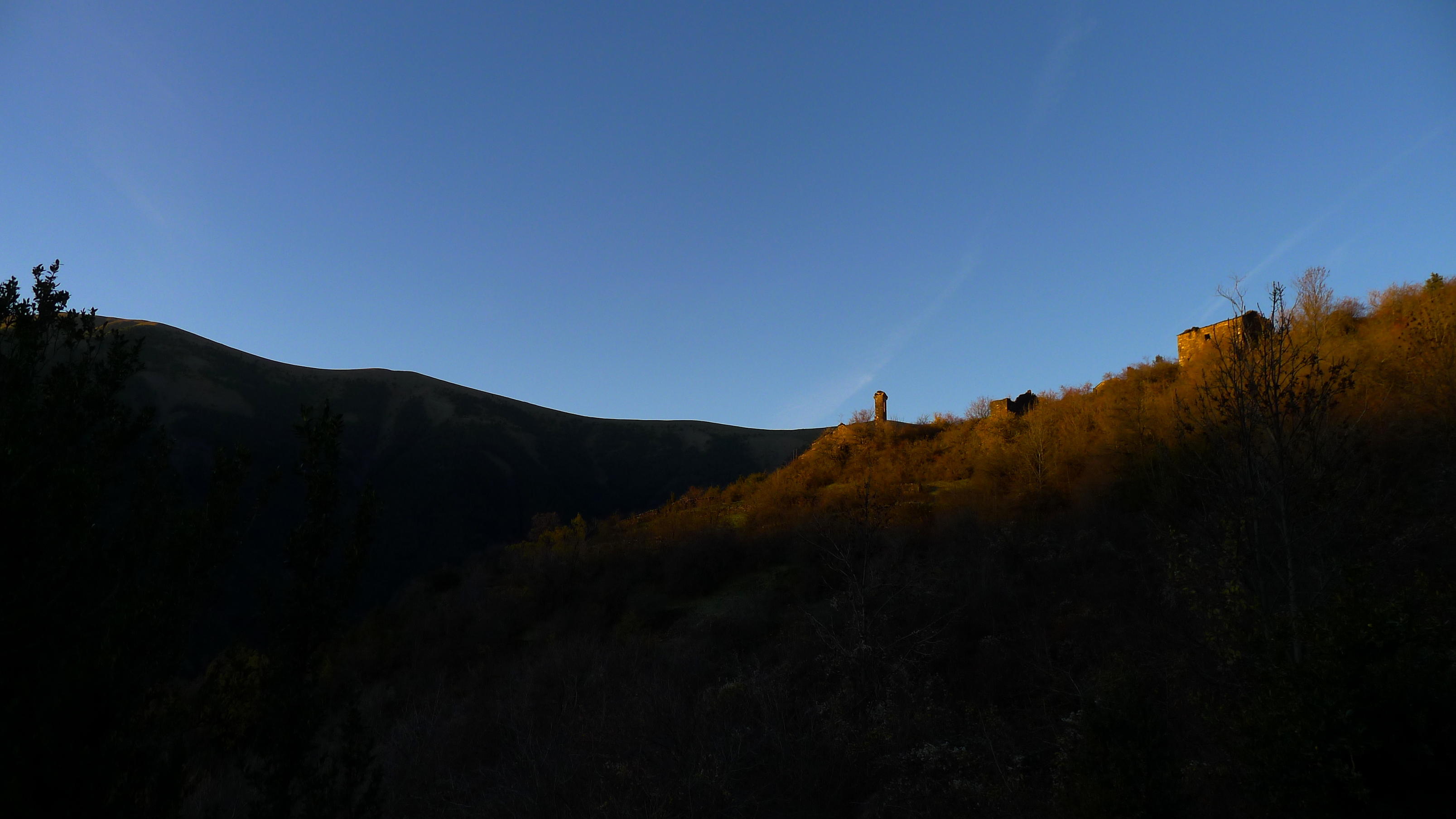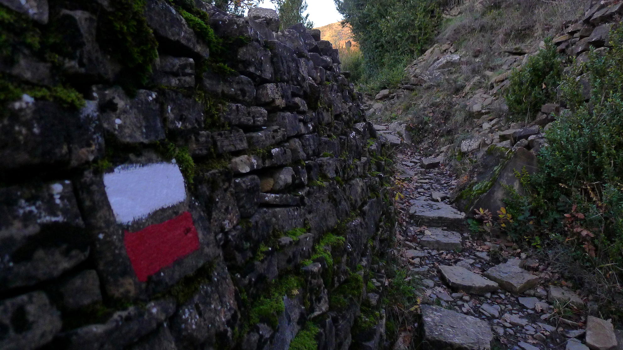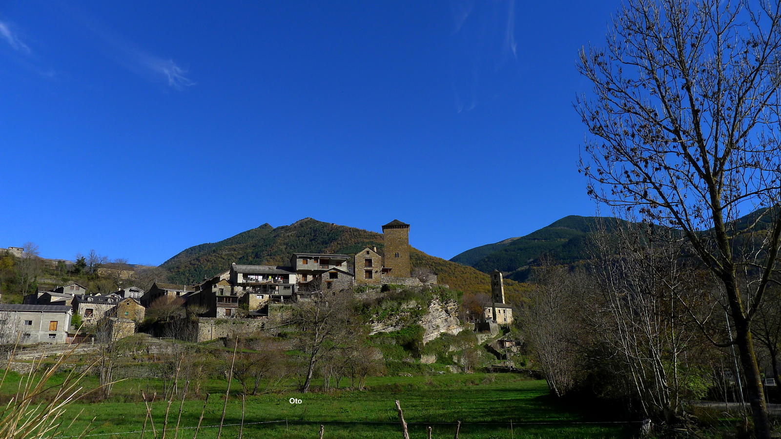 Descripción de la ruta: Oto ((895m). Subo hacia el pueblo y, al entrar en el pueblo, giro a la izquierda siguiendo las señales del GR-15. Es casi de noche. Es un sendero con muros de piedra a mi derecha, por tramos enlosado, avanzando por encima de la orilla izquierda del barranco de Yosa, terreno llano o en ligera subida. Hay que pasar hasta tres portillas. Luego hay una subida más fuerte y se llega al pueblo abandonado de Yosa (1345m 1h05′).