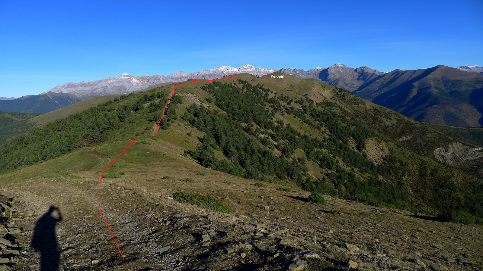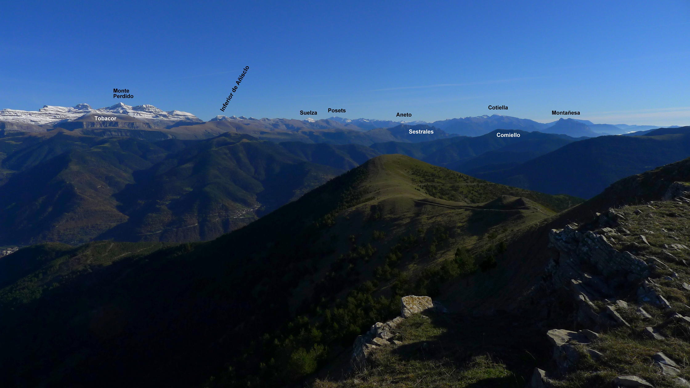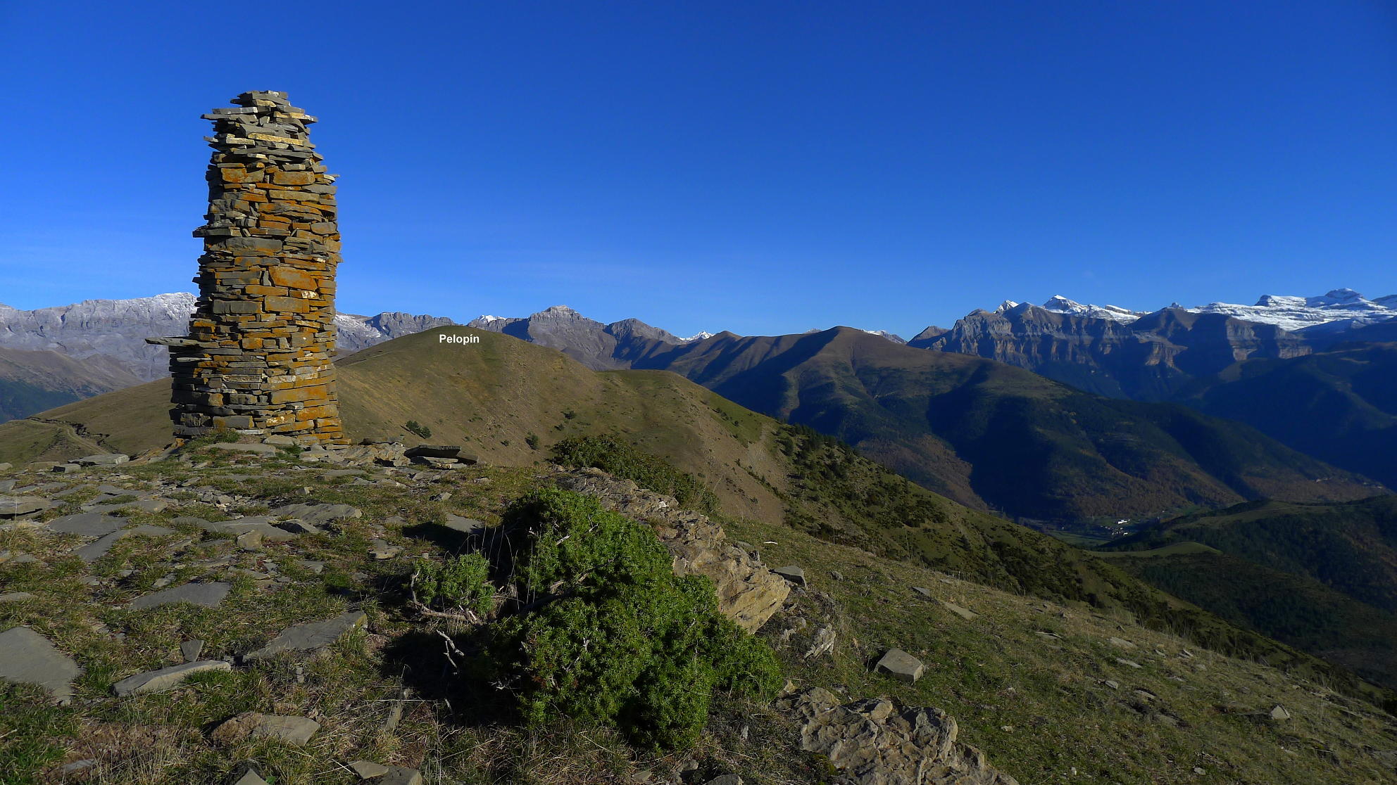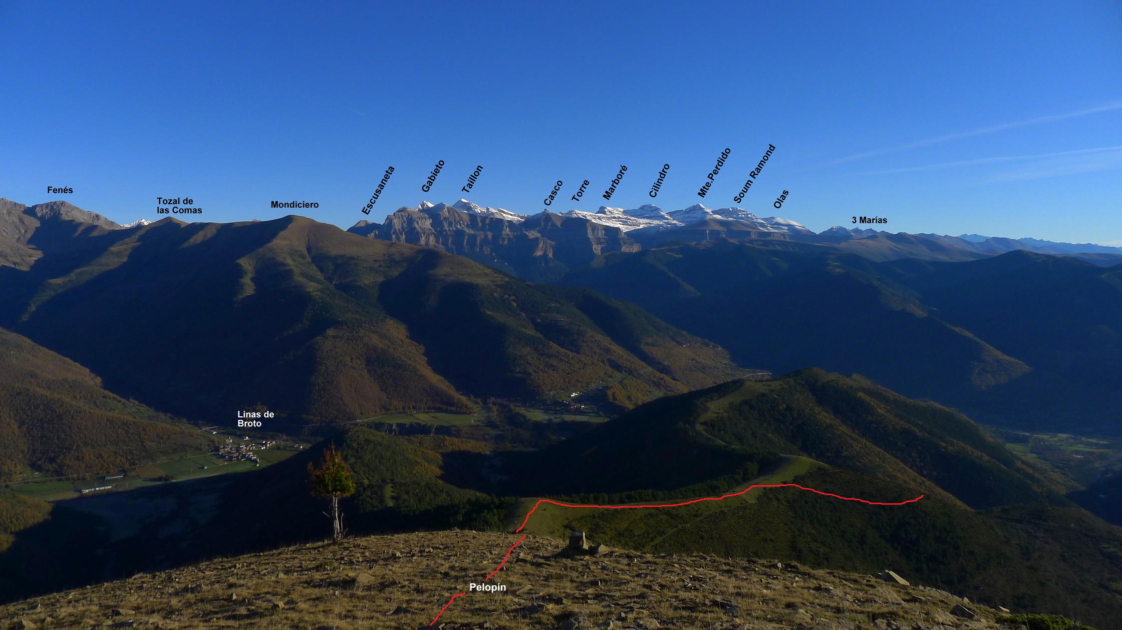 Continúa el GR-15 ya en clara subida al collado junto al Tozal del Pueyo (1595m 1h33′). Ahora tendré que seguir el lomo hacia el Pelopín, primero al oeste y luego girando al SW. El GR esquiva el Pelopín por su ladera oeste, pero el Pelopín me llama con demasiada fuerza y no puedo evitar subirlo, aunque ya lo he subido en otras ocasiones desde Cotefablo. La cuesta se hace más dura de lo que parecía, pero al fin llega la cima del Pelopín (2005m 2h15′). Preciosas vistas del macizo de Monte Perdido y toda la cresta en forma de herradura que me queda hasta el Monchoya.