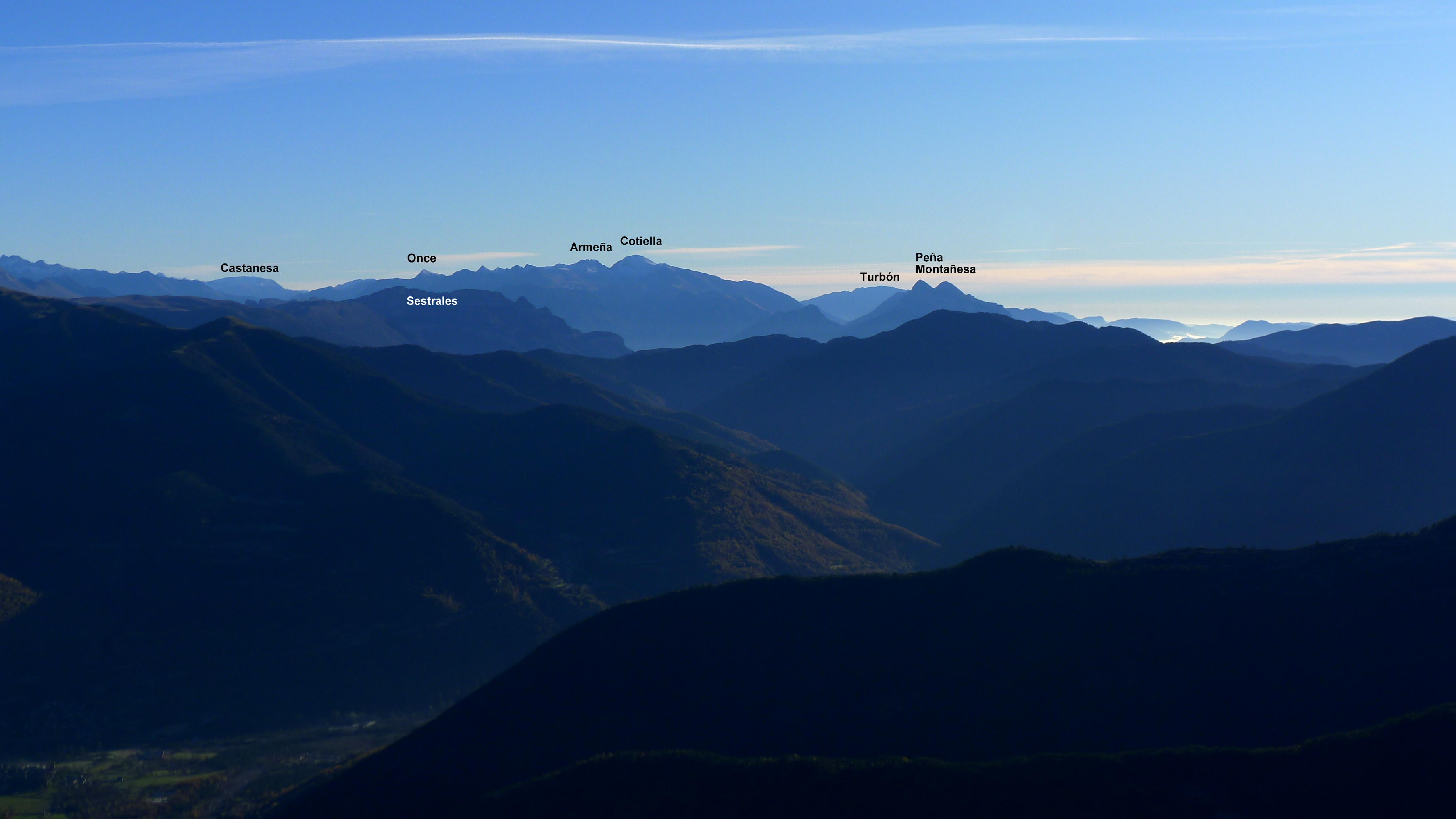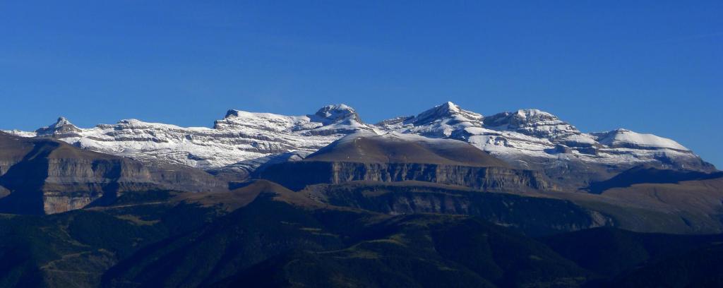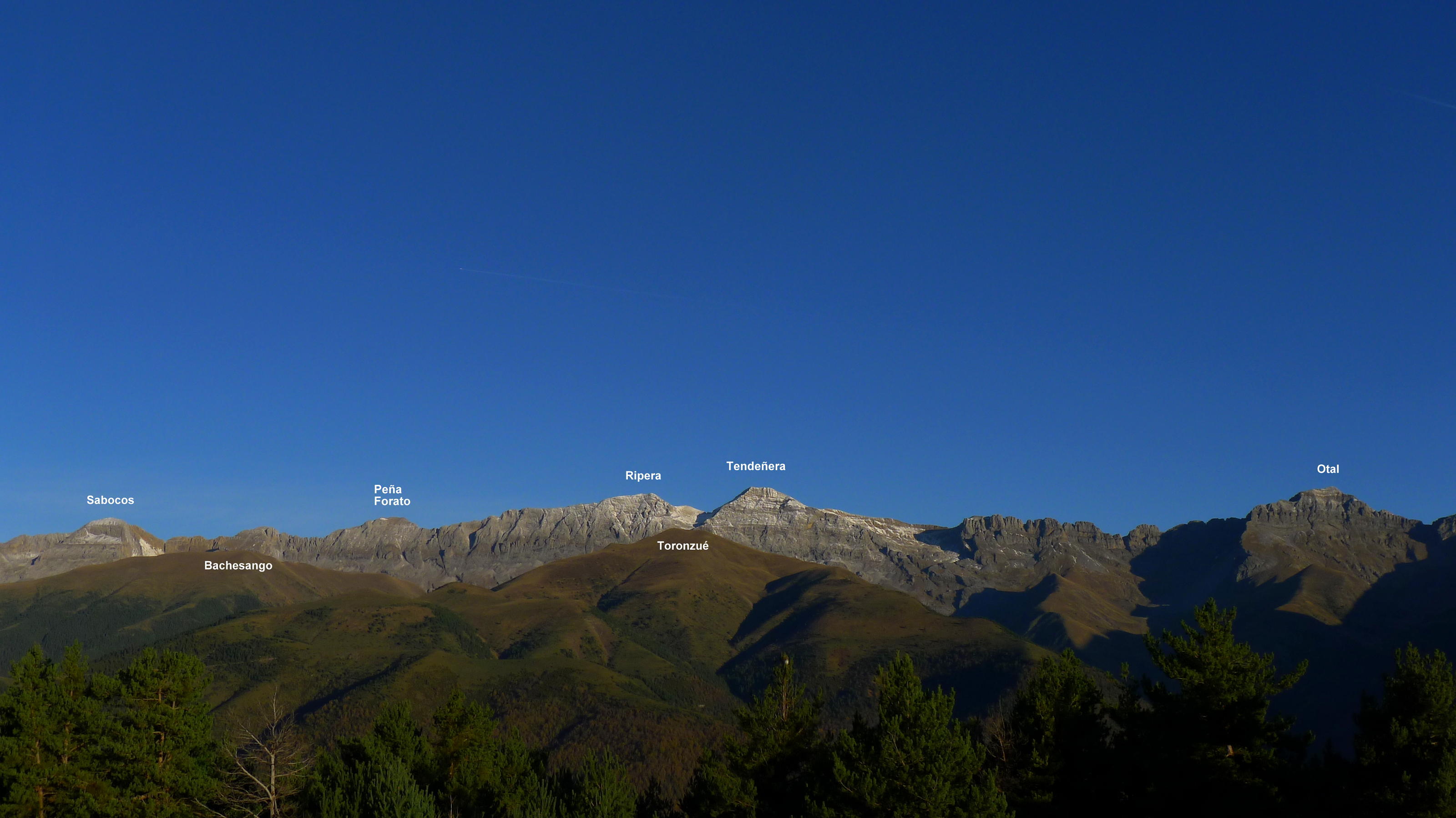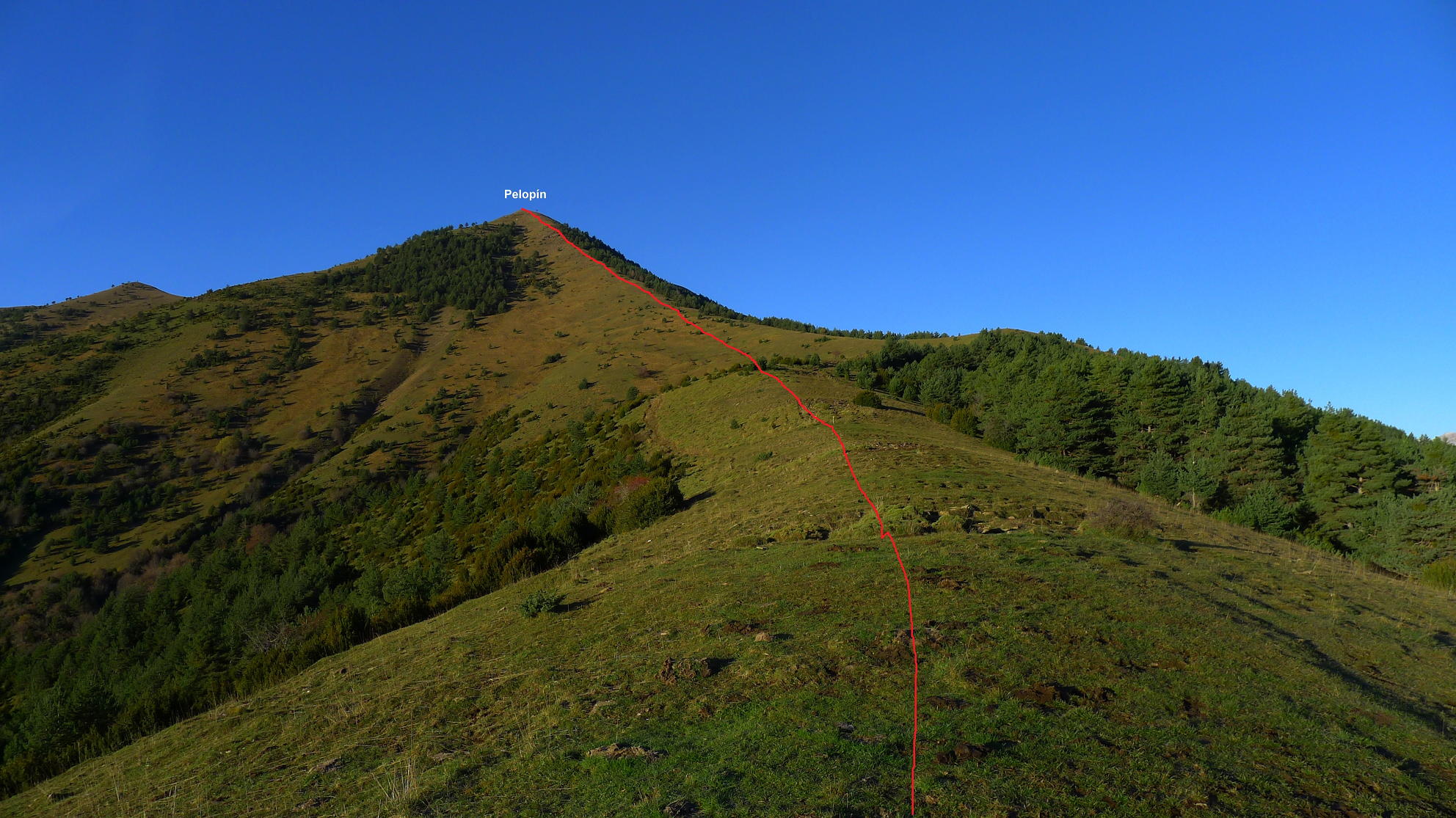 Continúa el GR-15 ya en clara subida al collado junto al Tozal del Pueyo (1595m 1h33′). Ahora tendré que seguir el lomo hacia el Pelopín, primero al oeste y luego girando al SW. El GR esquiva el Pelopín por su ladera oeste, pero el Pelopín me llama con demasiada fuerza y no puedo evitar subirlo, aunque ya lo he subido en otras ocasiones desde Cotefablo. La cuesta se hace más dura de lo que parecía, pero al fin llega la cima del Pelopín (2005m 2h15′). Preciosas vistas del macizo de Monte Perdido y toda la cresta en forma de herradura que me queda hasta el Monchoya.