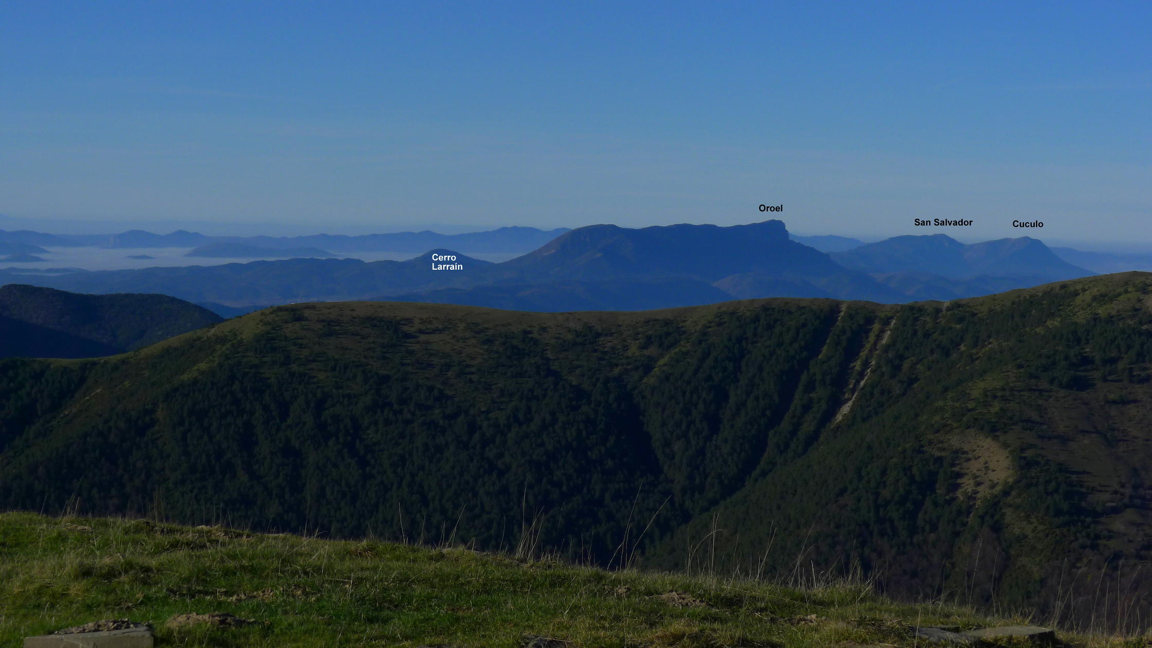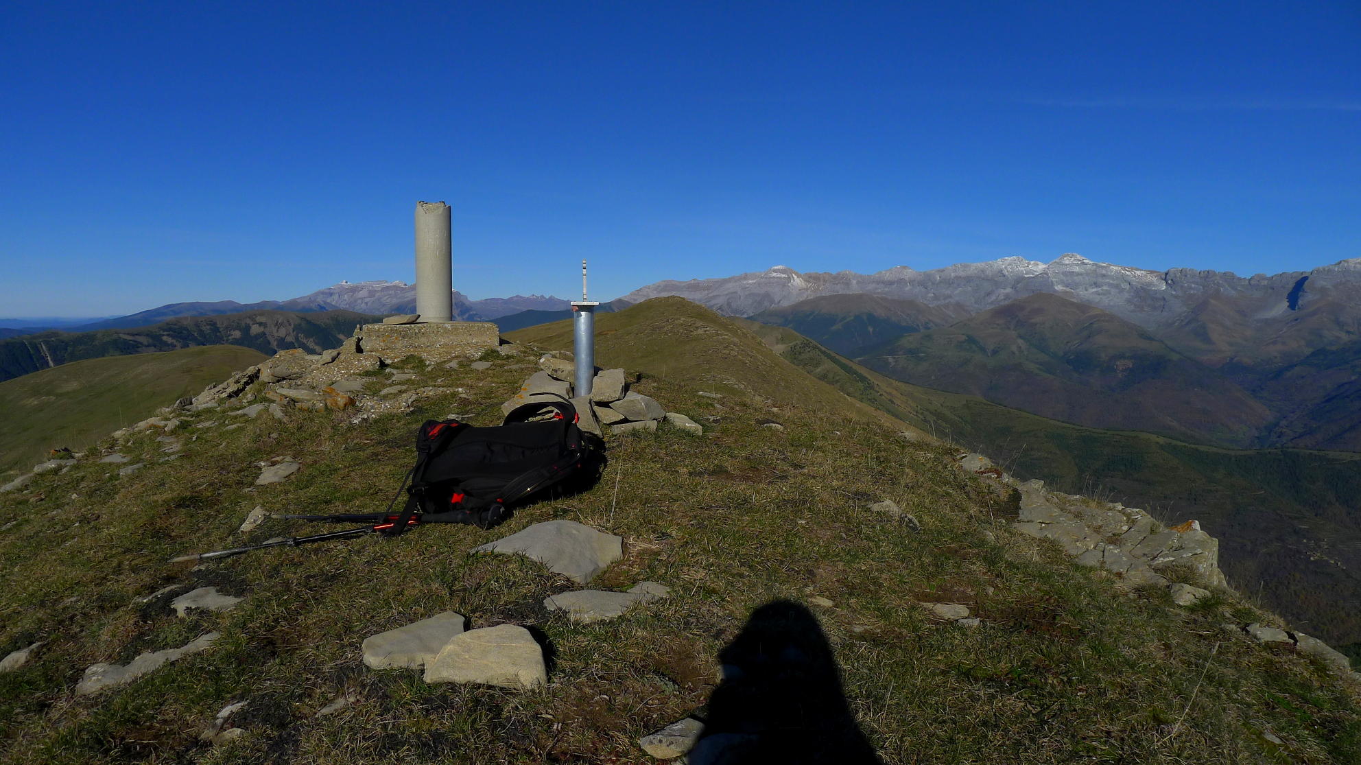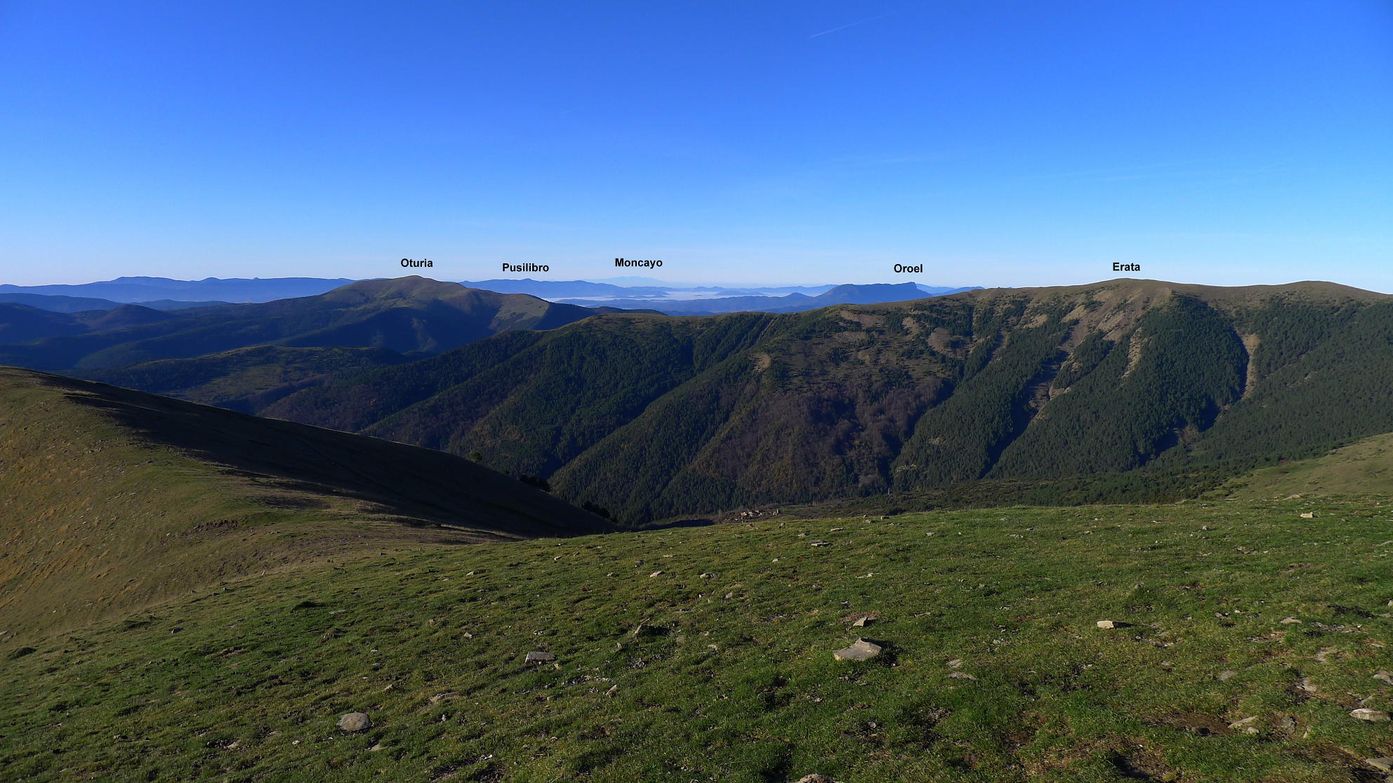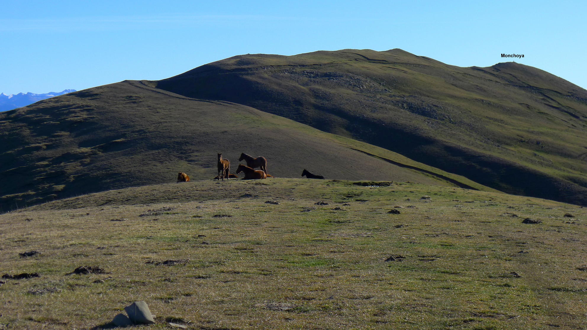Consiste en recorrer todo el lomo, tapizado de pasto suave y coincidiendo en algunos tramos con una pista ganadera. Bajo al puerto de Yosa, por donde atraviesa el GR, y subo una cota llamada Pico del Pilón (1962m 2h35′) por tener un gran pilón de piedras. En mi camino subiré el Tozal de Metils (1917m) y la Punta Cotonal (1986) antes de afrontar el pico principal, el Monchoya (2035m 3h21′), con vértice geodésico y una pequeña cruz de un grupo de montaña.