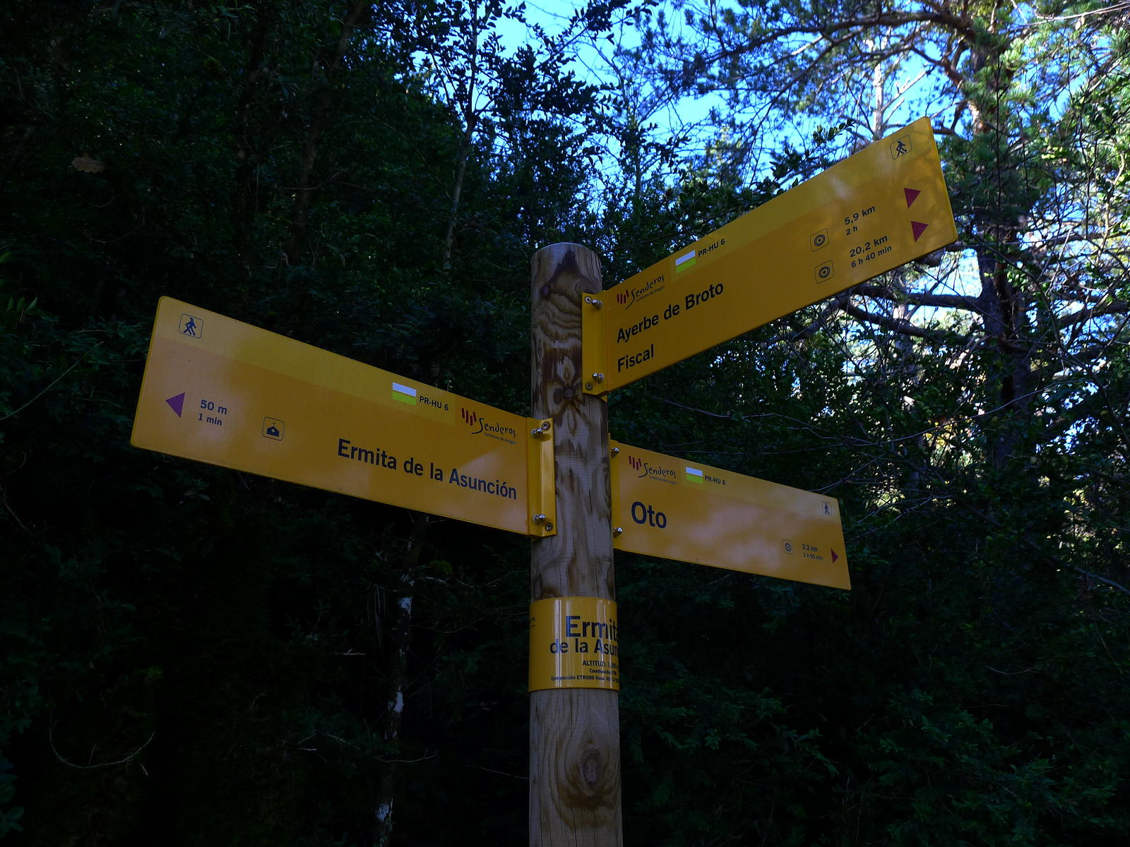 Habrá que seguir la pista que hace varias curvas de herradura y estar atento para tomar un desvío a la izquierda (1360m 4h44′) que no está señalizado. Este camino pasa junto a un campo de manzanos y baja a la ermita de la Asunción (1290m 4h51′). A partir de aquí se sigue el PR-HU-6, que es una agradable senda entre el pinar, primero, y el quejigal, más abajo.