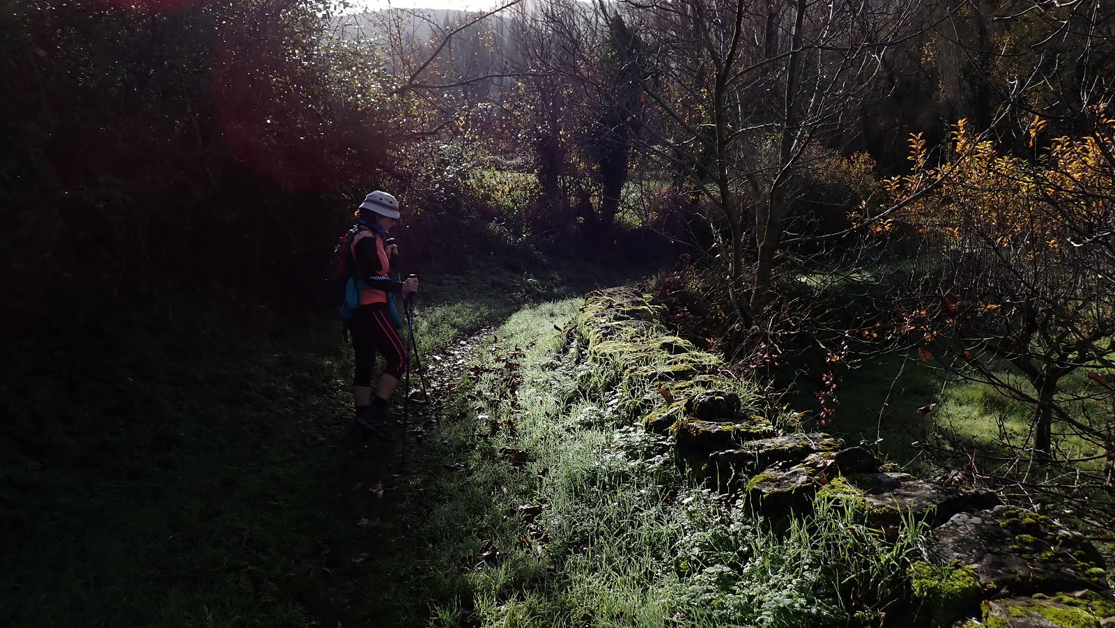 Siguiendo esta carretera a la derecha llegamos al Parador de Oroel (1175m 1h54′) donde hacemos una pequeña parada. Aún hay que continuar por la carretera unos metros más hasta que aparece una senda a la derecha (1165m 2h09′) que desciende a un cruce de caminos donde tomamos la pista a la derecha. Dejamos la pista por un sendero a la derecha (1110m 2h17′) marcado con un hito. Este sendero desciende un poco abarrancado, es la parte más complicada del recorrido, pero para nada difícil. Enseguida mejora y se convierte en un agradable camino que llega a un llano un poco más aclarado, la fuente de Barós (1045m 2h27′).