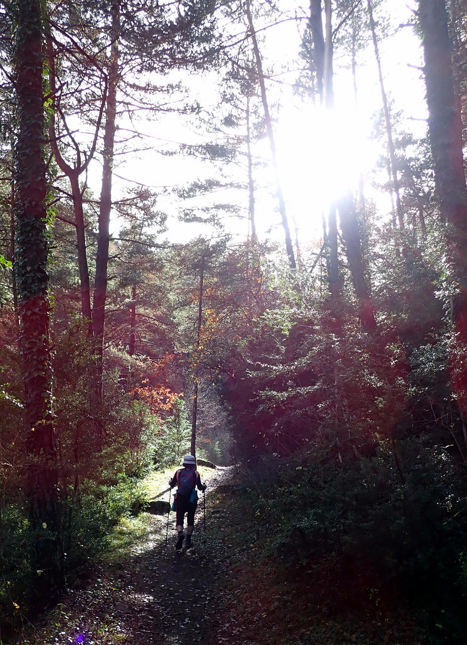 Cruzamos el barranco (935m 0h51′). Aunque el barranco se encajona un poco, el camino sigue siendo suave y agradable, hasta que gira a la derecha (SW) y empieza a tener un poco más de pendiente. Encontramos algunas bifurcaciones pero seguimos siempre el que claramente es el camino más principal. Un tramo está incluso acondicionado con troncos que forman peldaños para hacer más cómoda la subida. Después nos internamos en una zona de pinar más llana que va a salir a la carretera (1170m 1h40′) que une el Parador de Oroel y el pueblo de Navasa.