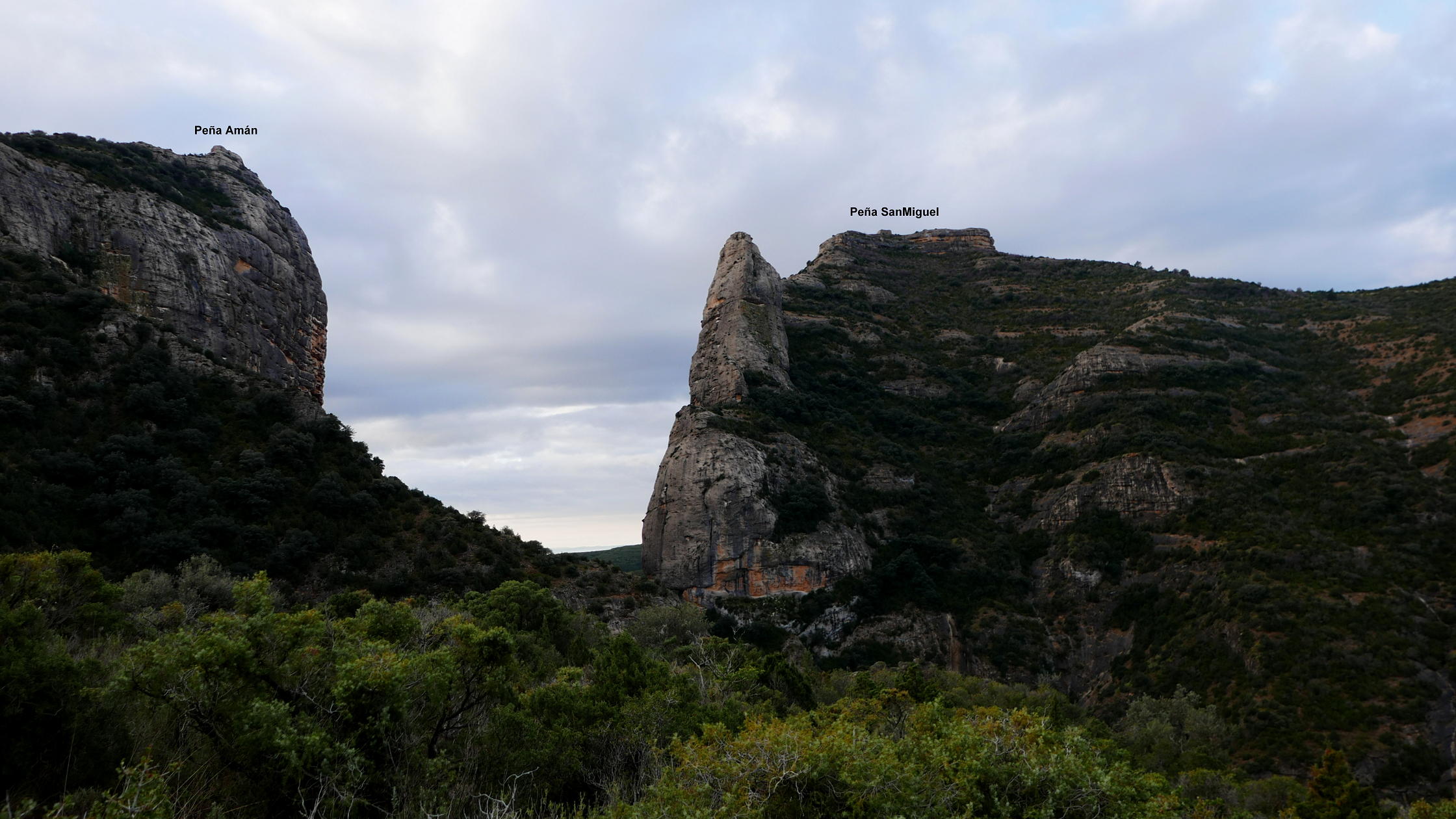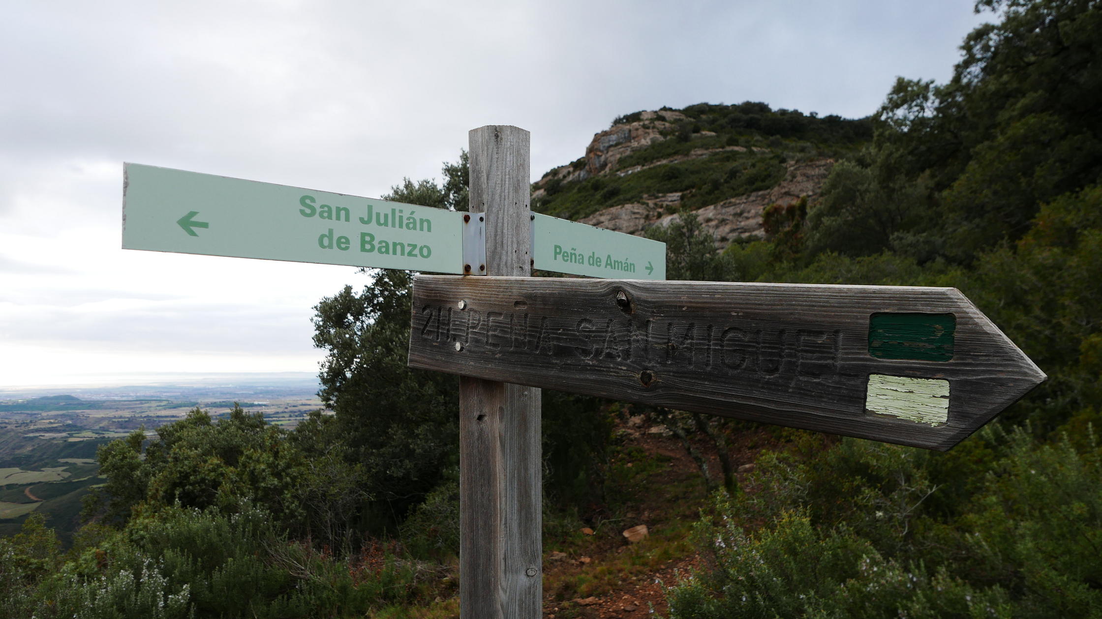Acceso: Quedamos en el pueblo de Nueno, al que se accede desde la autovía A-23 (KM 374-375). Allí tomamos la HU-V-3241 a Sabayés. Pasado este pueblo tomamos a la izquierda la HU-V-3243 a Santa Eulalia de la Peña. Antes de llegar a Santa Eulalia sale a la derecha una carretera muy estrecha y con firme muy desconchado que llega al aparcamiento bajo la Peña San Miguel.