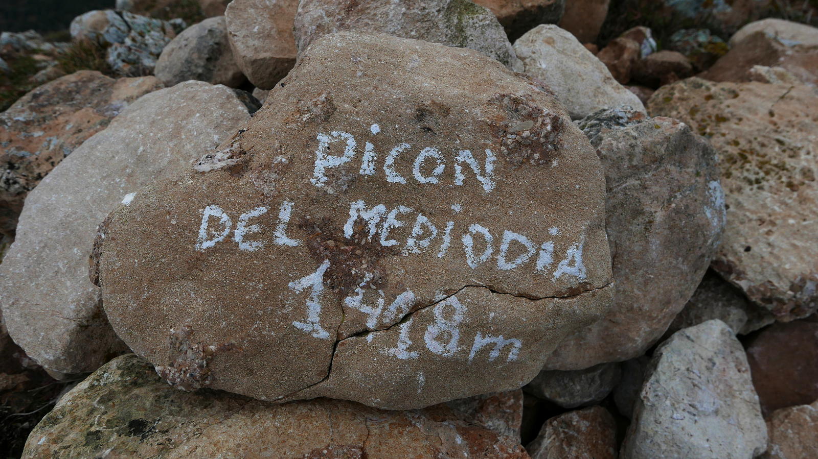 El camino que seguimos se introduce en el barranco del Águila, poblado de carrasca y boj, con apenas desnivel hasta cruzar el barranco (1170m), punto en el cual seguimos recto hacia el Picón y luego bajaremos hasta aquí para tomar la senda de la izquierda (ENE). Duras rampas, empezando a pisar roca, nos dirigen a las murallas del Picón. De vez en cuando hay que fijarse en los hitos para no perder la ruta. Un muro vertical se salva con una cuerda fija y una pequeña travesía horizontal con una cadena. Tras este paso se gira a la izquierda y queda aún una buena subida por senda zigzagueante hasta la cima del Picón del Mediodía (1418m 2h56′).