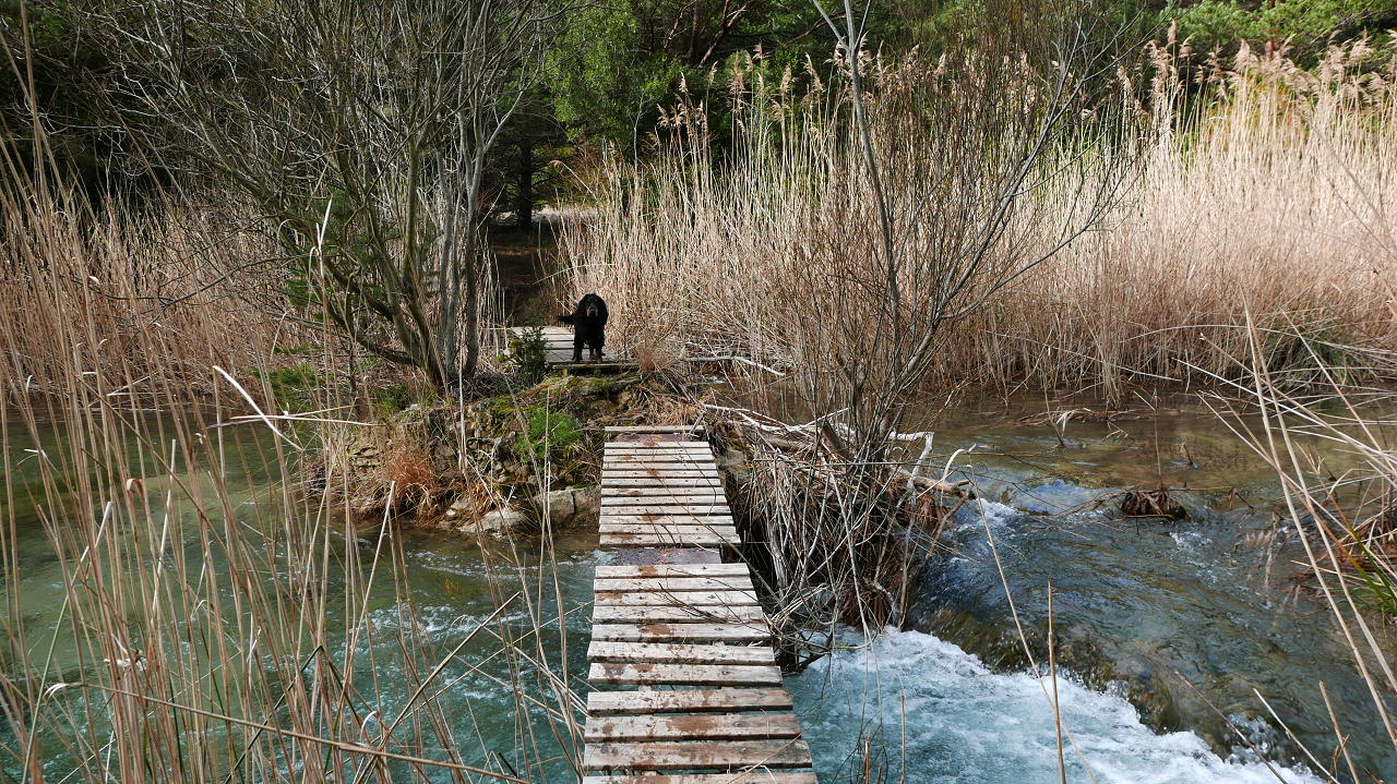 Volvemos sobre nuestros pasos hasta el barranco del Águila (1170m 3h26′) donde tomamos la senda, un poco escondida, que asciende al collado SW del Picón (1251m 3h43′), baja suavemente rodeando el Picón por el oeste y por el sur, cruza el barranco de las Gorgas y vuelve a ascender para sobrepasar las crestas de Valleclusa (1235m 4h05′). Un fuerte descenso nos lleva a la vaguada del barranco de Valleclusa, vaguada que seguiremos por un bonito camino boscoso en el que encontramos un jabalí muerto. El barranco desemboca en el río Flumen, hay que seguir un poco el cauce aguas abajo para encontrar el puente de tablas (735m 4h50′) y cruzar a la orilla derecha.