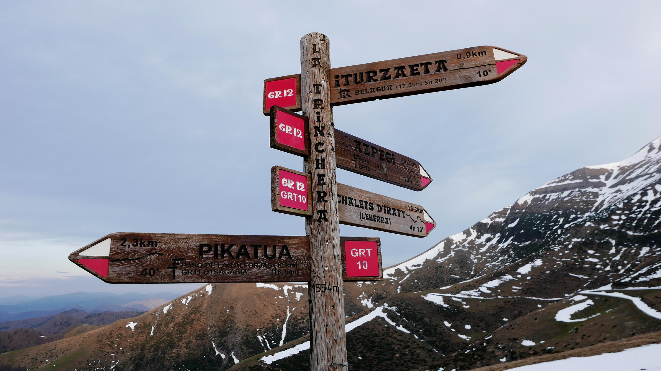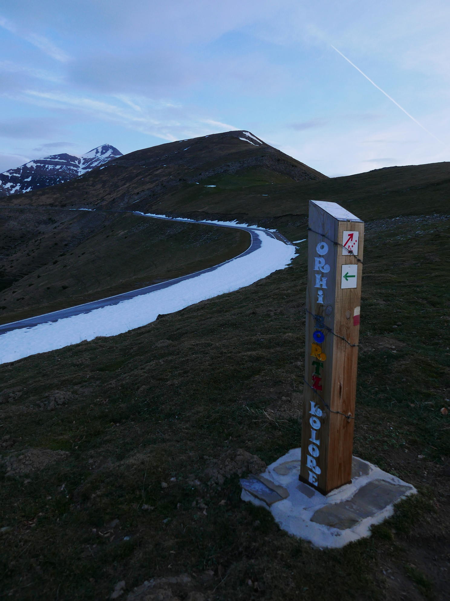 Descripción de la ruta: Estación de esquí nórdico de Abodi (1340m). La estación de esquí está cerrada. A la derecha hay un ensanche con aparcamientos. Comienzo andando por la carretera y en aproximadamente 1km salgo de la carretera (1395m 0h14′) hacia la derecha tomando los campos de pasto donde entronco con el GR-12, subiendo suavemente hacia la cresta. Sin llegar a ella el camino va faldeando entre la carretera y la cresta hasta unos carteles (1560m 0h41′) donde se cruzan el GR-10 y el GR-12 (sigo la dirección Azpegi y Chalets de Iraty). Un poco más adelante paso sobre el túnel del puerto de Larrau (1605m 0h49′) y empiezo a avanzar por la cresta.