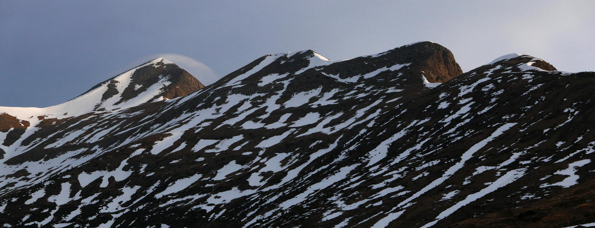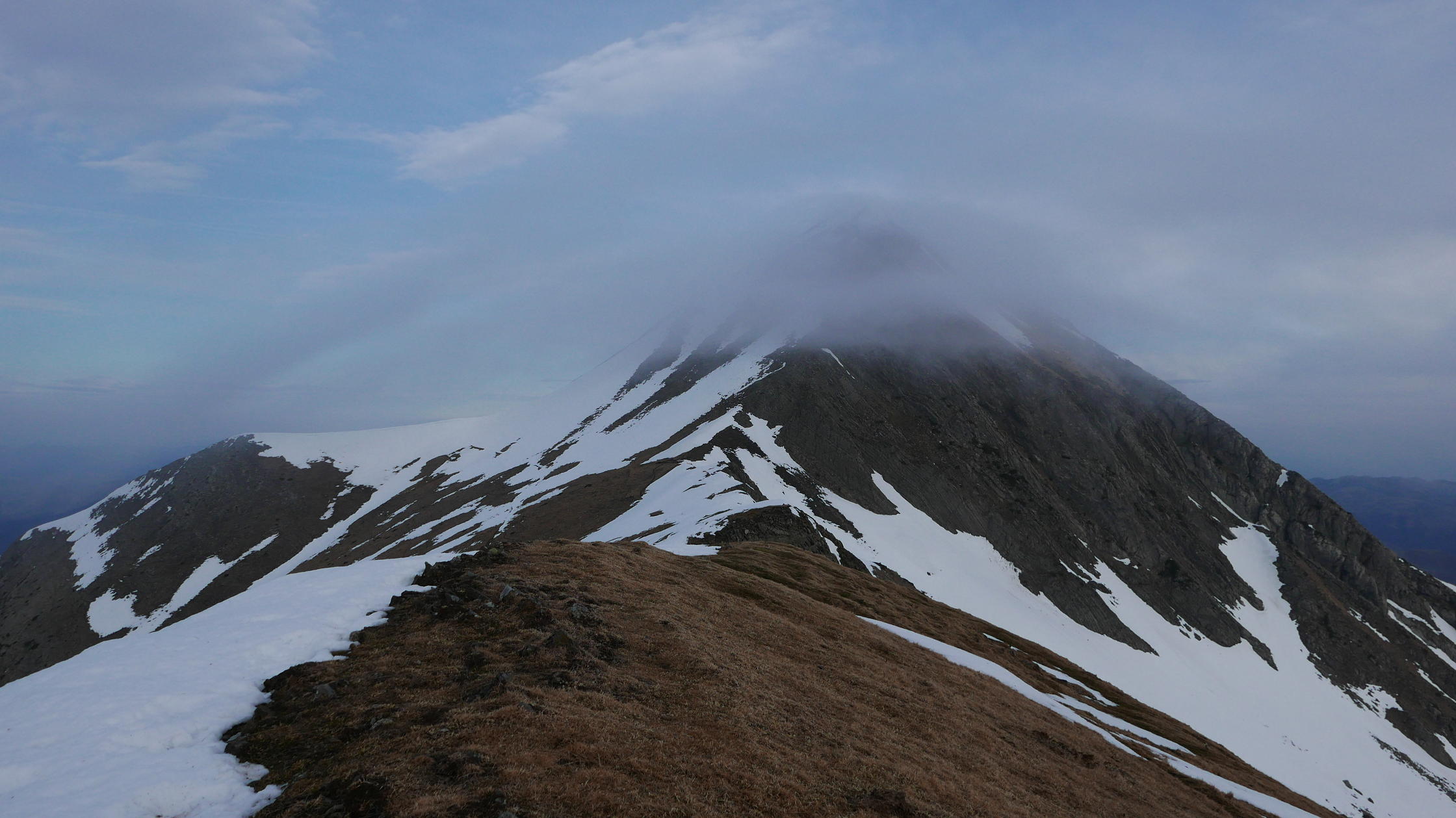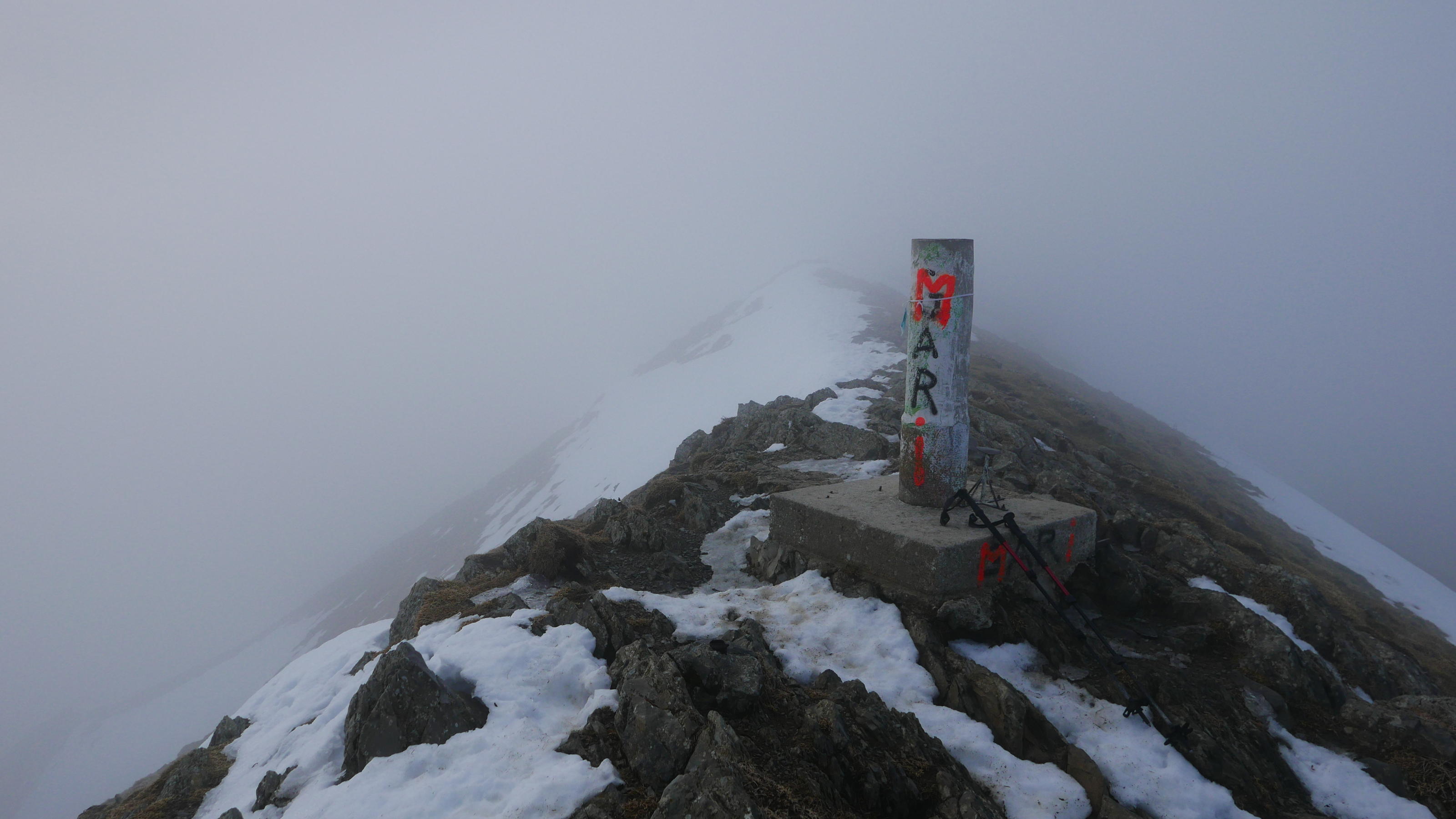 Tras estas disquisiciones orográficas hay que decir que es una montaña que no presenta grandes dificultades, pero hay algunas zonas de fuertes pendientes por terreno inestable, así que hay que tener cierta precaución, y puede ser hasta peligroso con nieve. Yo hoy me he encontrado con algunos neveros pero no he necesitado ni piolet ni crampones (que iban en la mochila, por supuesto). Como veis en las fotos, la cima se ha cubierto con una nube y la parte final ha resultado dura por el viento y el frío, y la visibilidad era casi nula.