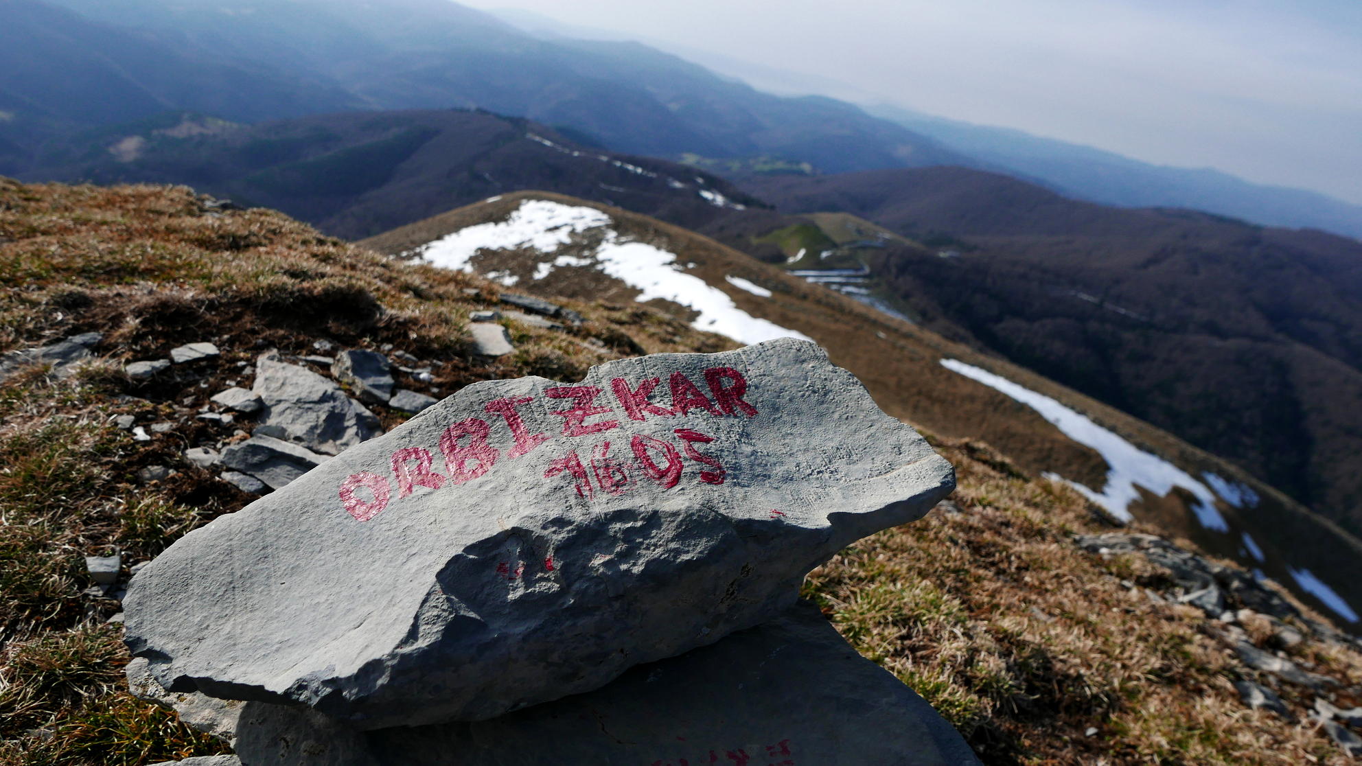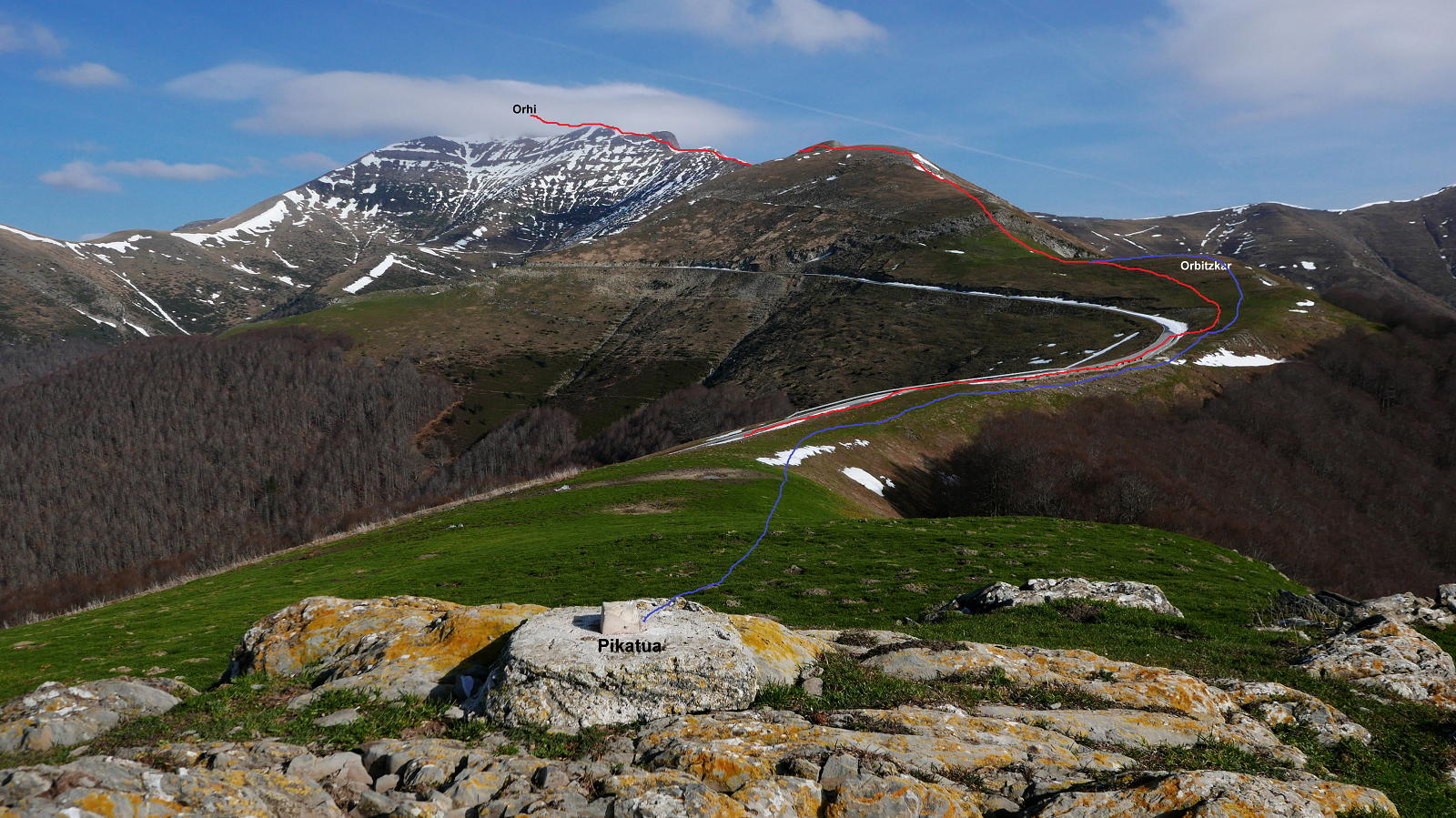 Hago el descenso por el mismo camino hasta los carteles donde se cruzan los GRs y desde aquí subo la suave cresta de pasto al Orbizkar (1605m 2h50′). Continúo por la cresta a la cota Pikatua (1408m 3h11′) y desciendo para hacer los últimos metros por la carretera al aparcamiento (1340m 3h17′)