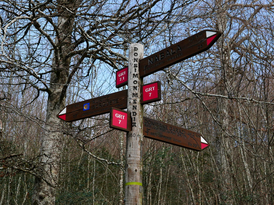 Descripción de la ruta: Roncesvalles (935m). A la derecha del aparcamiento sale una pista que cruza el arroyo Arranosina. Es una ruta para bicicletas y GR-7.1. Enseguida hay un sendero a la izquierda por donde volveré a la bajada, ahora sigo recto (960m 0h08′) por la pista principal, dirección Nabala. Más adelante una bifurcación que tomo a la izquierda (950m 0h17′) y paso el barranco Patxanberro. Después una valla con paso canadiense y otra bifurcación a la izquierda (1015m 0h27′) dirección Hiriberri.