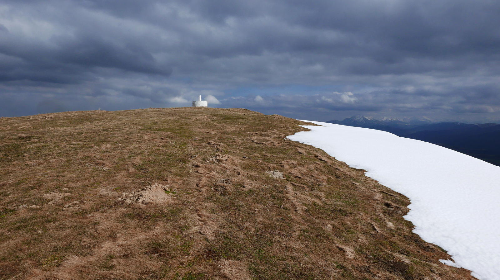 Así hasta que confluyen las crestas y hay un hito (Laparordokigaña 1404m 1h08′). Aquí hay que girar a la derecha (norte), no hay camino, hay que pasar entre hayas más jóvenes, bosque más cerrado, hasta encontrar una traza de senda más clara que antes y por bosque más abierto. Finalmente salgo del bosque (1440m 1h17′) y empieza un camino claro entre el brezo que ya se dirige a la cima del Ortzantzurieta (1564m 1h35′). Hay un gran vértice geodésico al que se puede subir gracias a dos huecos estratégicos en su base para poner los pies y trepar. La tarde está muy nublada, así que casi no tengo vistas de los montes que me rodean. Bandadas de grullas vuelan ya hacia sus zonas de reproducción en Escandinavia.