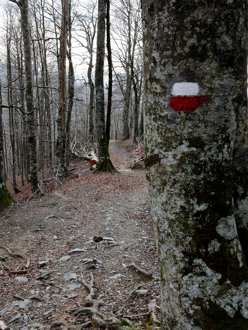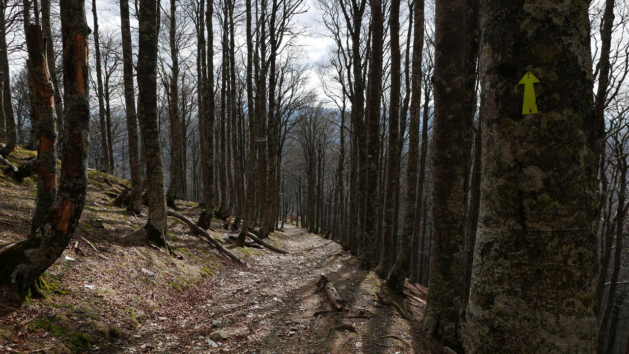 Por el pasto tomo unas rodadas que van girando un poco a la derecha hasta desembocar en una pista (1470m 2h04′) con gravilla muy prensada, prácticamente asfaltada . Evito una curva por un atajo a la izquierda, vuelvo a la pista y luego hay una bifurcación, dejo la pista asfaltada y tomo el ramal de la izquierda (suave collado 1397m 2h14′) que es una pista pco usada. Después me desvío sin camino (si siguiera por el camino llegaría al collado Lepoeder y tan solo alargaría unos metros) para descender por una zona de brezos y conectar con un camino (1380m 2h25′) señalizado con flechas amarillas (Camino de Santiago) y marcas rojas y blancas (GR). Desciende suavemente por el hayedo y es muy agradable, sobre todo en comparación con la subida; en otoño tiene que ser precioso.