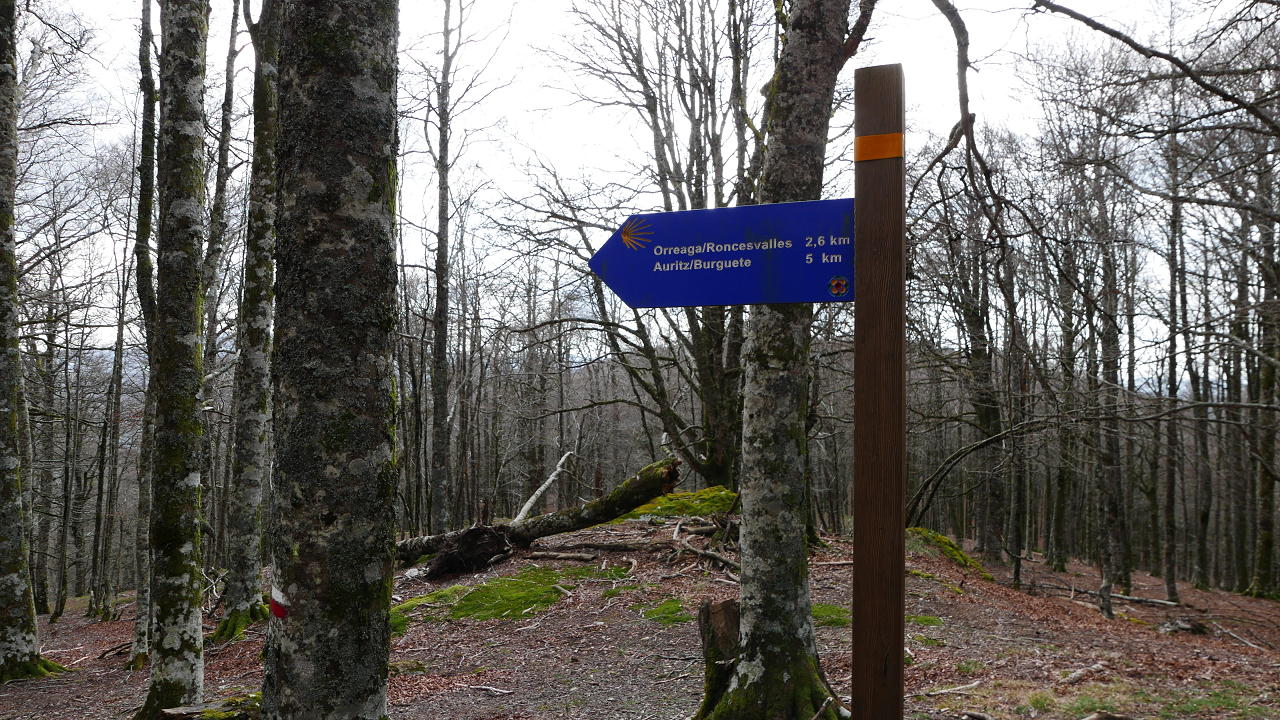 Desemboca en el punto de confluencia con la pista de subida (970m 3h03′) desde donde llego en unos minutos a Roncesvalles (935m 3h09′).