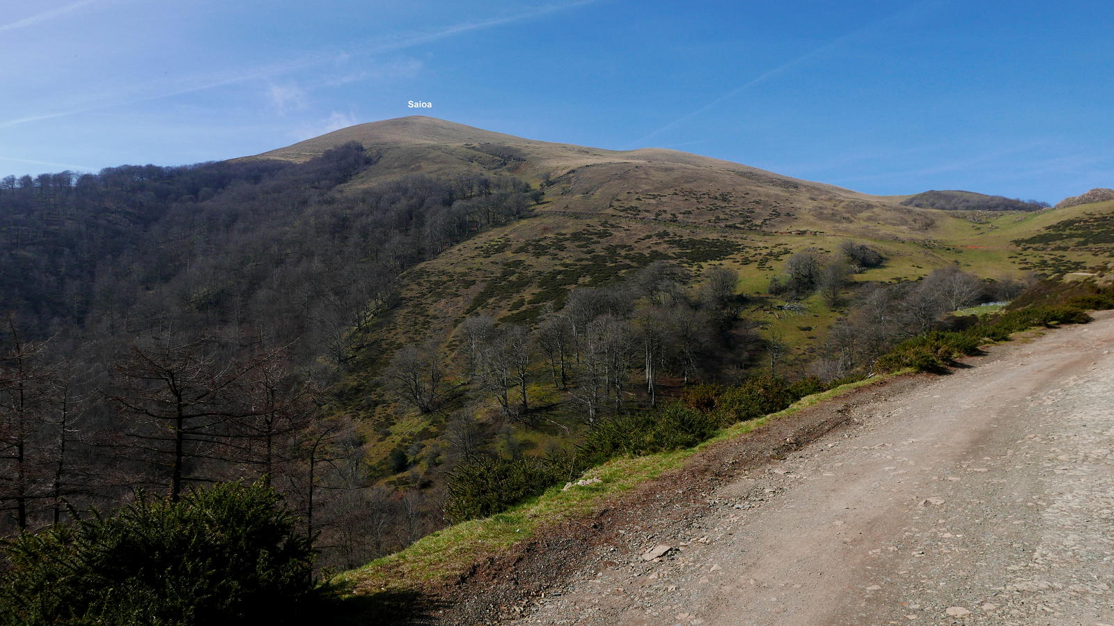 Para el descenso continúo dirección SSE siguiendo los postes de GR-322 que descienden al collado Sagardegi (1240m 1h08′) (hay un poste caído en el suelo). En este collado vuelvo a tomar el GR-12. Giro a la izquierda (este) para bajar campo a través hasta un camino que tomo hacia la izquierda y que de nuevo atajo en la primera curva cerrada a la derecha. Me reencuentro con el camino junto a una borda y ya lo sigo hasta que se transforma en pista y me lleva, faldeando el Saioa por el este, a la confluencia con la ruta de subida en Zirola y, finalmente, al puerto de Artesiaga (980m 1h49′)