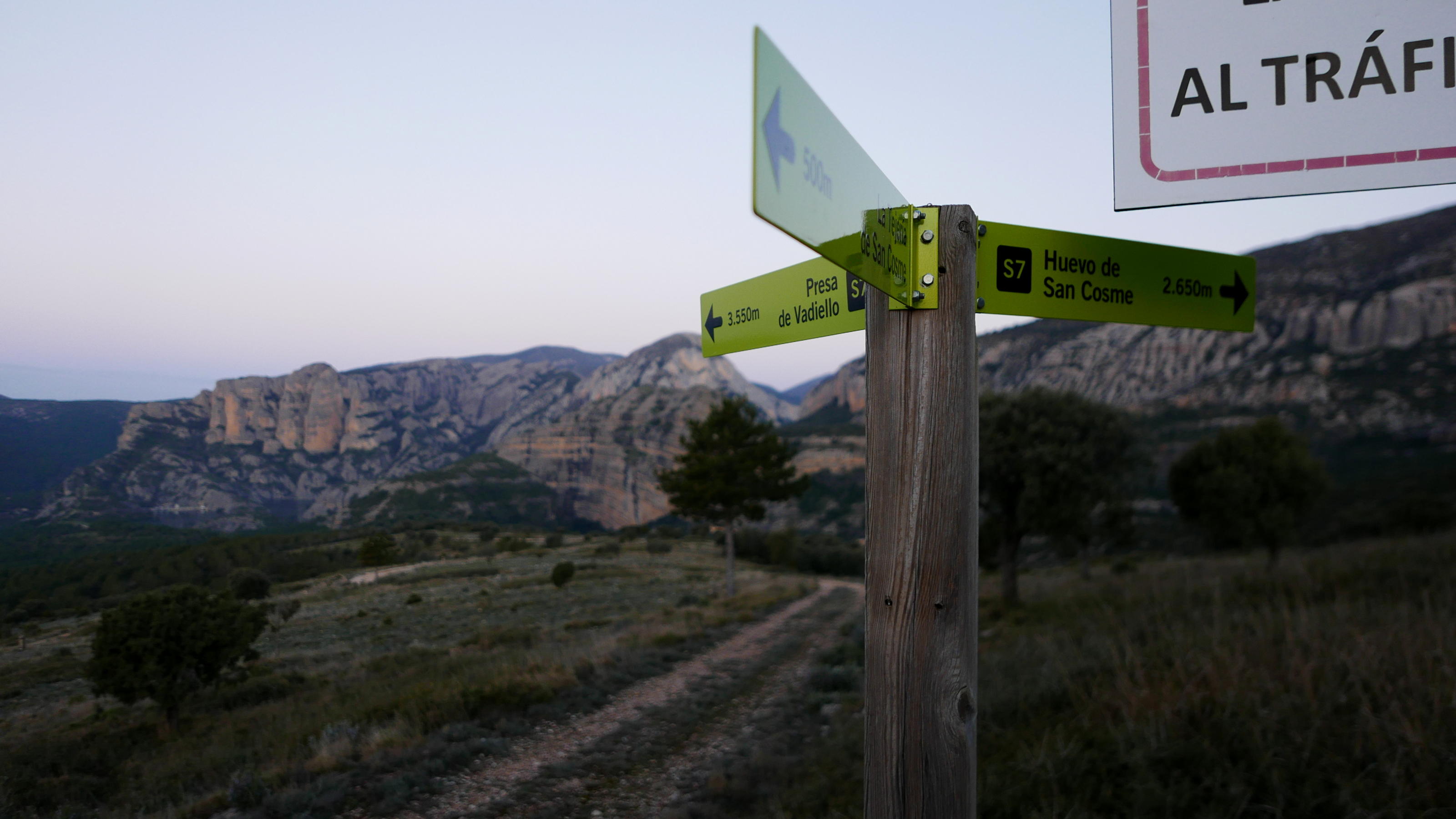 El camino se separa del cauce, gira al sur y SW y va en ligera subida pasando por la ermita de Faban (935m 2h47′). Se cruza otro barranco donde gira al SE encontrando otro cartel hacia la Tejería (885m 2h54′) (a la derecha al Alto de la Carrasca). Solo hay que seguir el camino principal para llegar al aparcamiento de La Tejería (915m 3h04′)