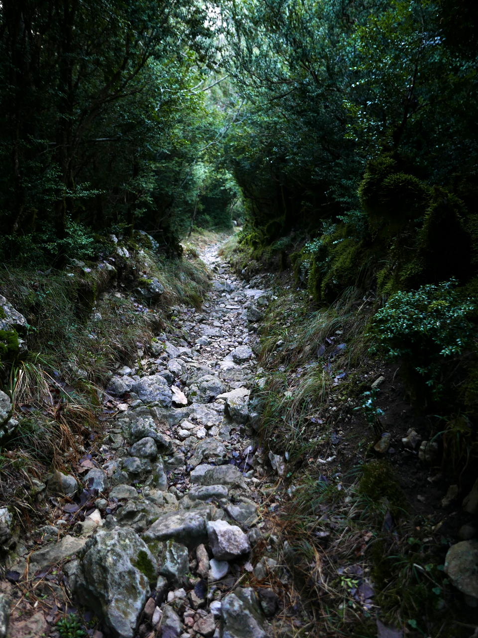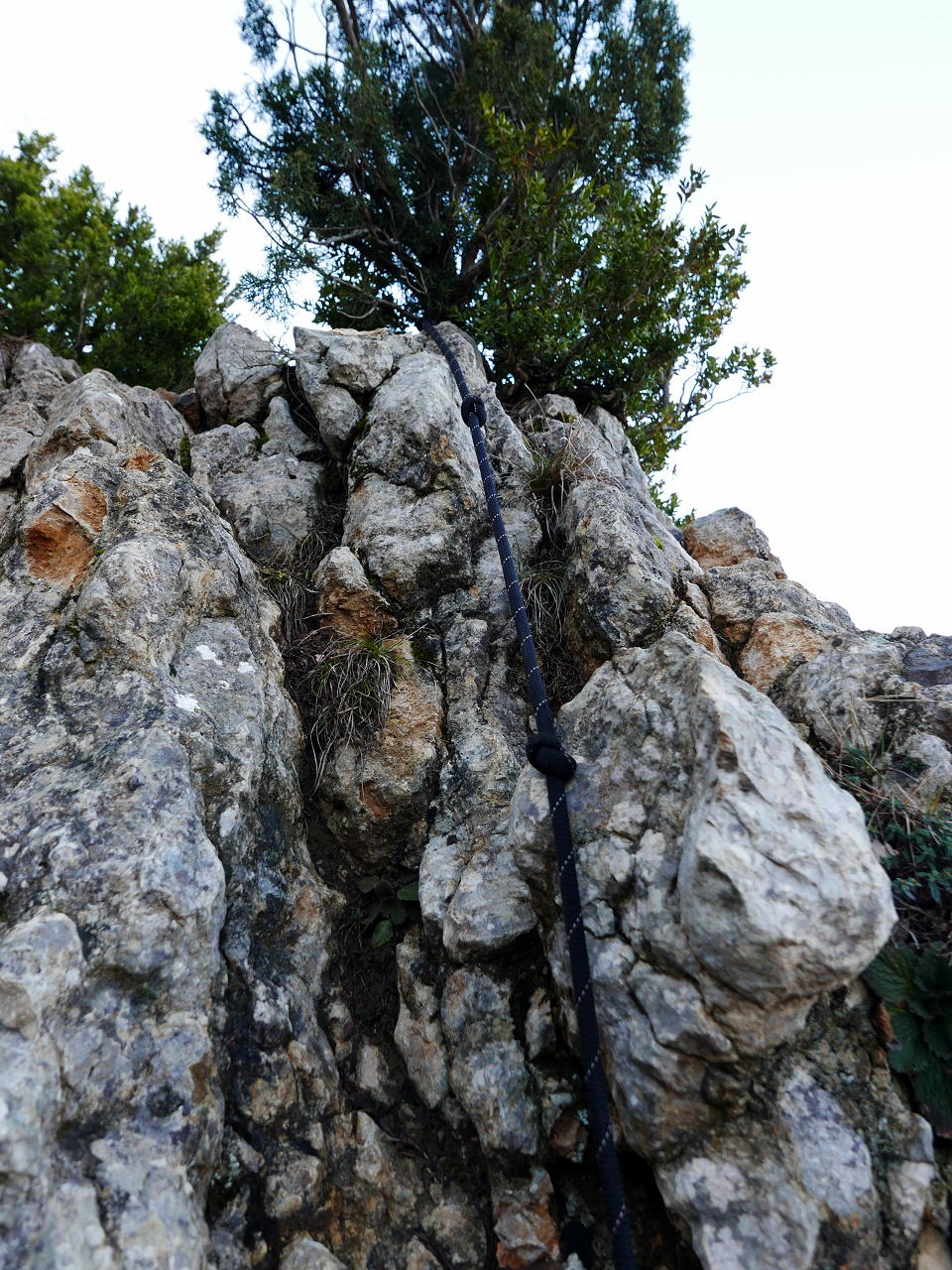 Ahora hay que buscar el descenso. Unos hitos justo al norte del cúmulo de piedras de la cima marcan la salida. Hay que bajar con cuidado, es muy pendiente, pero la senda está bien abierta entre los altos bojes. Se pasa por una explanada más abierta (1415m 1h29′), luego giro a la izquierda al llegar a un resalte, siguiendo por su filo hasta que se encuentra el paso para descenderlo. Poco después te encuentras otro resalte rocoso donde hay una cuerda que facilita el descenso; es sobre todo muy útil si la roca está un poco húmeda como hoy. Poco después se llega a una pedrera (1320m 1h40′), pero no hay que bajar por ella demasiado, enseguida se sale hacia la derecha (fijarse en los hitos) y de nuevo entre la vegetación y llaneando o incluso en ligera subida se alcanza el collado de Fragineto (1294m 1h47′) o Cuello Lizana.