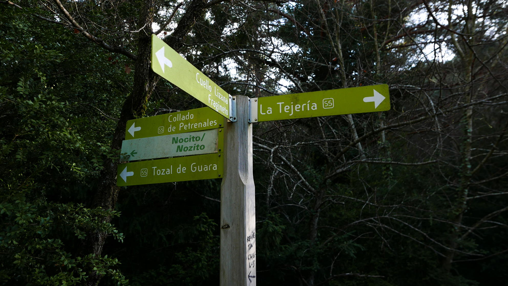 Giro a la derecha (este) tomando una buena senda que desciende por bosque al barranco de Calcón (1050m 2h04′) (Cartel que hay que seguir a la derecha hacia La Tejería, a la izquierda va a Collado Petrenales y Tozal de Guara). La travesía por el barranco es preciosa. Hay que cruzarlo o bajar algún tramo por el propio cauce en varias ocasiones, así que si el caudal es alto será muy difícil o imposible. Se sale del barranco (905m 2h38′) a un camino más ancho que continúa por la orilla derecha del cauce. Otro cartel (890m 2h40′) indica a La Tejería. El camino es muy agradable, entre bosque de carrasca al principio y pinar después.