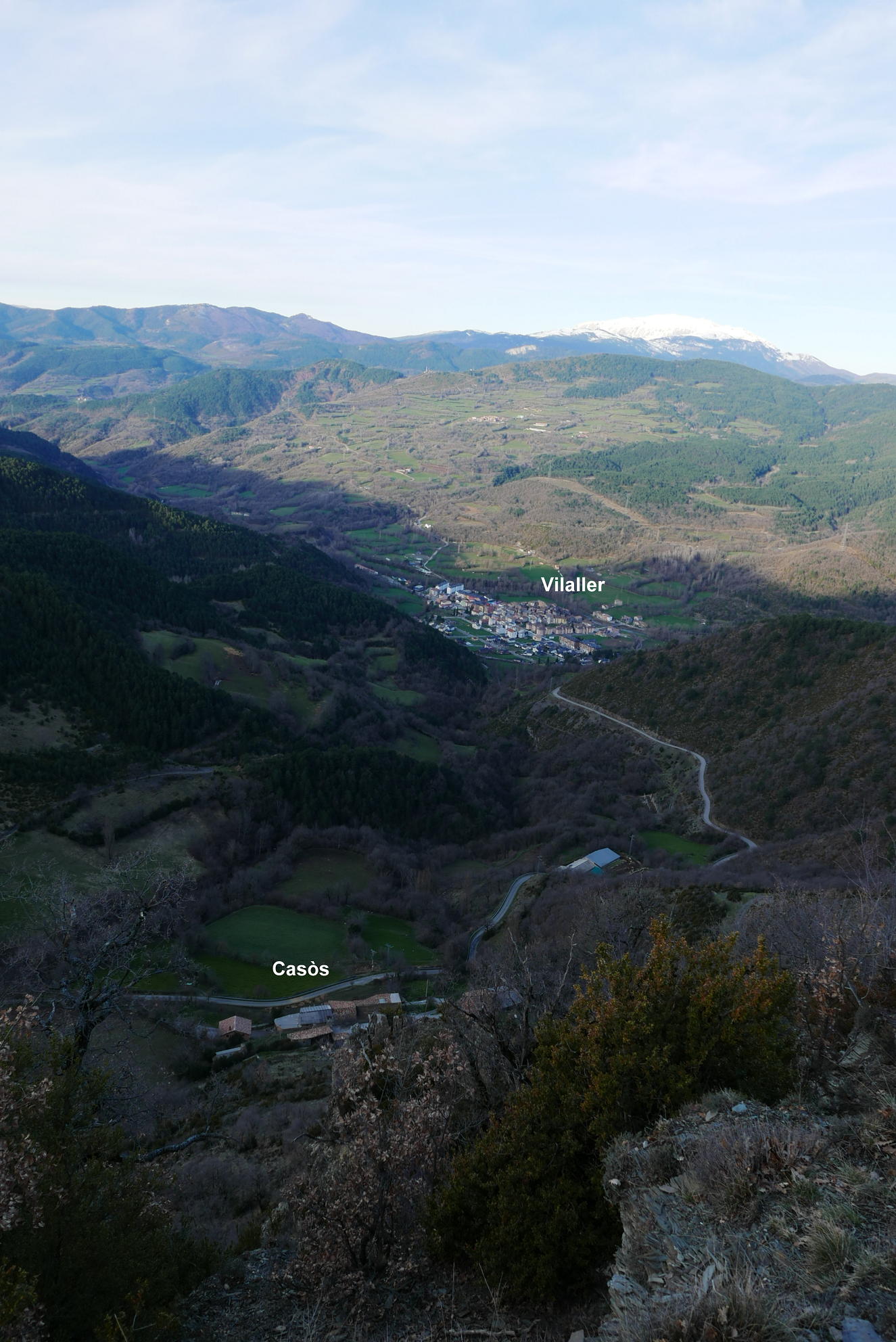 Acceso: Por la N-230 de Lleida a Vielha, nos desviamos en Vilaller a la derecha para tomar una estrecha carretera que sube a Casòs. Sin llegar a entrar en el pueblo, aparcamos en la pista que lo circunvala por arriba.