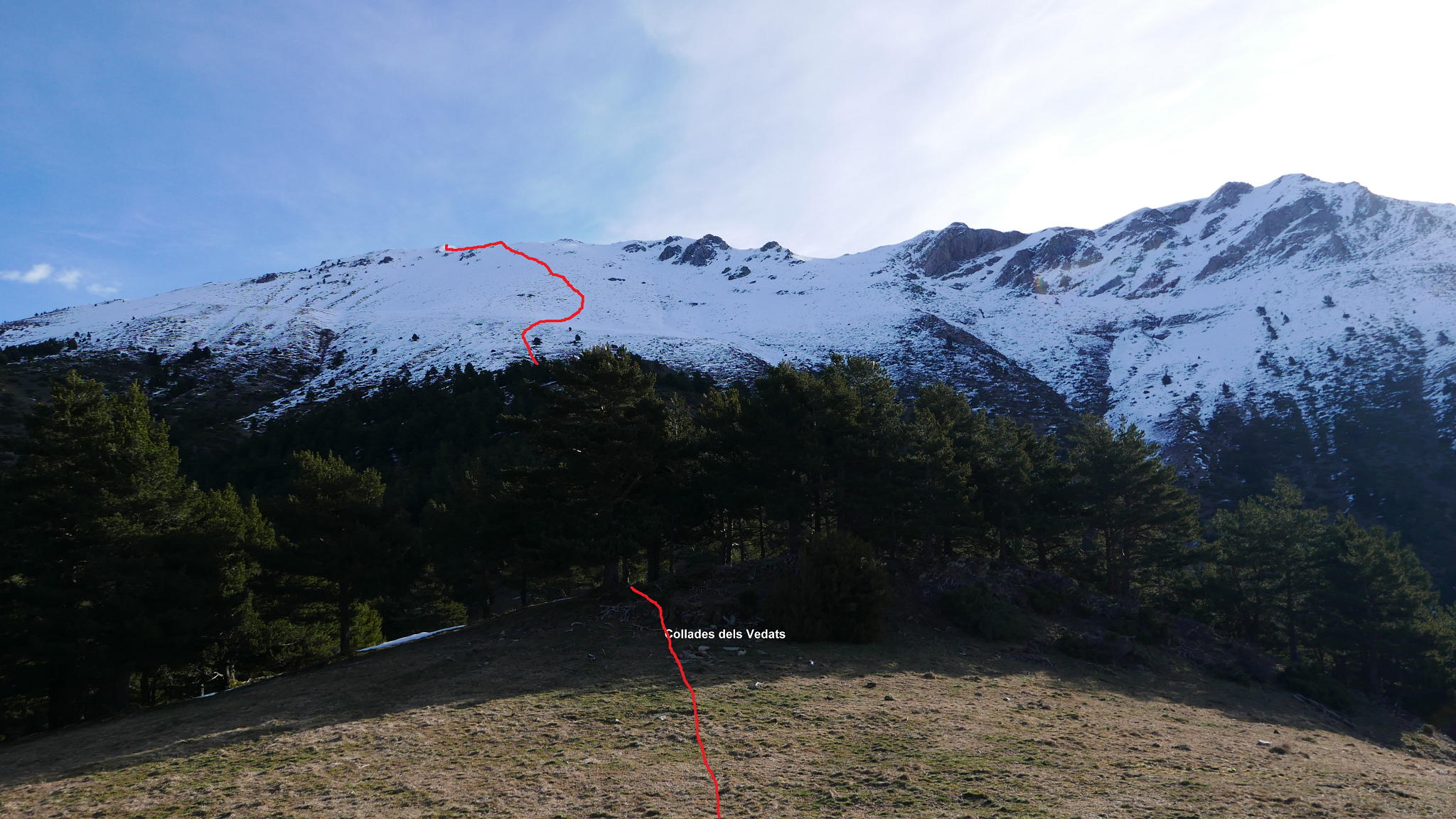 Continuamos dirección norte por traza de senda más difuminada también por zona boscosa. Se avanza bien. Nos introducimos por pinar y salimos a una zona despejada, Collades dels Vedats (1618m 0h55′) donde giramos a la derecha hasta desembocar en una pista (1640m 1h01′) que seguimos hacia la derecha y vuelve a girar a la izquierda en un hombro donde se toma el lomo en dirección este y NE., La pista avanza no por el mismo lomo sino un poco a la izquierda (ladera NW). Pasamos otro collado despejado (1740m 1h16′). Después dejamos la pista para subir decididamente al lomo y seguir una traza de senda entre pequeños pinos.