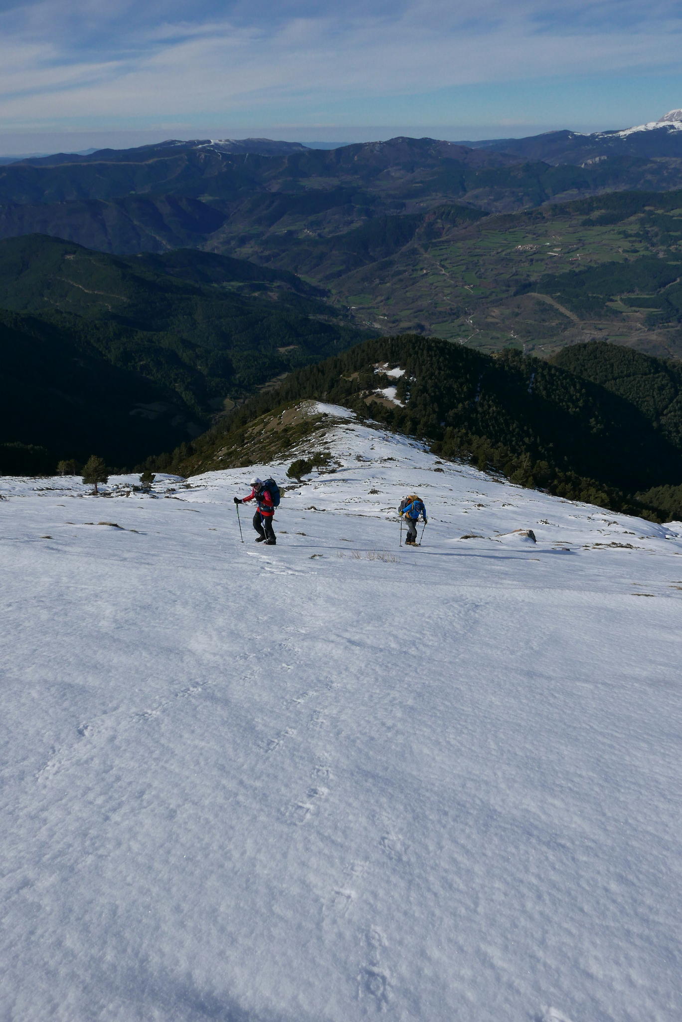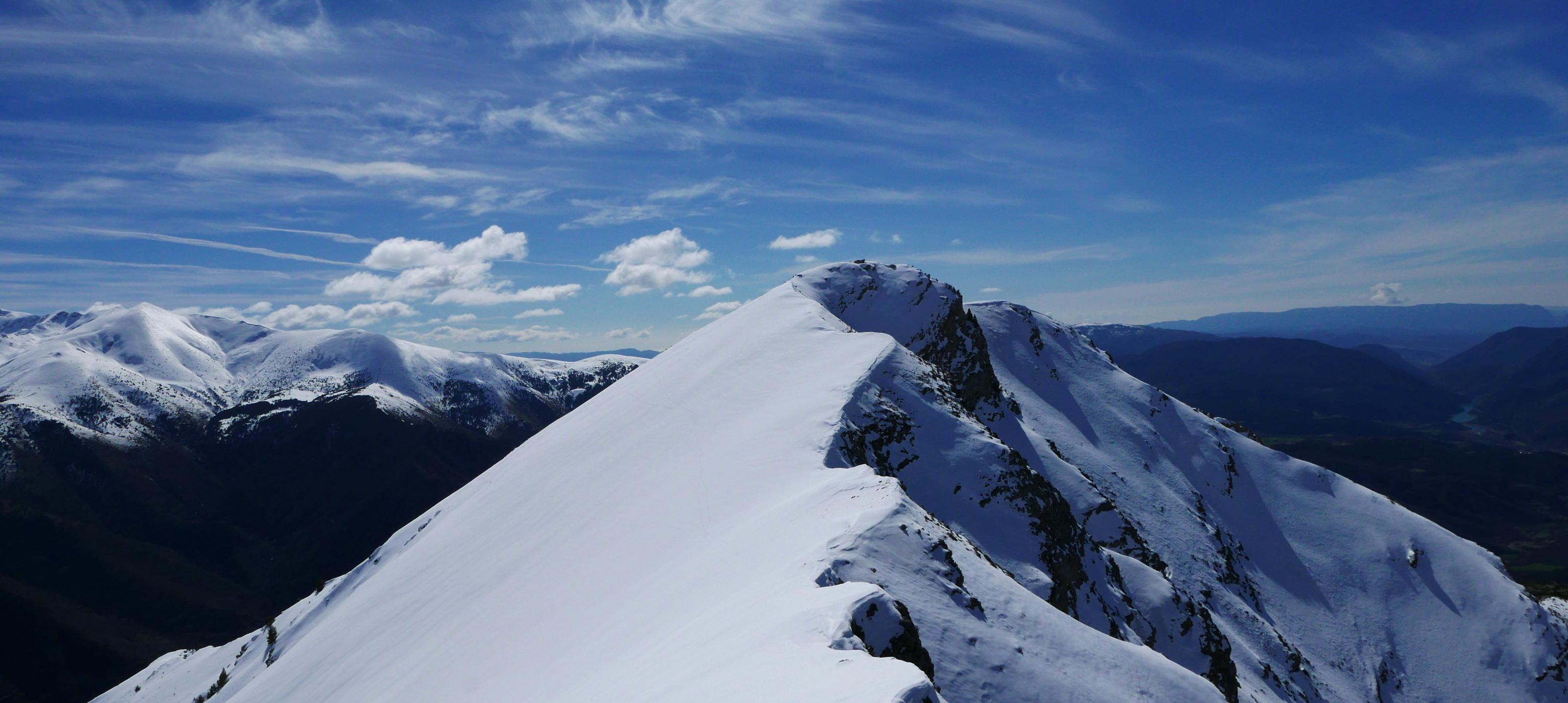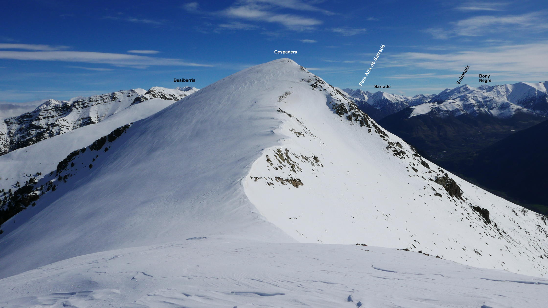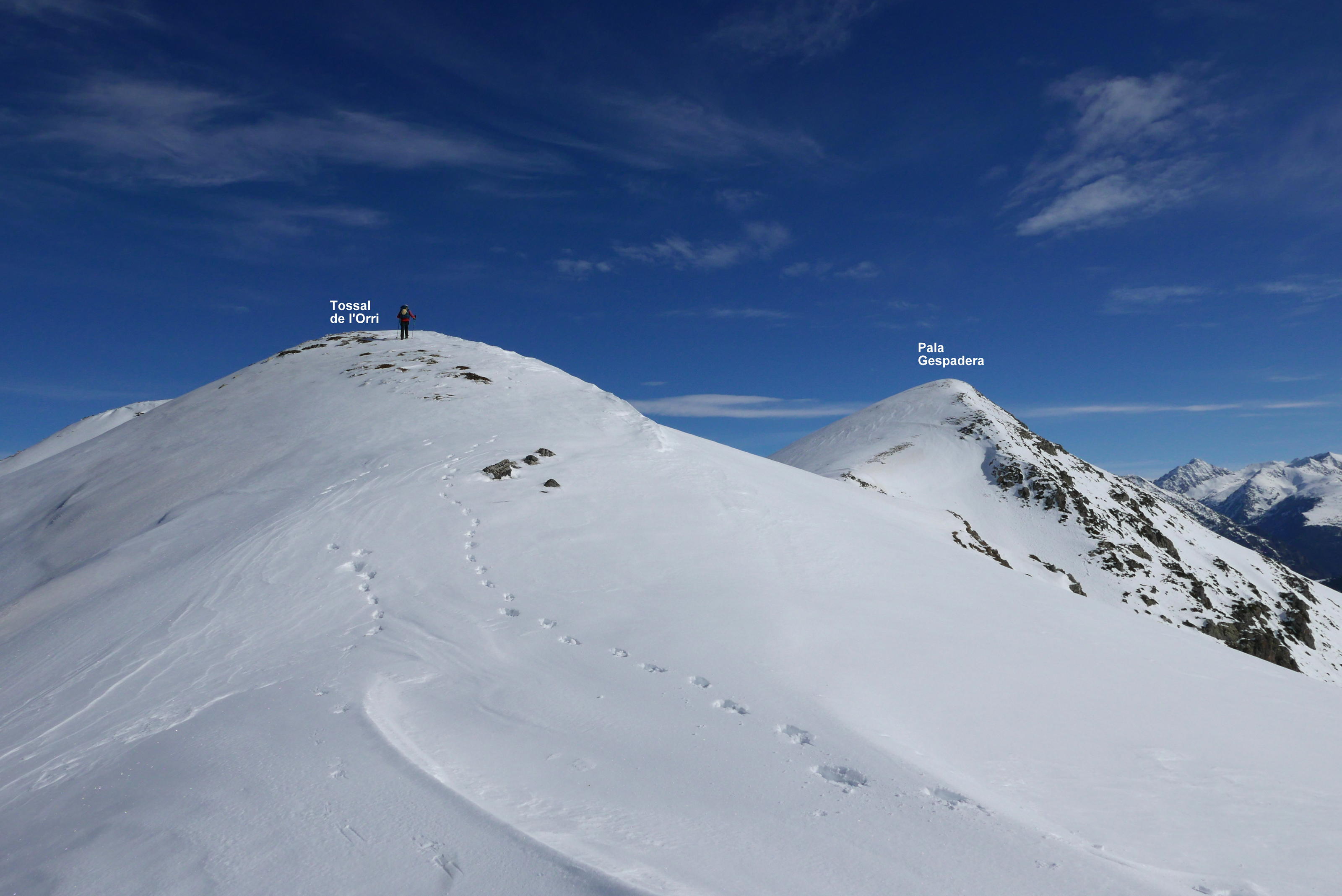 Poco a poco la vegetación va desapareciendo y aparecen zonas de nieve entre el matorral de enebro mientras nos vamos separando del lomo que queda a nuestra derecha. Aparece así la pala nevada que lleva a la cresta del Tossal de l’Orri. Ponemos los crampones y afrontamos directa esta pala con nieve dura y fuerte pendiente que nos exige un buen esfuerzo. Prácticamnete desembocamos en la cima del Tossal de l’Orri (2294m 2h32′), con magnífica vista y con nuestro objetivo final muy cerca. Hay que descender al collado que nos separa de la siguiente cumbre y ascender a la Pala Gespadera (2346m 2h50′).