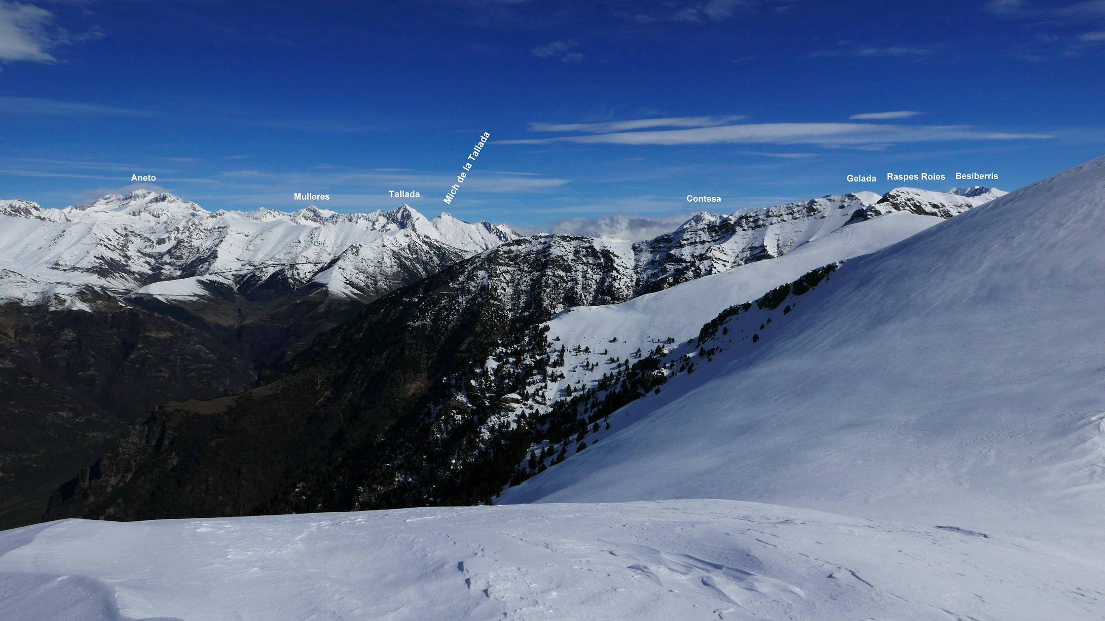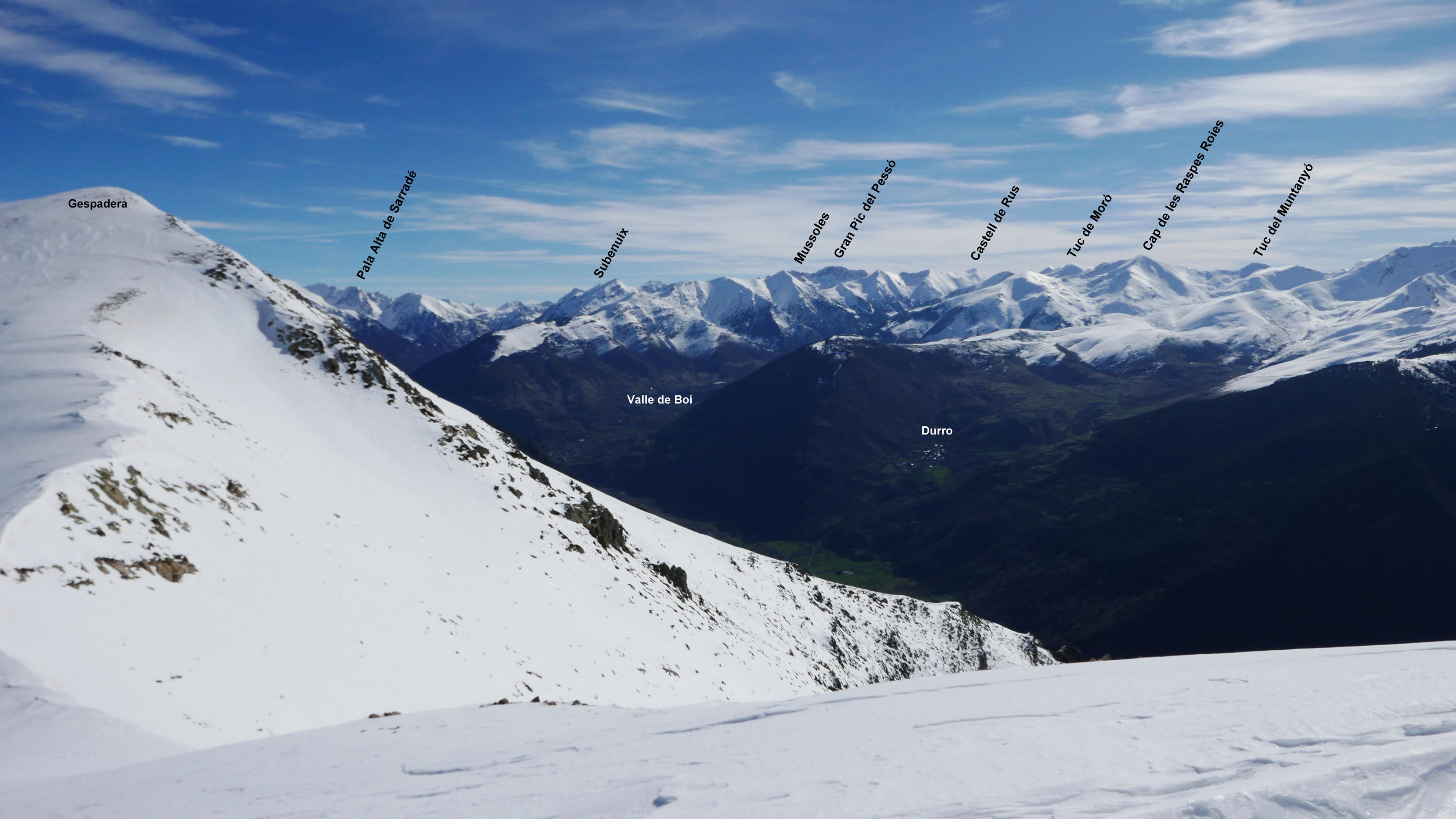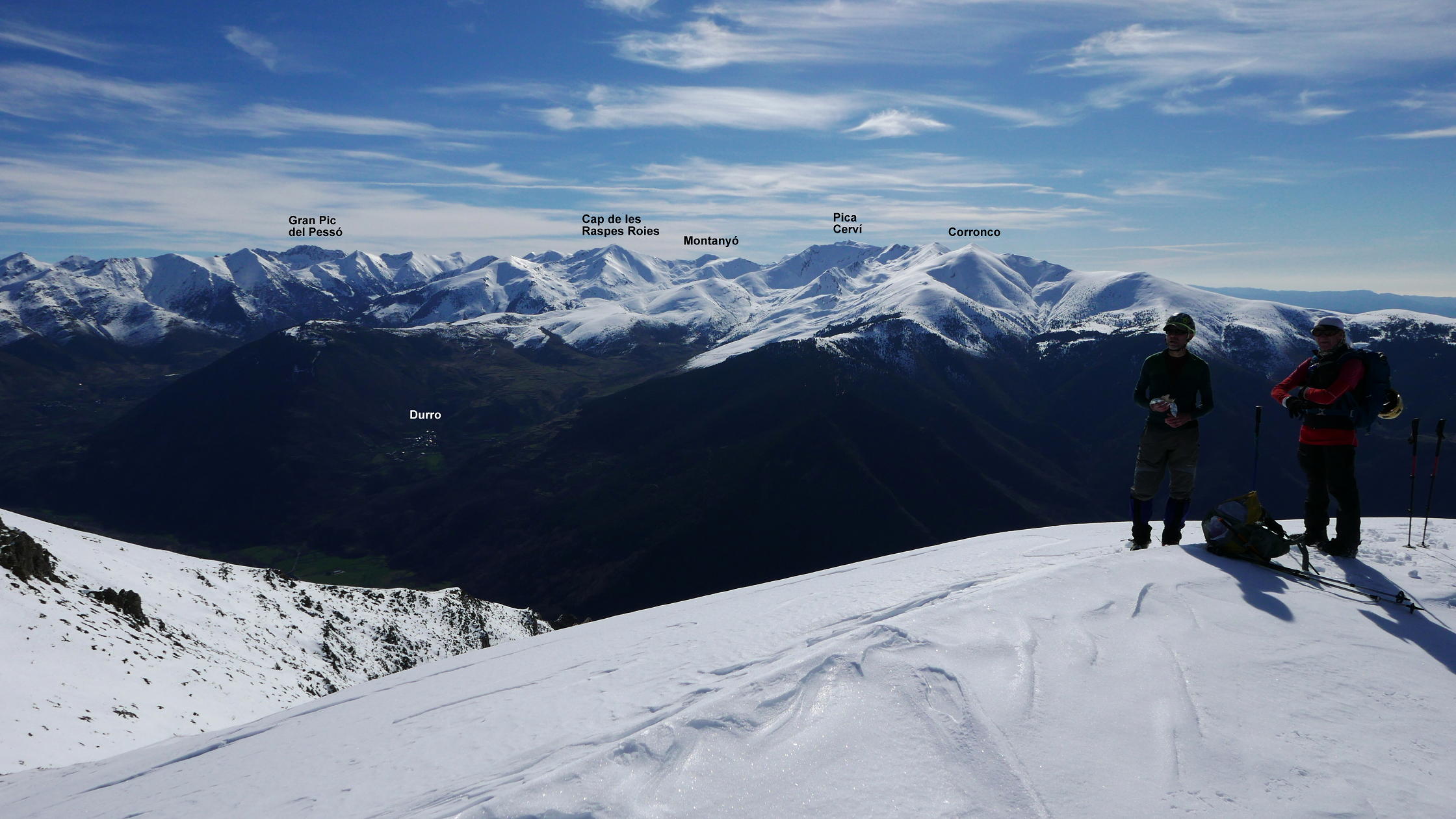 Poco a poco la vegetación va desapareciendo y aparecen zonas de nieve entre el matorral de enebro mientras nos vamos separando del lomo que queda a nuestra derecha. Aparece así la pala nevada que lleva a la cresta del Tossal de l’Orri. Ponemos los crampones y afrontamos directa esta pala con nieve dura y fuerte pendiente que nos exige un buen esfuerzo. Prácticamnete desembocamos en la cima del Tossal de l’Orri (2294m 2h32′), con magnífica vista y con nuestro objetivo final muy cerca. Hay que descender al collado que nos separa de la siguiente cumbre y ascender a la Pala Gespadera (2346m 2h50′).