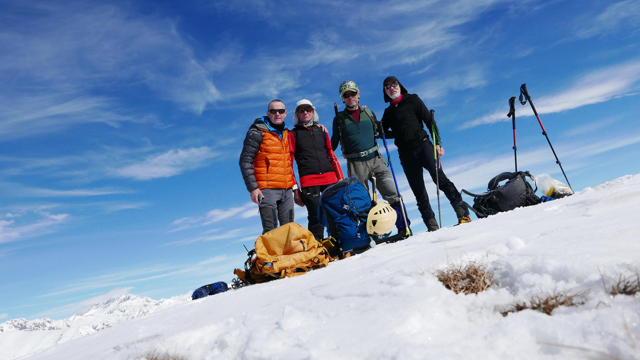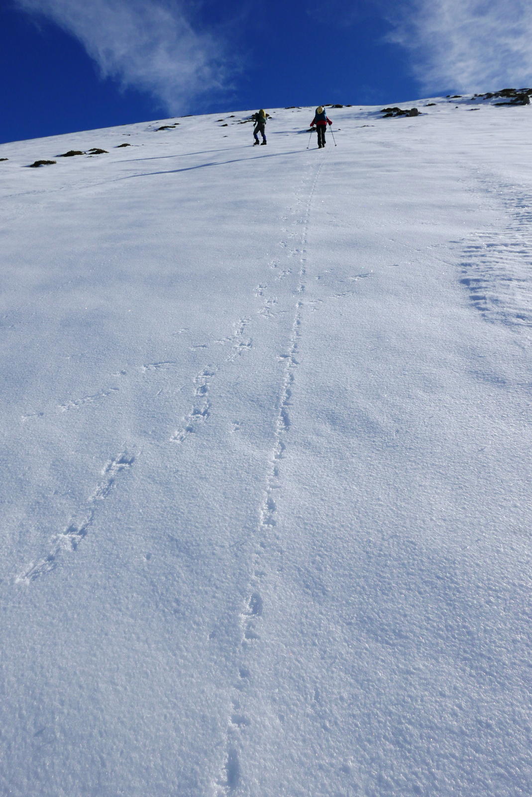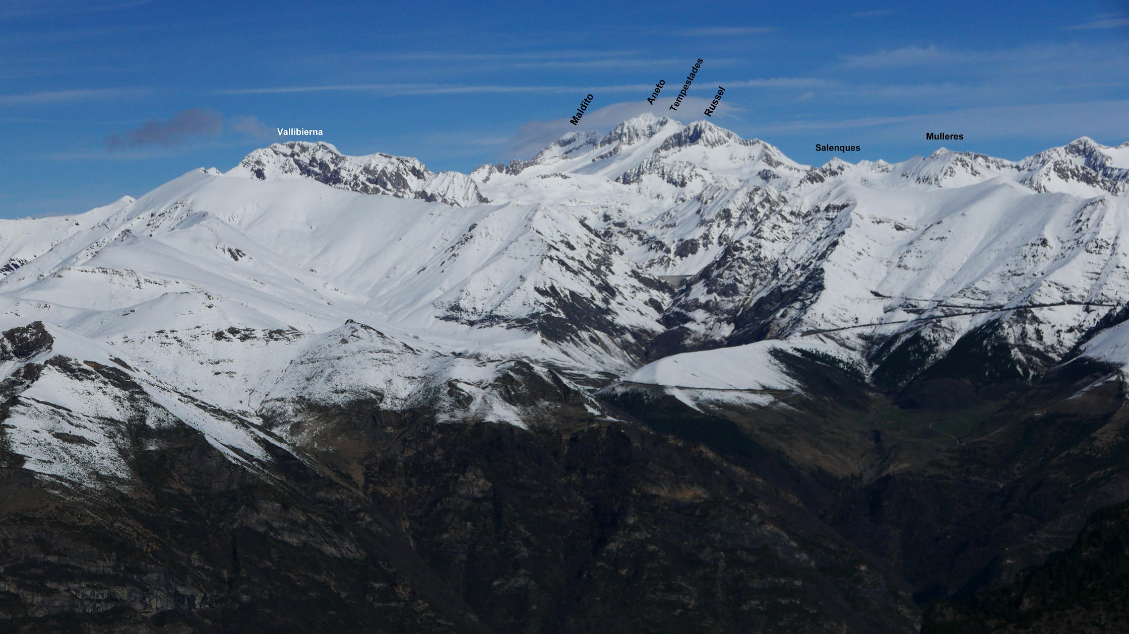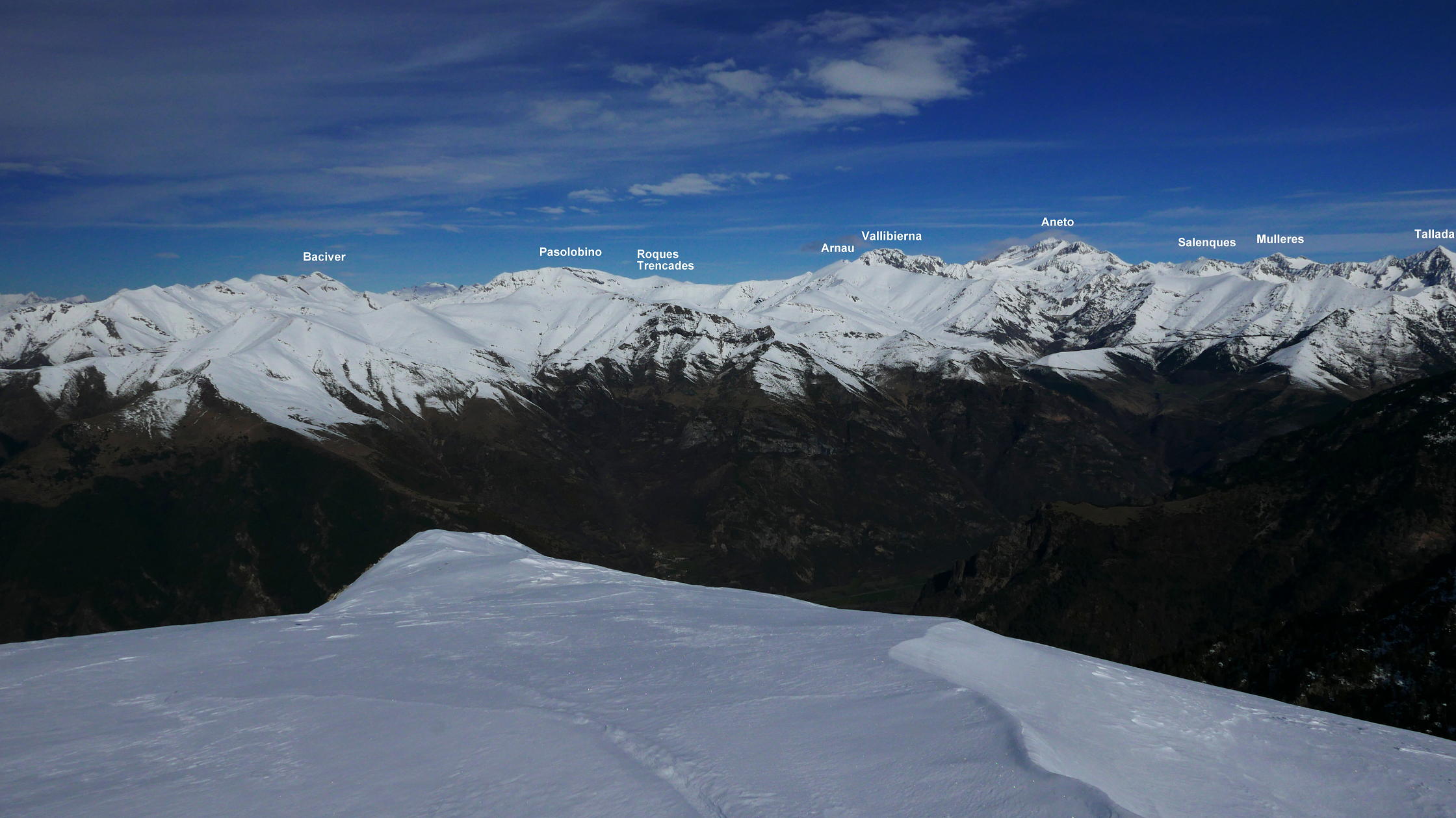 Poco a poco la vegetación va desapareciendo y aparecen zonas de nieve entre el matorral de enebro mientras nos vamos separando del lomo que queda a nuestra derecha. Aparece así la pala nevada que lleva a la cresta del Tossal de l’Orri. Ponemos los crampones y afrontamos directa esta pala con nieve dura y fuerte pendiente que nos exige un buen esfuerzo. Prácticamnete desembocamos en la cima del Tossal de l’Orri (2294m 2h32′), con magnífica vista y con nuestro objetivo final muy cerca. Hay que descender al collado que nos separa de la siguiente cumbre y ascender a la Pala Gespadera (2346m 2h50′).