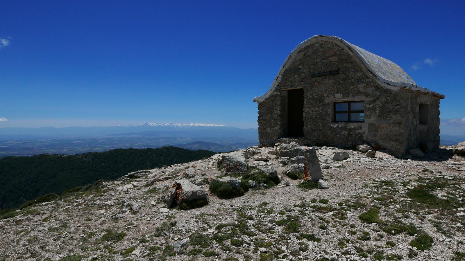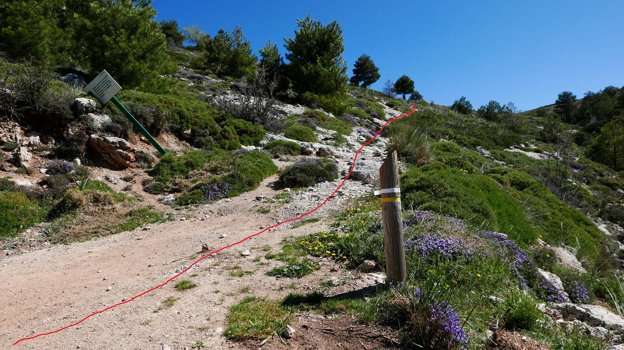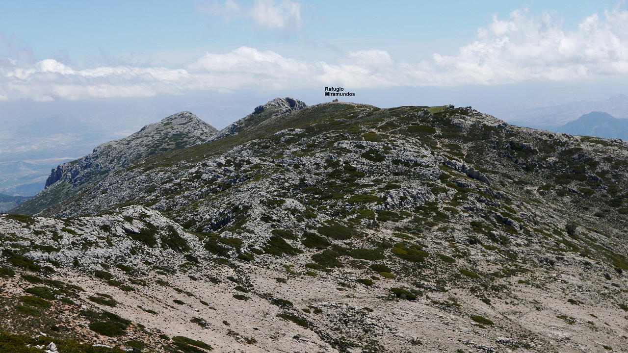 Los carteles me indican que al refugio Miramundos hay 2.4km, así que decido tomar esta ruta y realizar una circular que tampoco me va a alargar muchísimo el recorrido. Siempre por terreno pedregoso calizo pero no demasiado incómodo y con senda reconocible, alcanzo el pequeño refugio Miramundos (2077m 2h06′), bien acondicionado en el interior (rehabilitado, pues había visto en un post de 2010 que había un cartel que ponía peligor de derrumbe). Regreso por el mismo camino hasta el punto en que debo desviarme a la izquierda con un cartel que me indica al collado del Puerto (2060m). Este desvío me lleva a confluir con el camino de subida (1830m), pasando junto a una zona vallada de protección y estudio de la vegetación, y llegar al collado del Puerto desde donde, ya por senda conocida, bajo al cortijo de la Tosquilla (1615m 3h10′)