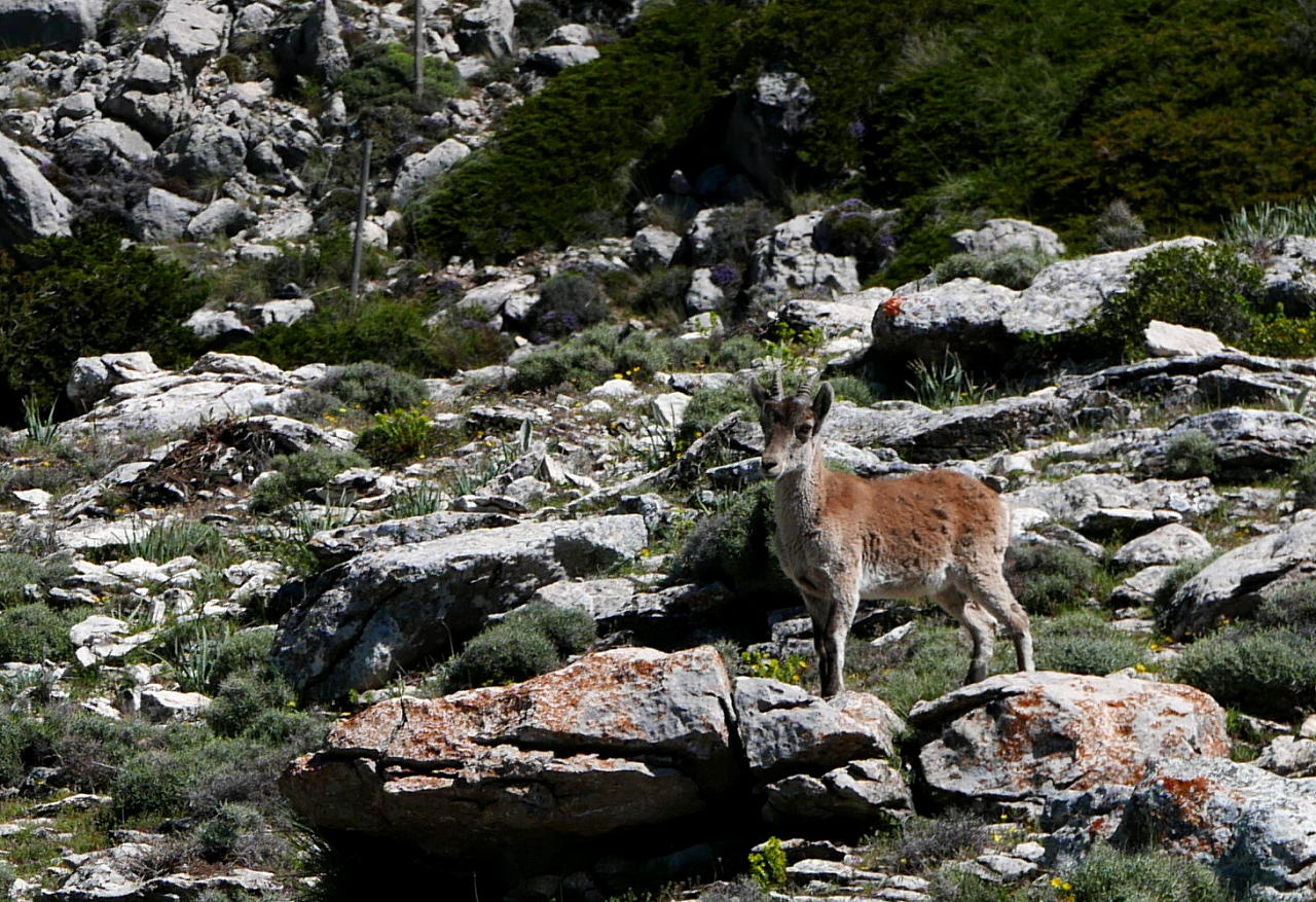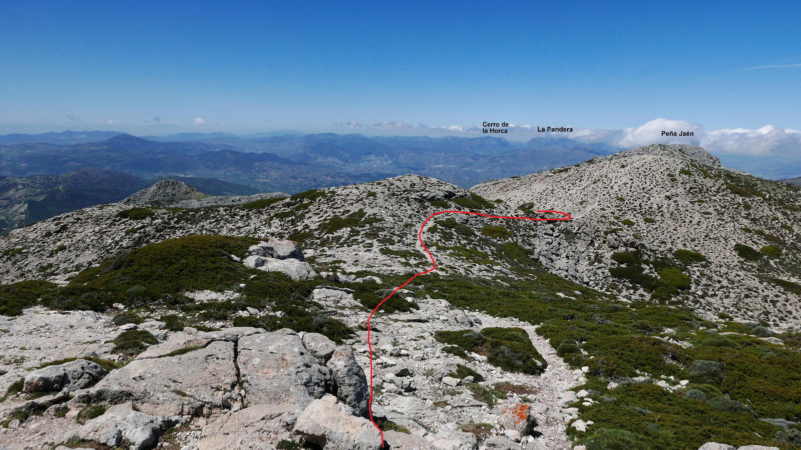 En el collado se gira a la izquierda (norte) hacia los agrestes y calizos picos de la sierra. Enseguida hay una bifurcación que sigo a la izquierda (1830m 0h31′) (a la derecha va hacia el refugio MIramundos y es por donde volveré). Tomo, por tanto, dirección oeste y voy faldeando el pico Mágina hasta girar a la derecha para ascender con más decisión. Las cabras monteses me acompañan y hay espléndidas vistas de Sierra Nevada al sur.