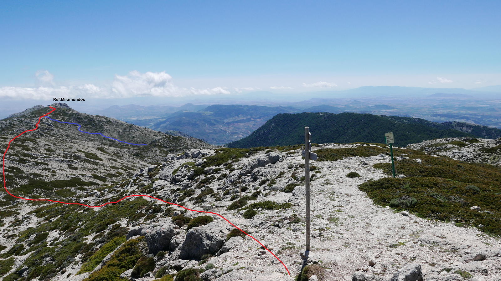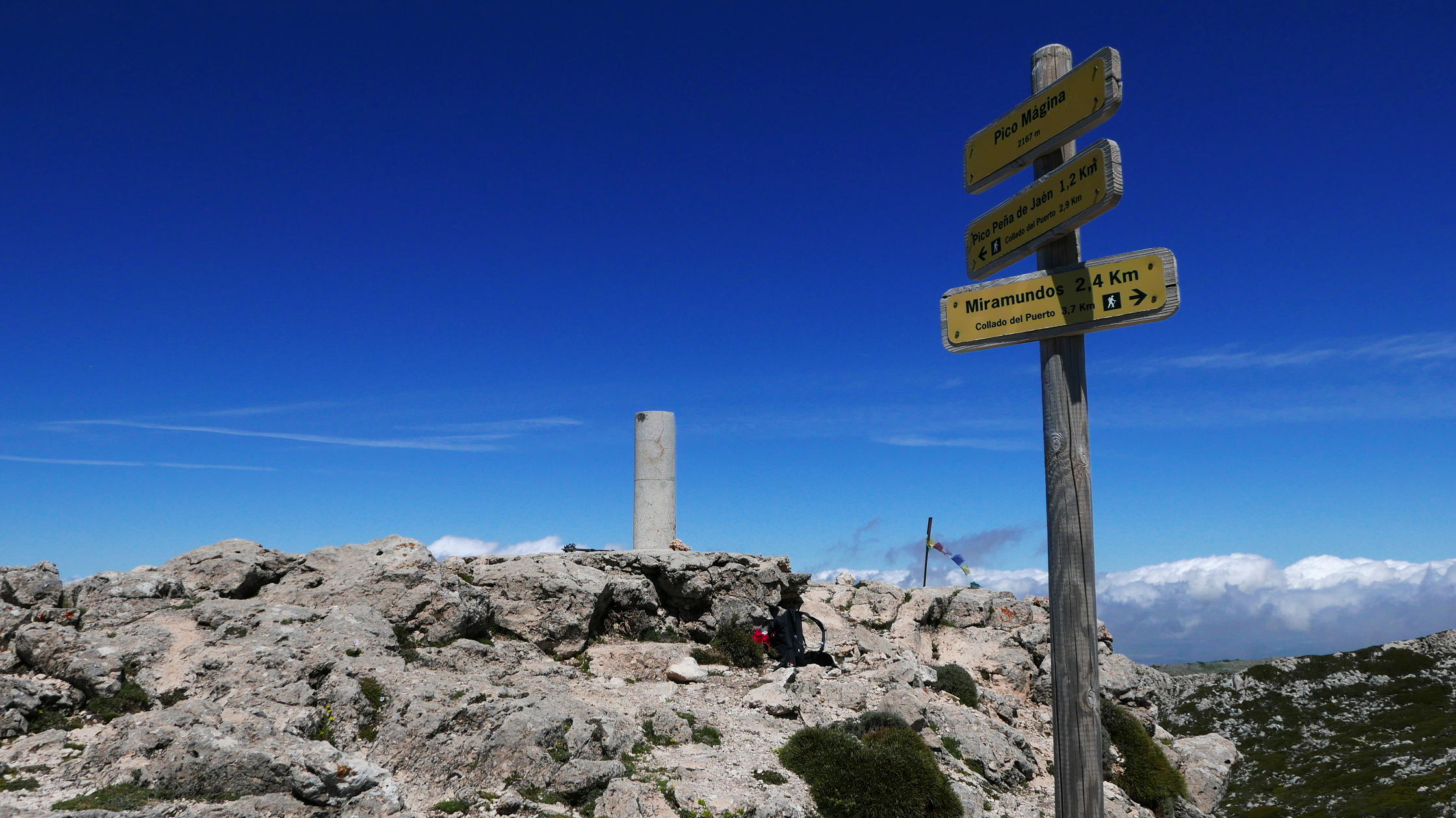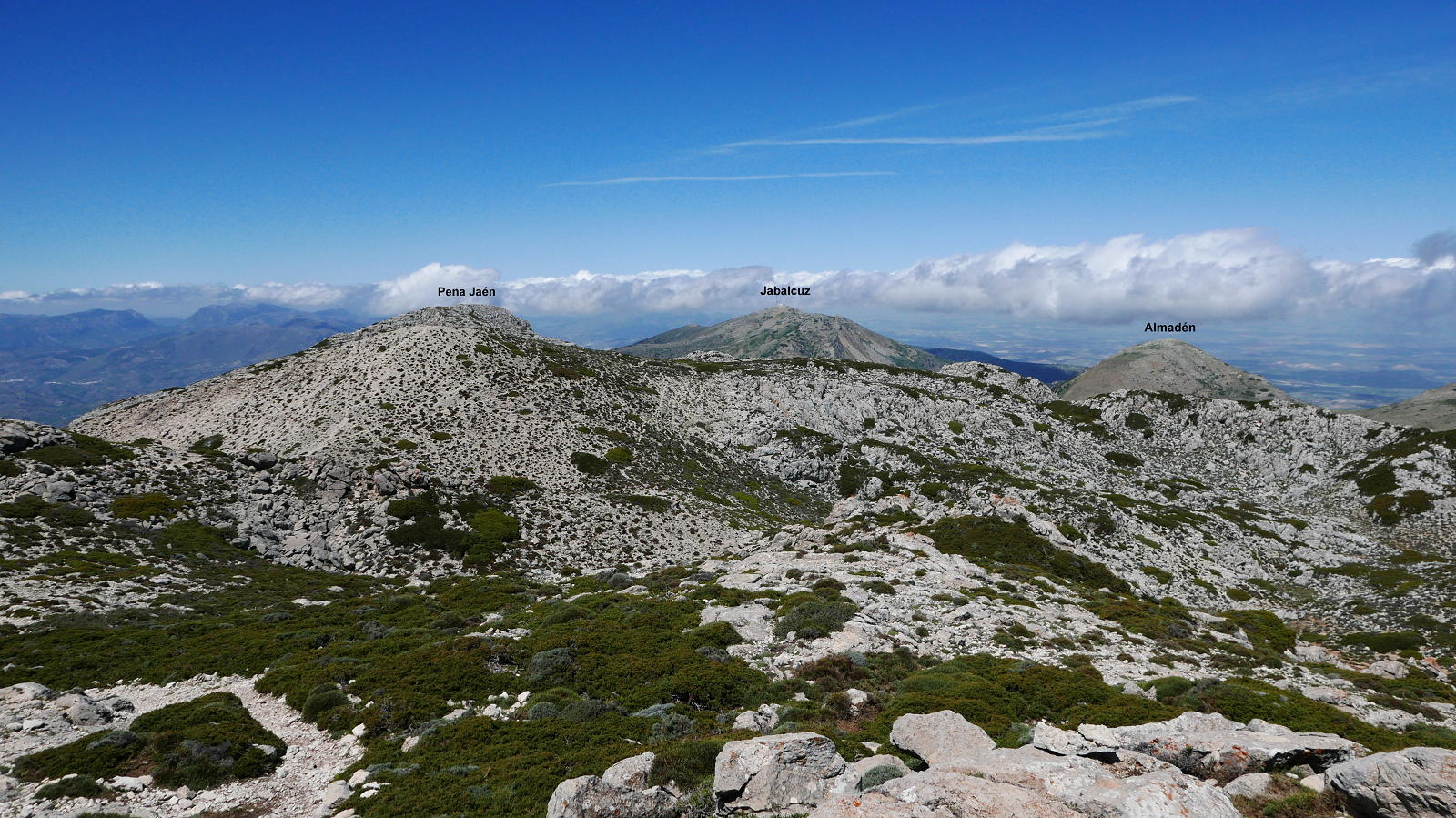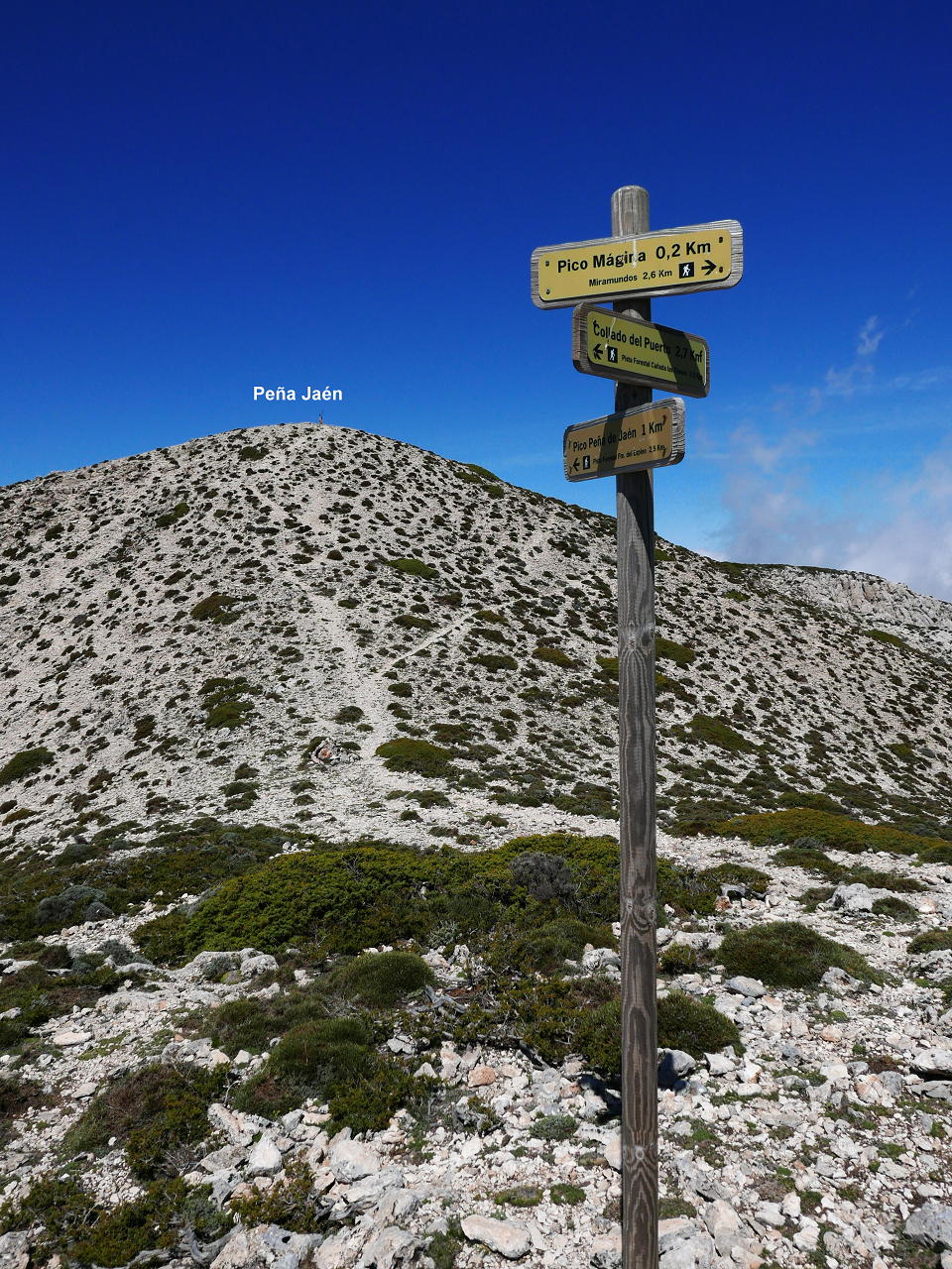 El primer día hago el viaje hasta la provincia de Jaén, subiendo su máxima altitud, el pico Mágina (el IGN da una altura de 2164 o 2165m, otros mapas 2165.14 y en wikipedia aparece como 2167m), que también ocupa el 18º puesto en prominencia de los picos de España. Escojo la ruta que comienza en el cortijo de la Tosquilla. Esta ruta se desarrolla siempre por senderos bien indicados (carteles, postes de PR e hitos). Aunque empiezo tarde, a las 11 de la mañana, es un recorrido relativamente corto, por lo que es ideal para realizarlo después del largo viaje en coche. Existen otras rutas más exigentes, como por ejemplo desde el puente del Gargantón, en el término de Belmez de la Moraleda, o por la pista que pasa por el castillo de Mata-Bejid (enlazo otros blogs que las describen). Tras la excursión me desplazaré hasta Trevélez, en la alpujarra granadina, donde estableceré mi «campo base» para todas las demás ascensiones.