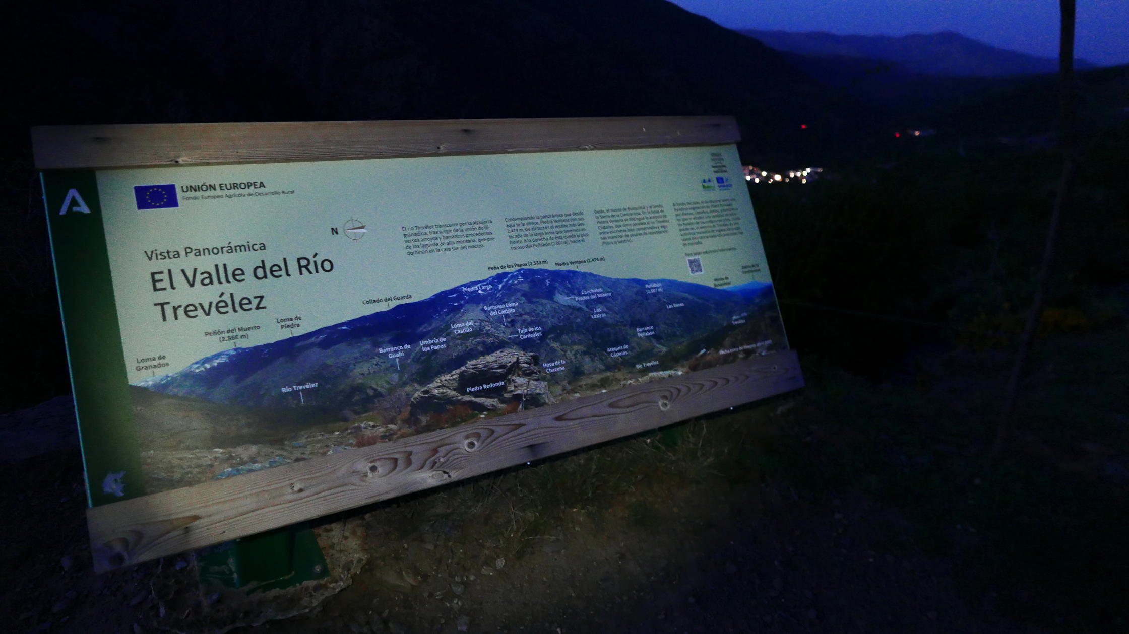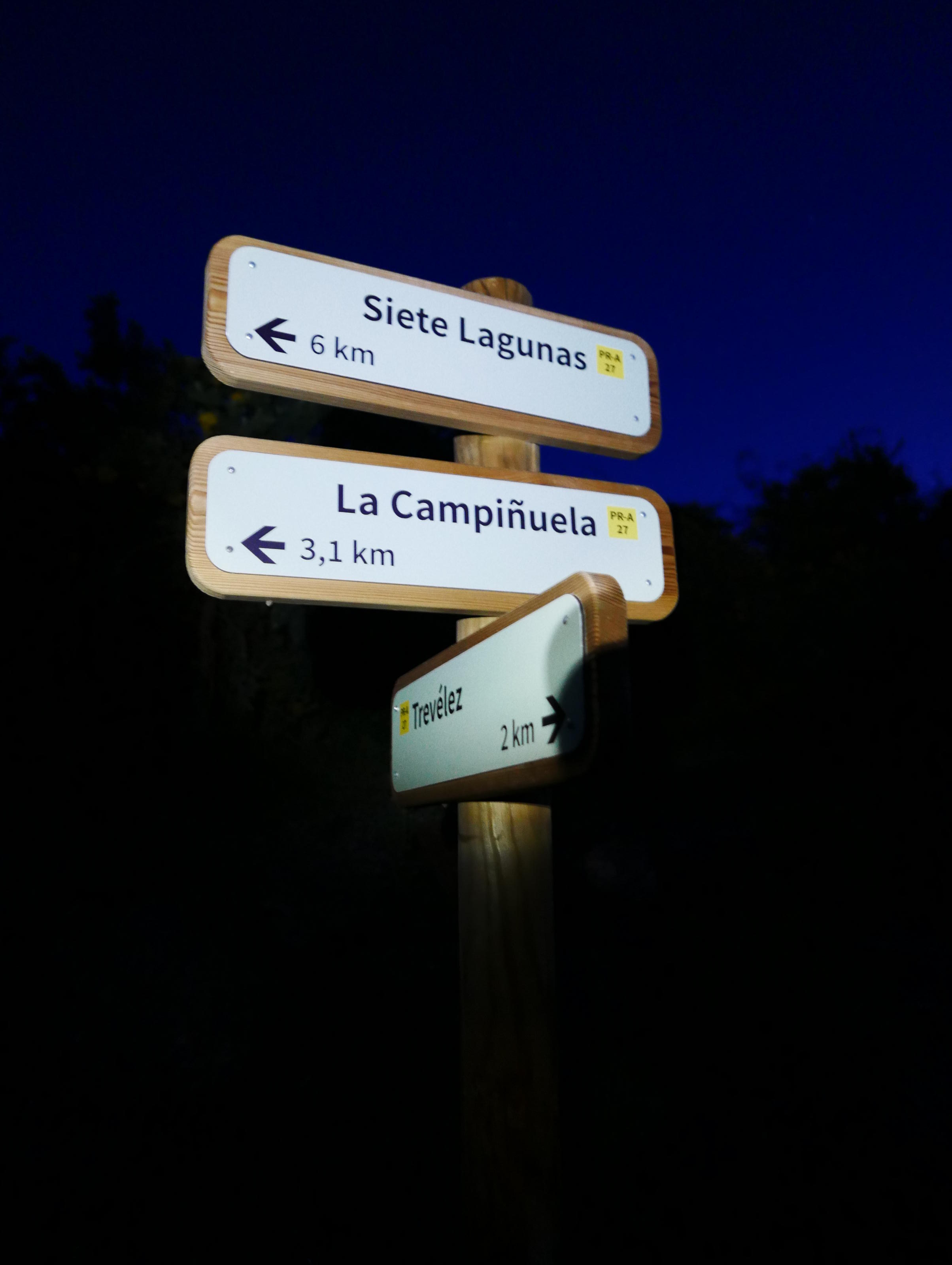 Descripción de la ruta: Trevélez (Barrio Alto) (1565m). Salgo a las 5:30, todavía de noche, alumbrándome con el frontal. Junto al Ayuntamiento hay un cartel que indica la ruta «7 Lagunas-Mulhacén». Subiendo por las callejuelas se sale del pueblo por un camino señalizado como PR-A-27. Es un buen camino que asciende suavemente y no presenta problemas avanzar con la única luz del frontal. Va pasando por campos y cortijos.