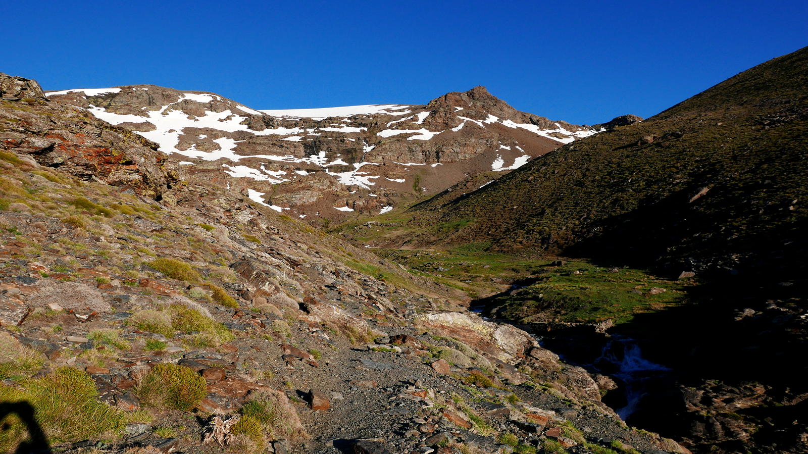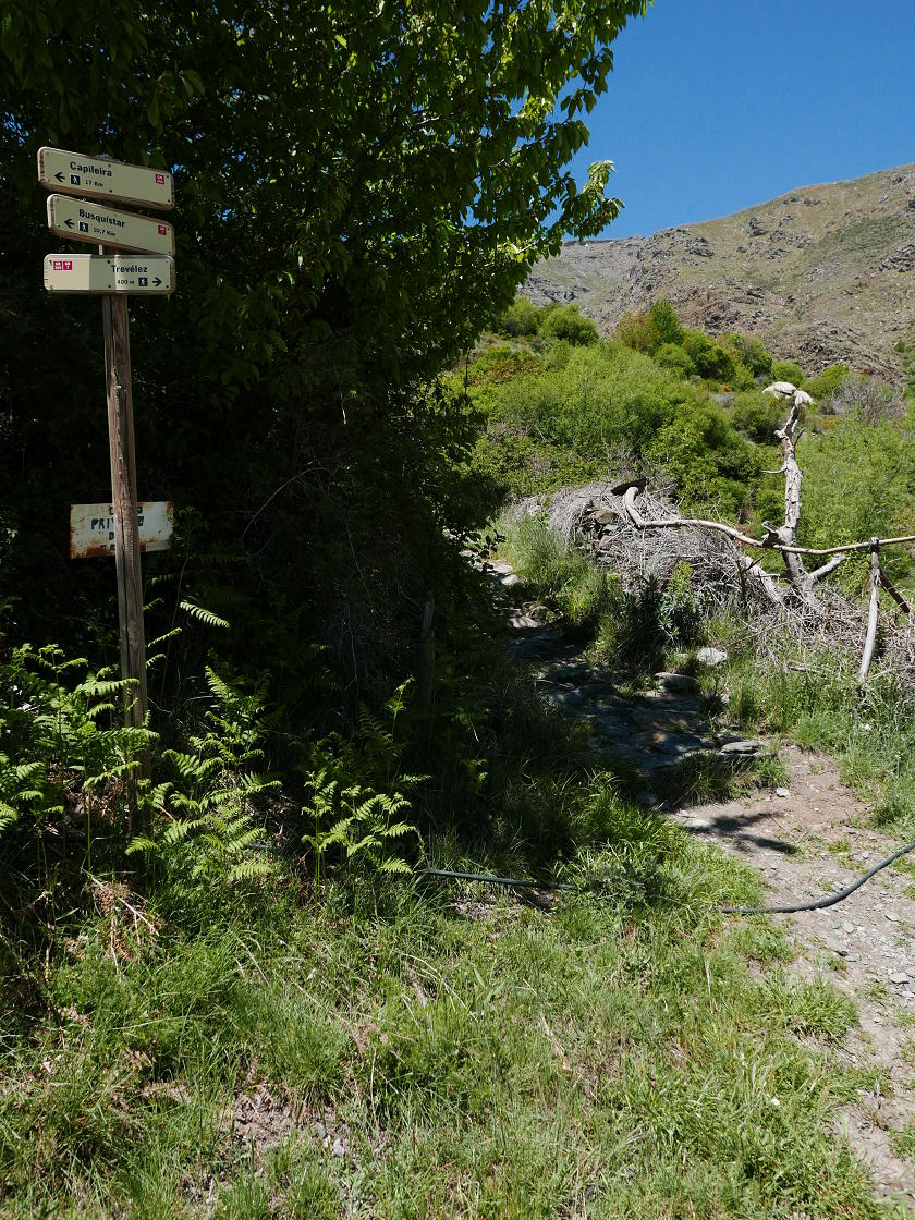 Acaba el camino más ancho y comienza el sendero (1780m 0h36′). Hay un giro a la izquierda (1830m 0h44′), cartel que indica «7 Lagunas» y «La Campiñuela», la pendiente se hace más fuerte. Se pasa por un mirador del valle de Trevélez (1895m 0h54′). El sendero gira a la derecha avanzando paralelo a la Acequia Gorda y la atraviesa (2054m 1h16′).