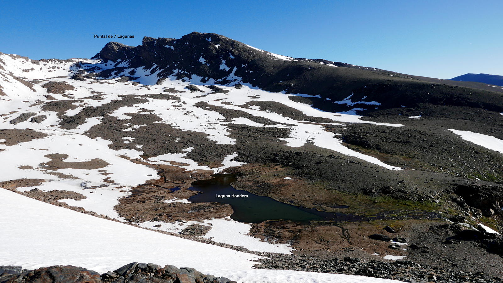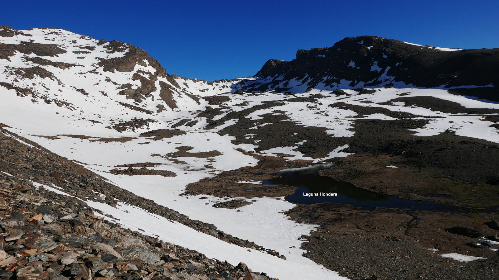 Voy ascendiendo suavemente paralelo a la Acequia de Mingo hasta entrar en el valle del río Culo de Perro y cruzarlo a la orilla izquierda por un puente de nieve (2590m 2h25′). El ascenso es ya por zona rocosa, empinándose en el último tramo que da acceso al circo donde descansa la Laguna Hondera (2895m 2h56′). Precioso enclave de alta montaña.