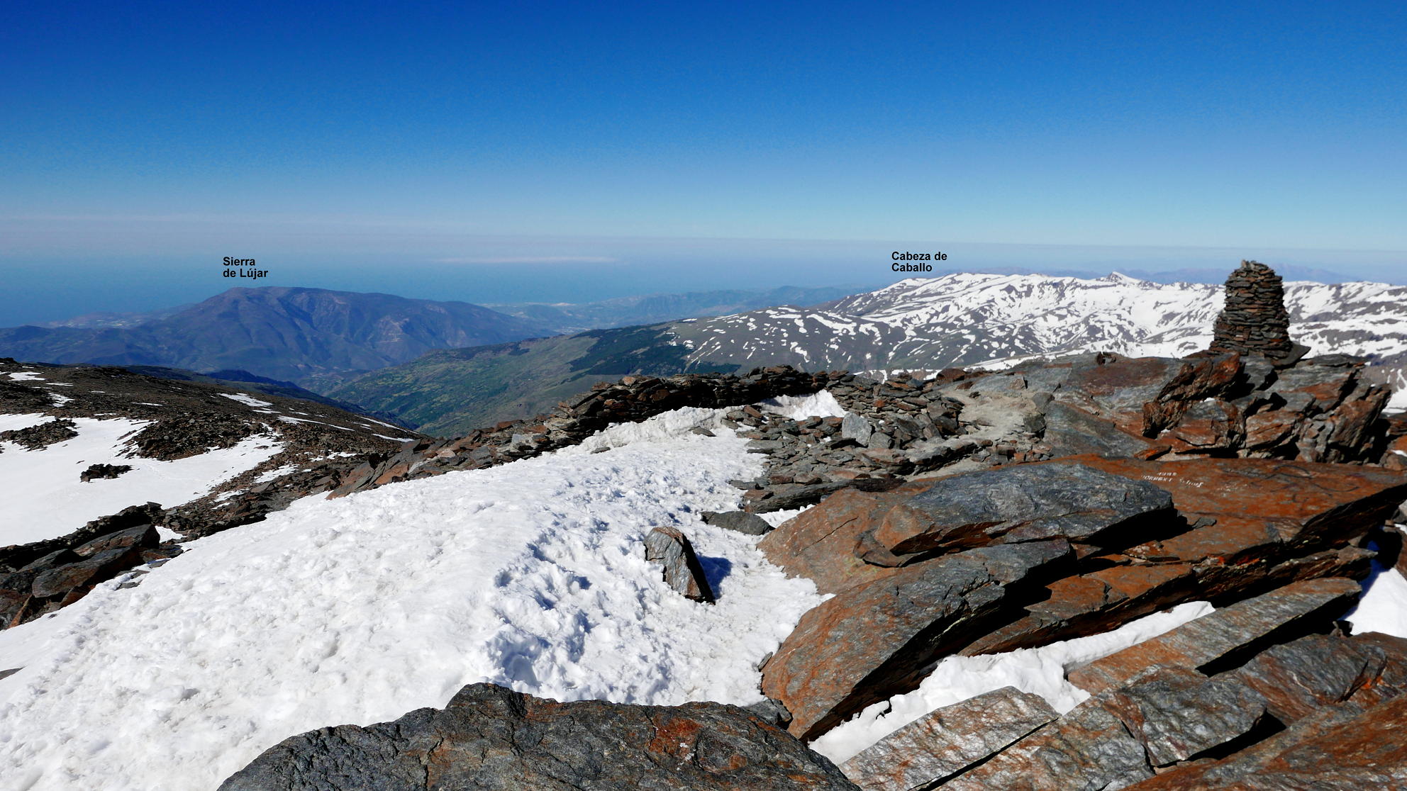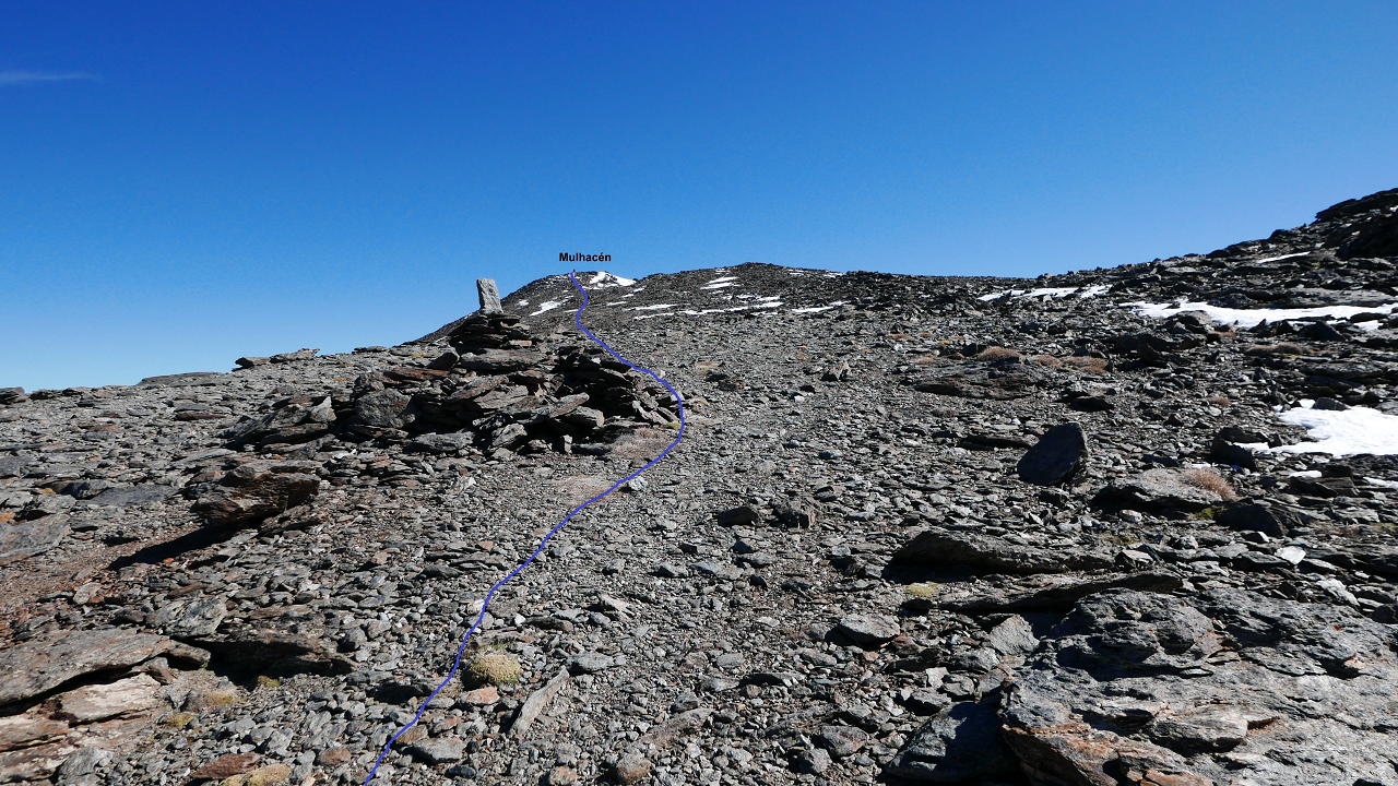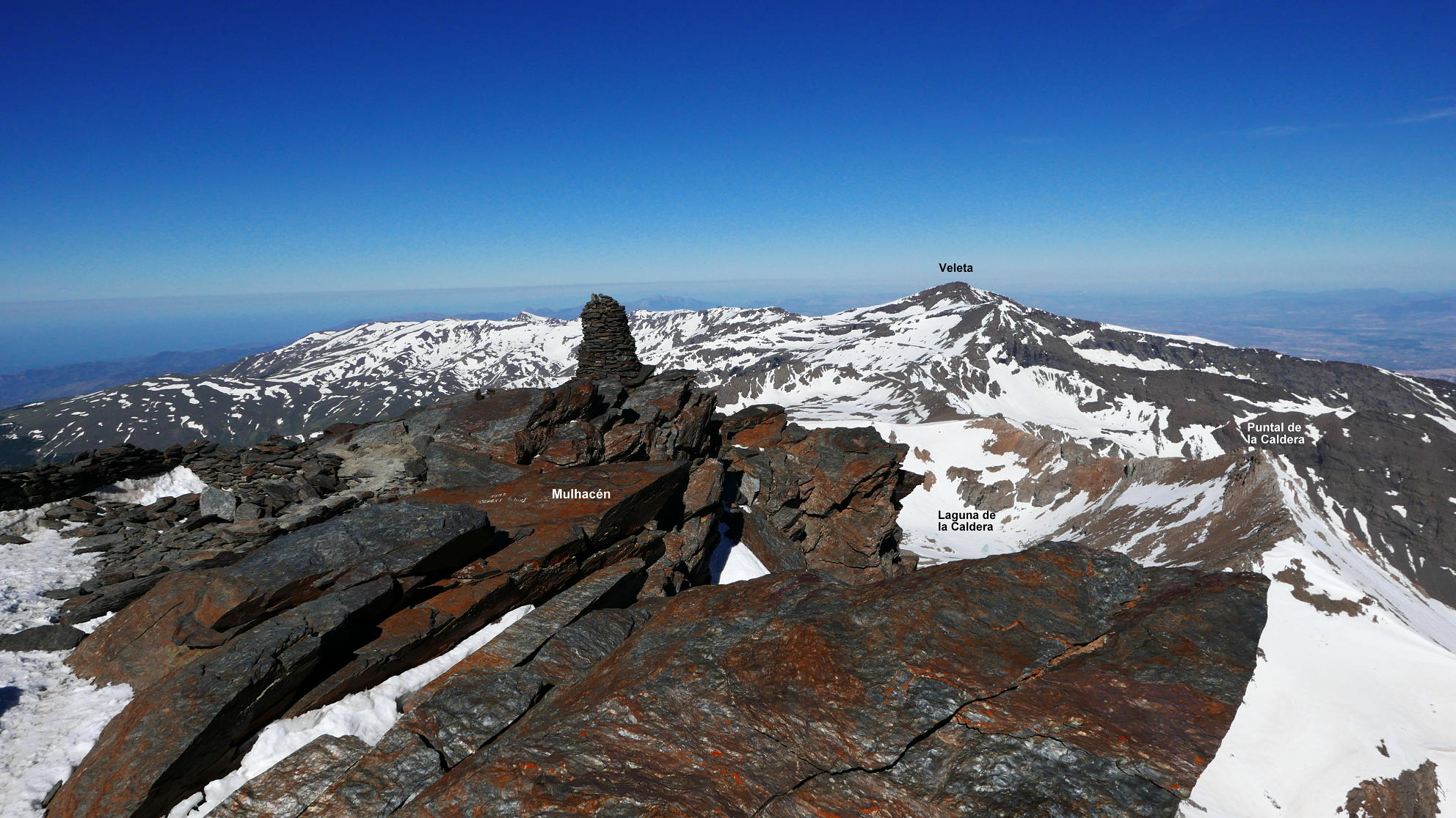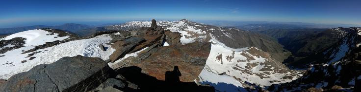 Satisfecho de poder estar en el punto más alto de la Península, observo con calma la magnífica panorámica a mi alrededor. Bajo el vértice geodésico hay una hornacina, que está llena de nieve en su interior, y unos metros más allá un gran hito. Me llama la atención la verticalidad de su cara norte, cayendo sobre la Hoya del Mulhacén donde descansa la laguna de la Mosca.