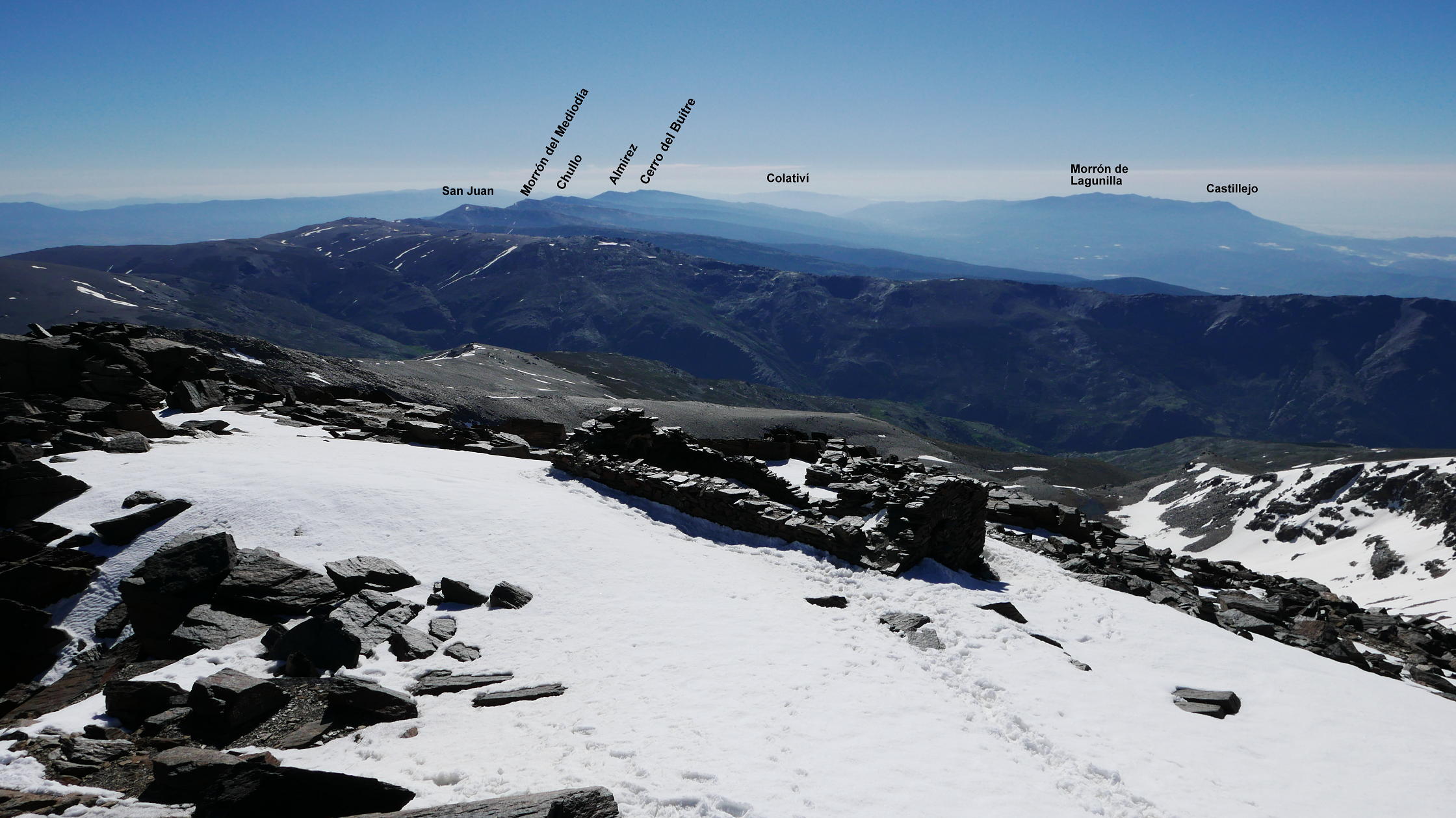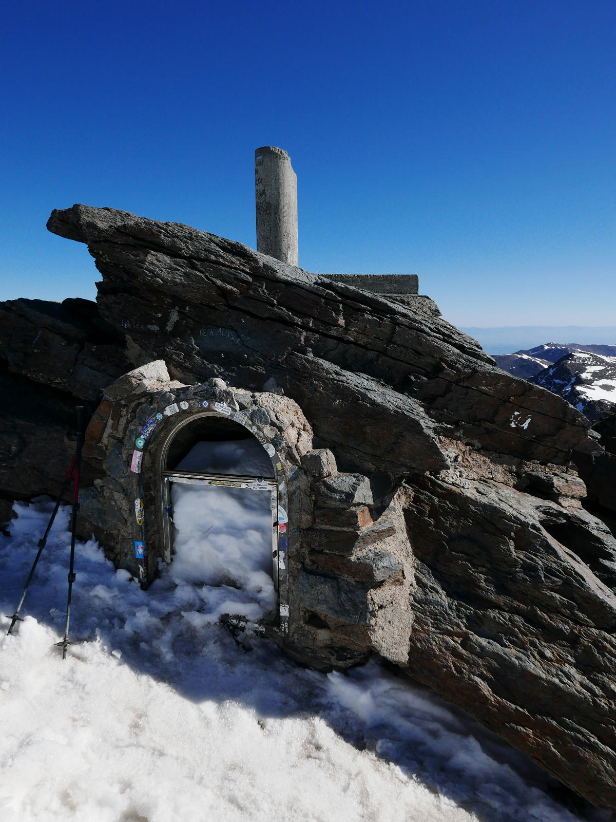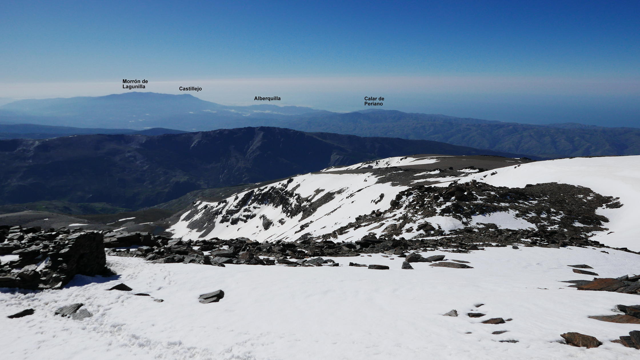 Satisfecho de poder estar en el punto más alto de la Península, observo con calma la magnífica panorámica a mi alrededor. Bajo el vértice geodésico hay una hornacina, que está llena de nieve en su interior, y unos metros más allá un gran hito. Me llama la atención la verticalidad de su cara norte, cayendo sobre la Hoya del Mulhacén donde descansa la laguna de la Mosca.