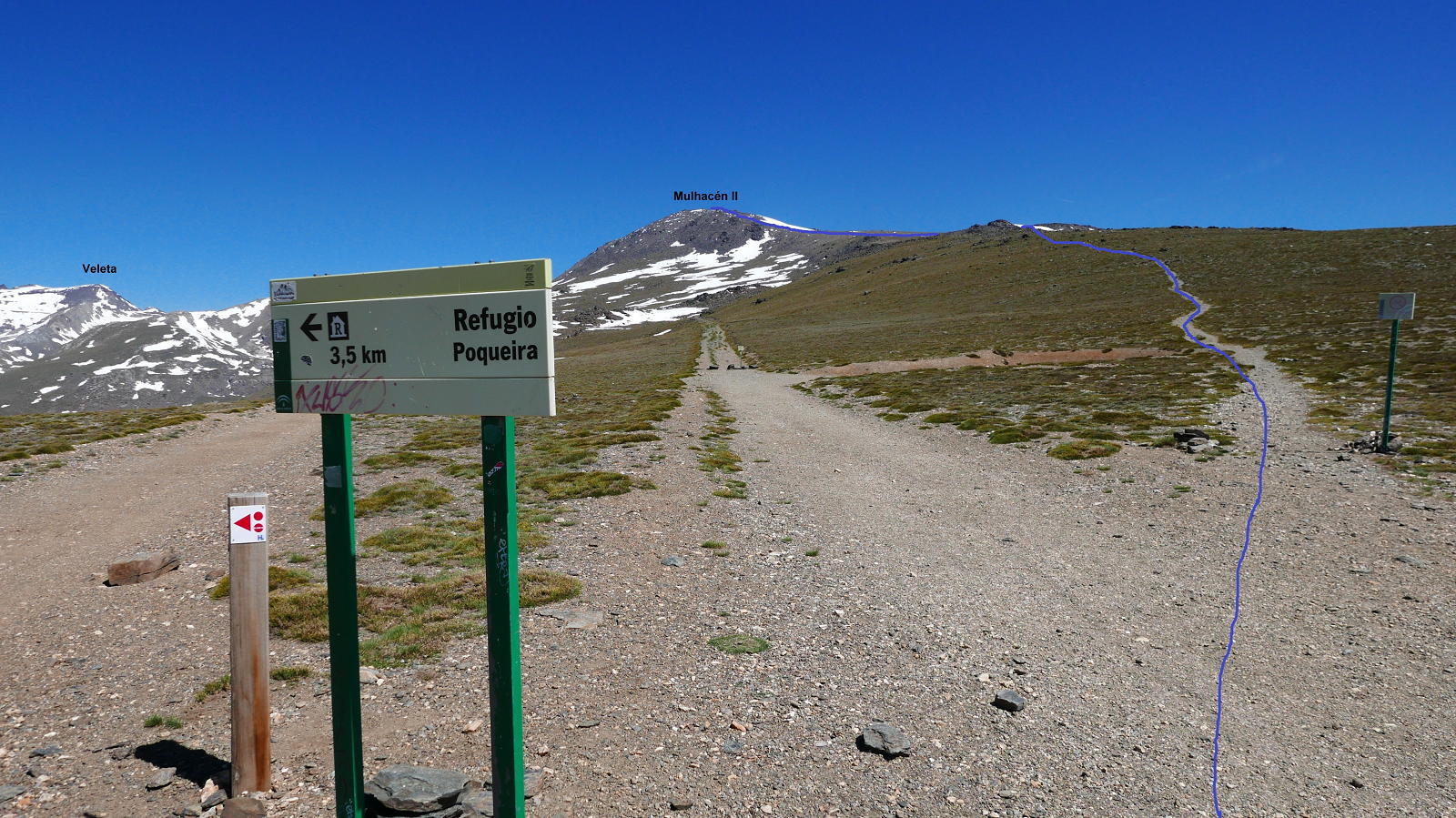 Tras 40 minutos en la cima (hay una brisa bastante fresquita que me obliga a abrigarme, incluso a ponerme las manoplas), inicio el descenso por el lomo sur. Un buen camino con grandes hitos a los lados se abre paso entre el terreno pedregoso hasta el Mulhacén II (3362m 5h06′). En el Mulhacén II hay un vértice geodésico, pero en realidad es un hombro del lomo sur, no es un pico. Sigo el lomo, cada vez más amplio. Un poco más abajo almuerzo junto a unas losas que hacen de vivac (3060m 5h35′) con la compañía de un gran macho de cabra montés. Enseguida tomo el amplio camino (3005m 6h03′) que baja suavemente a un cruce pistas en el collado del Alto del Chorrillo (2705m 6h29′) (a este punto se puede acceder desde Capileira con autobuses del Parque). Siguiendo la pista principal rodeo el Alto del Chorrillo y dejo la pista para tomar a la izquierda un sendero señalizado con verde y blanco ((2690m 6h34′).