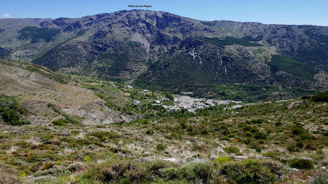 Desciende con fuerte pendiente, balizado con postes e hitos; hay algunos neveros al principio. La pendiente no va a suavizar en todo el rato y ya se va viendo Trevélez al fondo del valle. Paso por el Corral del Chorrillo (2245m 7h13′) con una era de trillo empedrada. Atravieso la acequia Alta (1855m 7h45′) y luego una pista (1825m 7h49′) que viene de Pórtugos y de Capileira. Me hago un poco de lío para atravesar la pista que llega a las chozas del Chorrillo para seguir el sendero. Atravieso la acequia de Enmedio y desemboco en la curva de una pista (1665m 8h02′) que tengo que dejar a mi derecha y seguir recto hacia abajo.