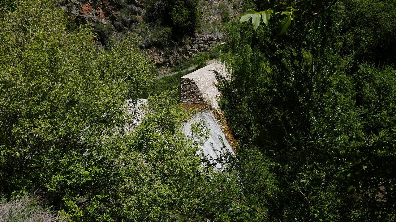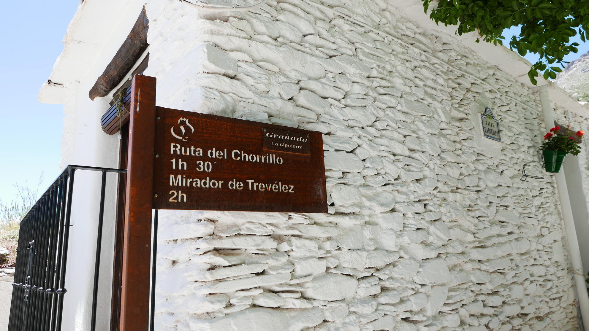 Siguiendo el sendero alcanzo el GR-7 (1600m 8h11′) con cartel que indica «Trevélez 400m». Este camino me lleva a la acequia de la Cuna, que se atraviesa sobre un salto de agua, y a la entrada al pueblo de Trevélez (1565m 8h17′) por el Barrio Alto (cartel que indica «Ruta del Chorrillo» y «Mirador de Trevélez»). Las pintorescas callejas me conducen a la Casa el Mirador donde me alojo.